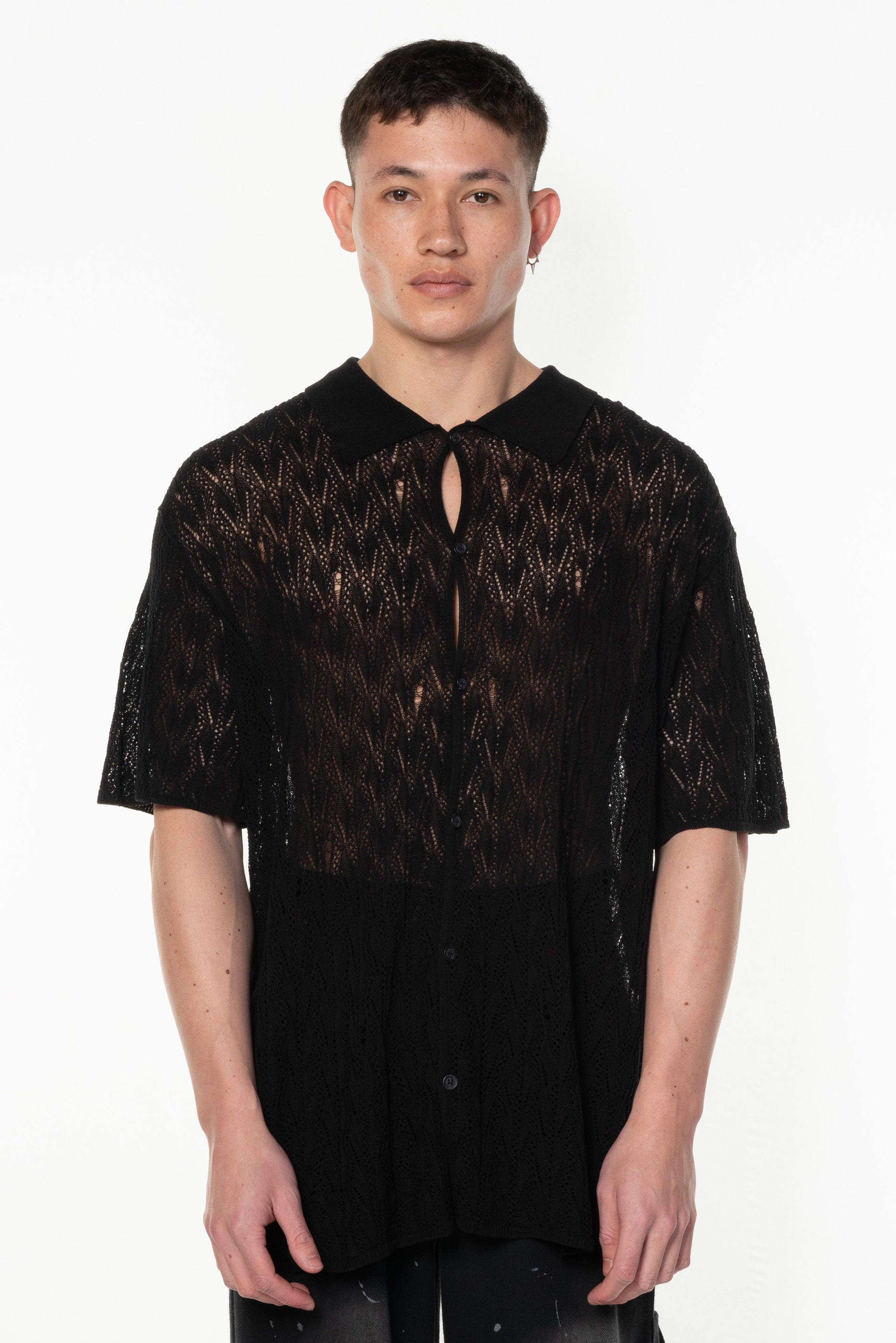 Professor. E Knit Shirt Black. Knitted polo shirt in black. Short sleeves. Button closure at front. Regular polo collar. Lace knit details throughout. Boxy fit. Leather detailing at back.