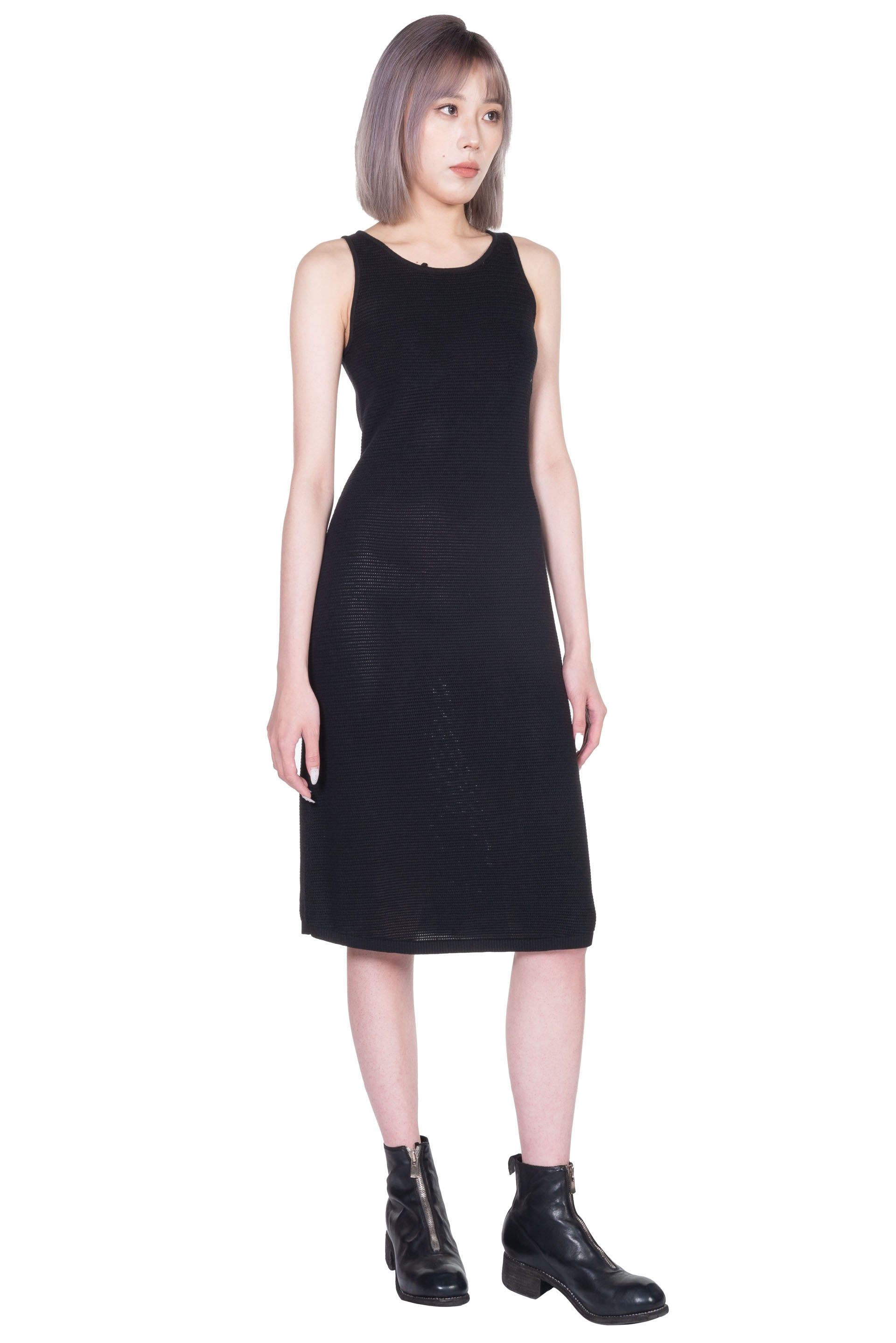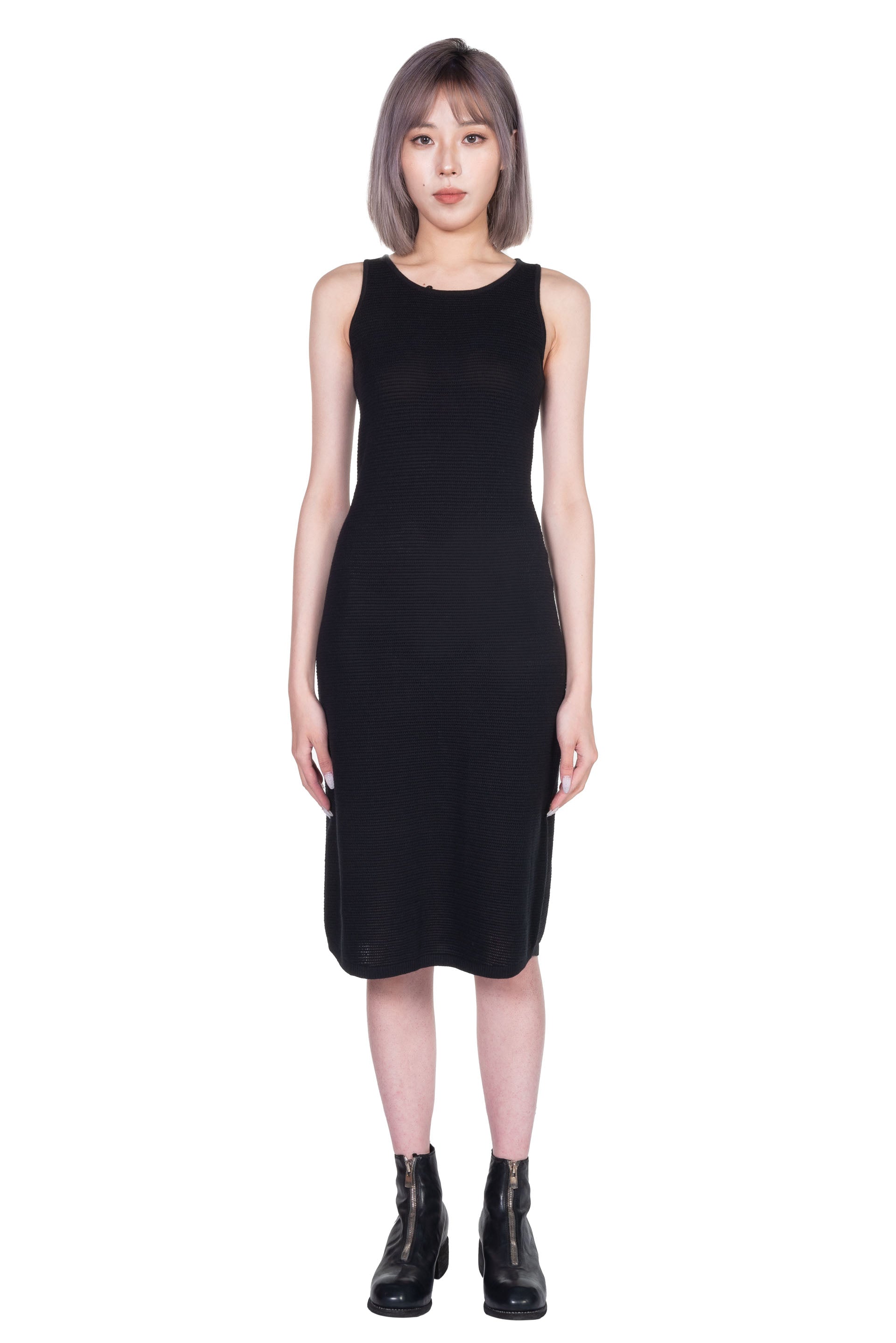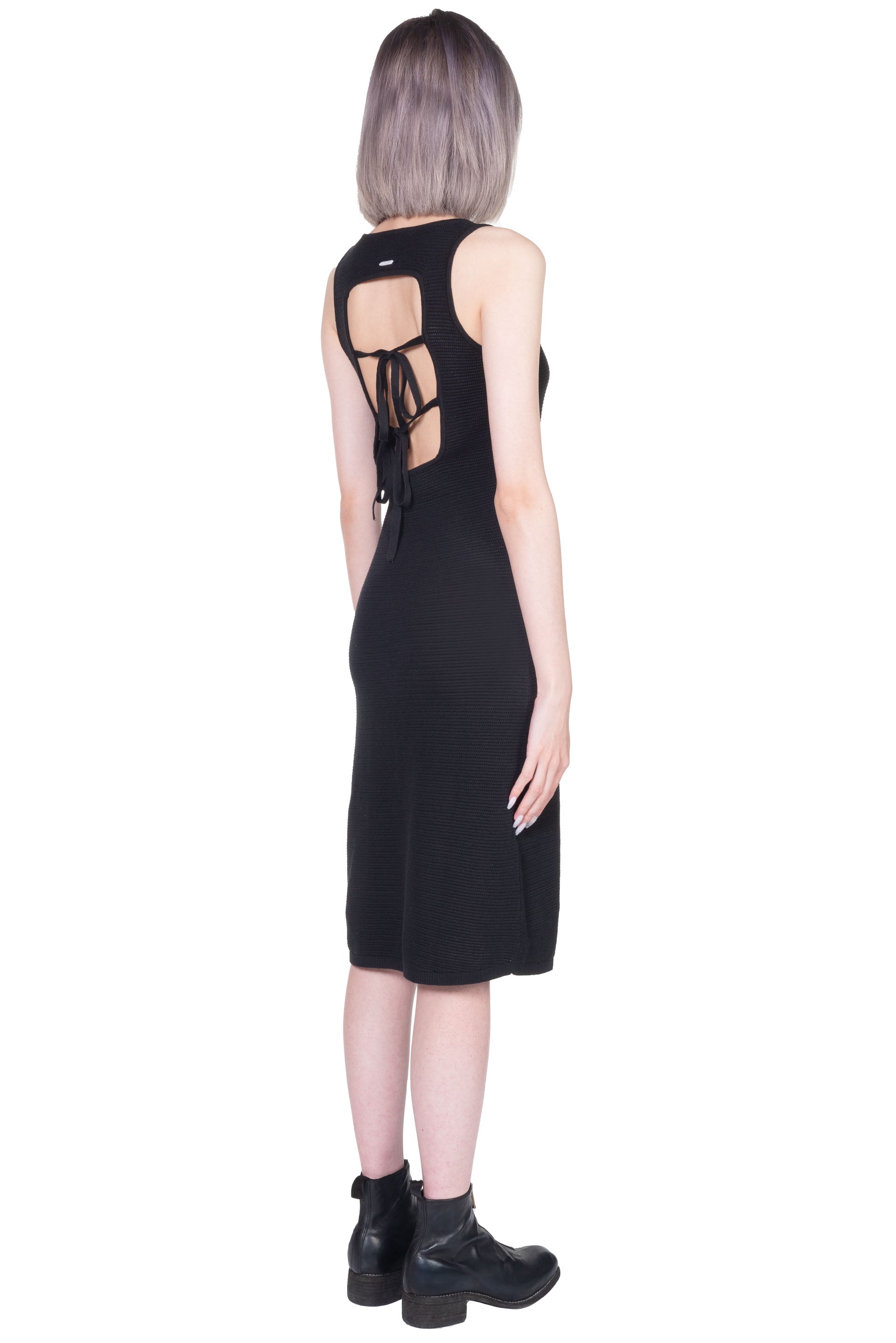 Black Lace Knit Dress.Slim fit. Sleeveless. Hollow back with back ties. Round neck. Back logo detail. Stretchable fabric.