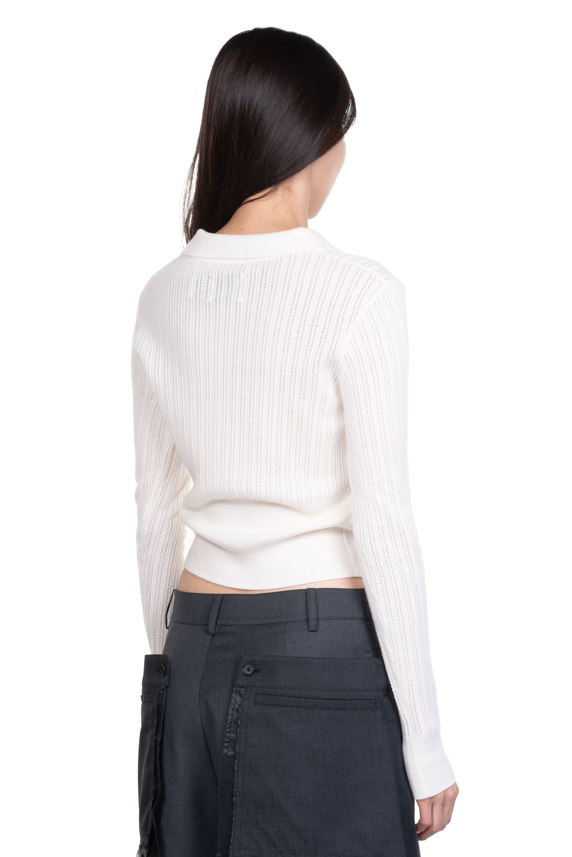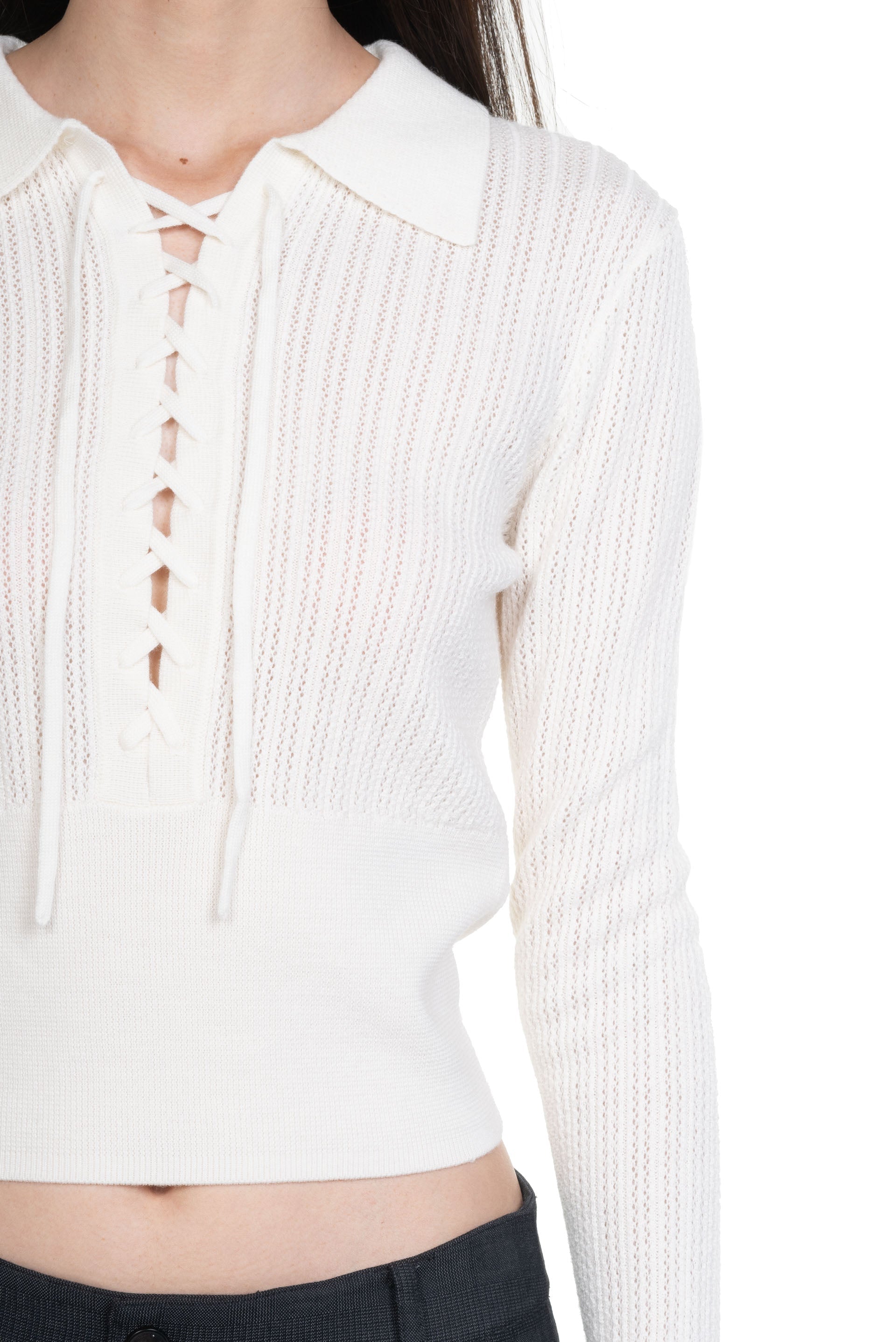 Long sleeve. Open collar. Henley style top with lace up closure. Cropped fit. Soft wool knitted fabric.