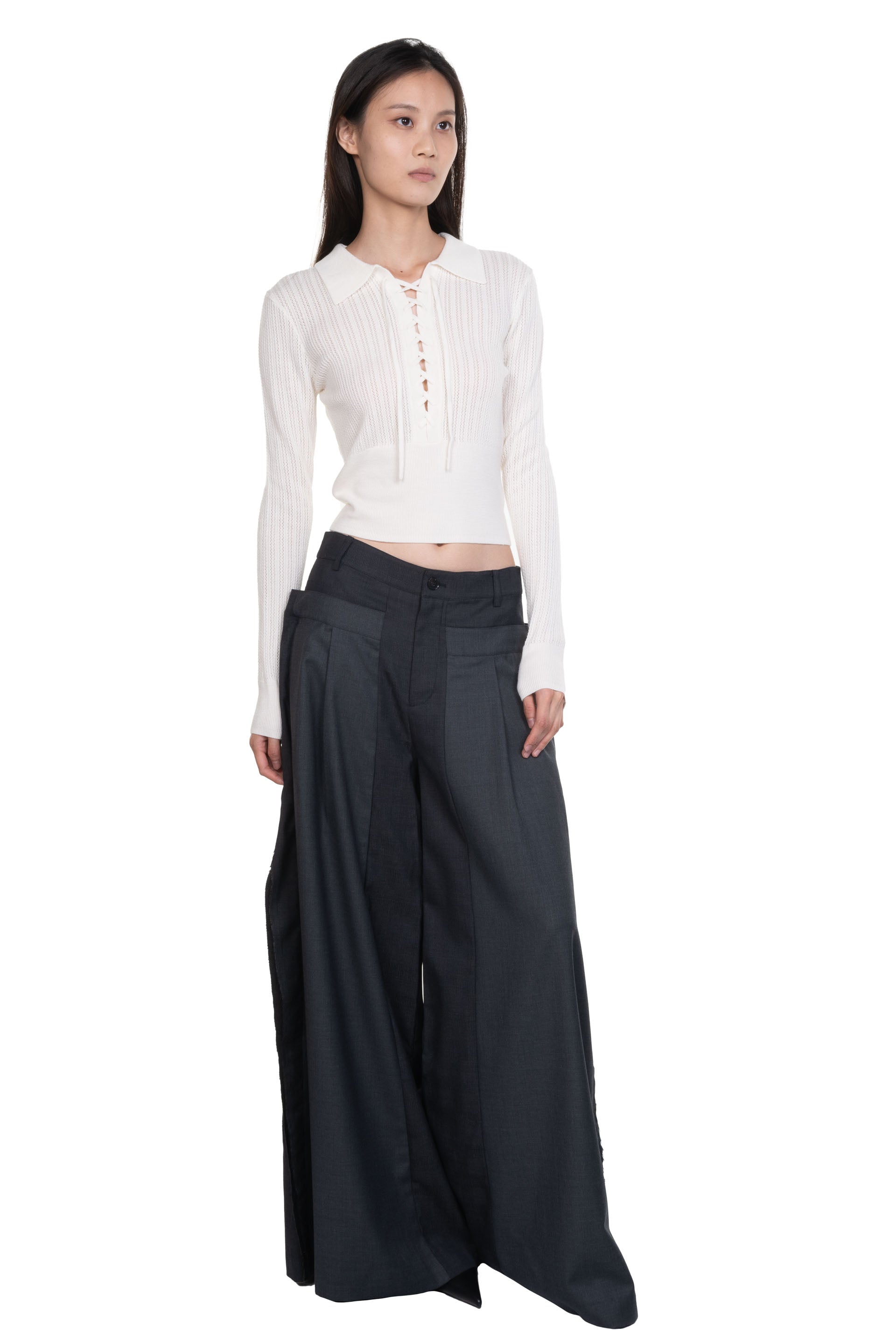 Feng Chen Wang aesthetic is authentic, emotional and multidimensional, drawing on personal life experiences and her Chinese heritage to create products that are functional but at the same time conceptual as seen with the Lace-Up Henley Top.