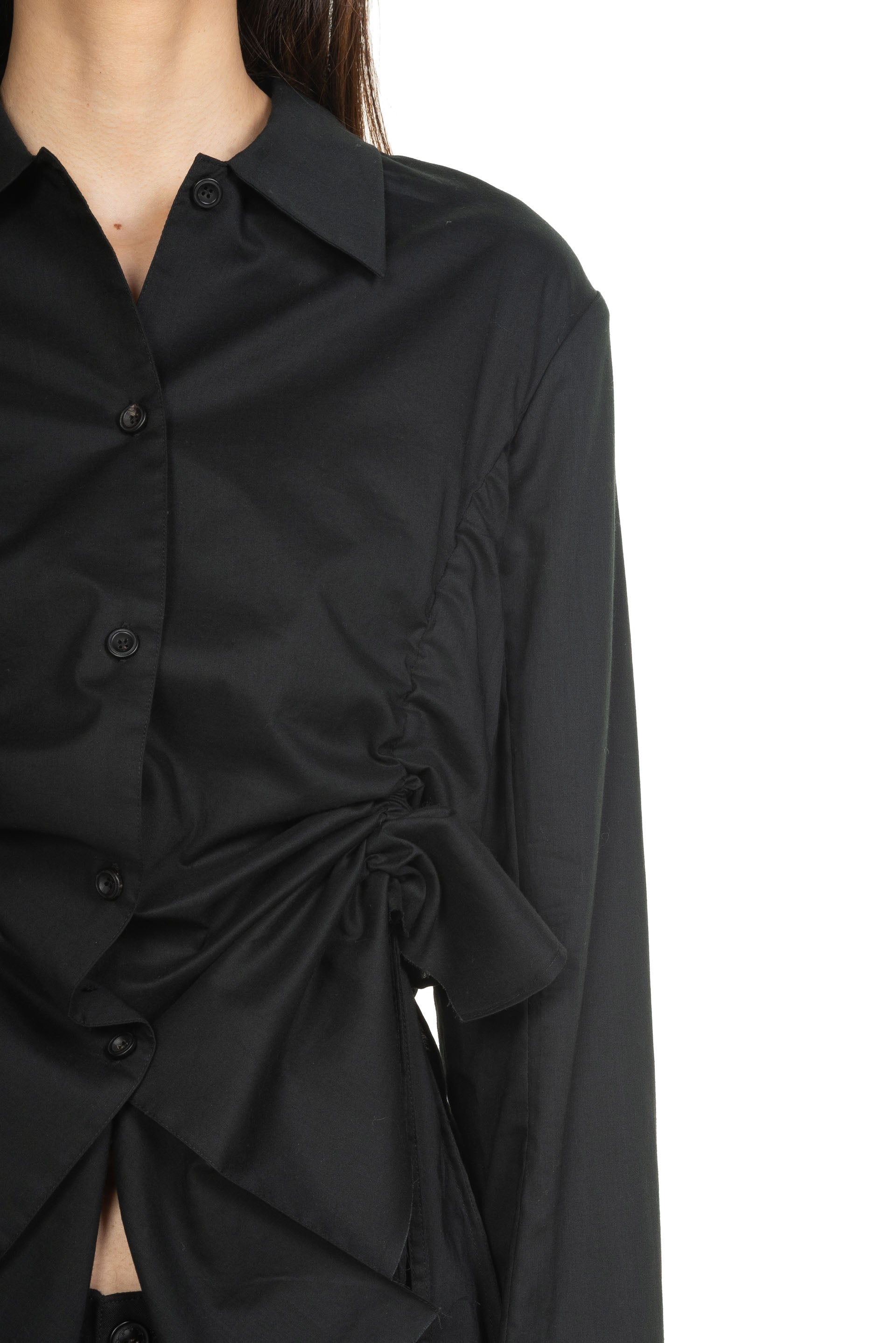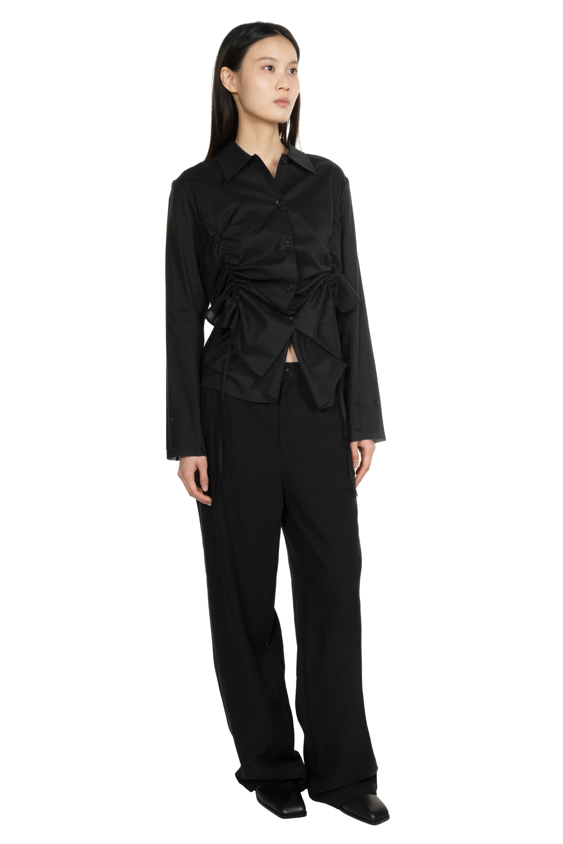 Professor e Layered Shirt in Black. Long sleeves. Button closure at front. Drawstring details at side for styling.