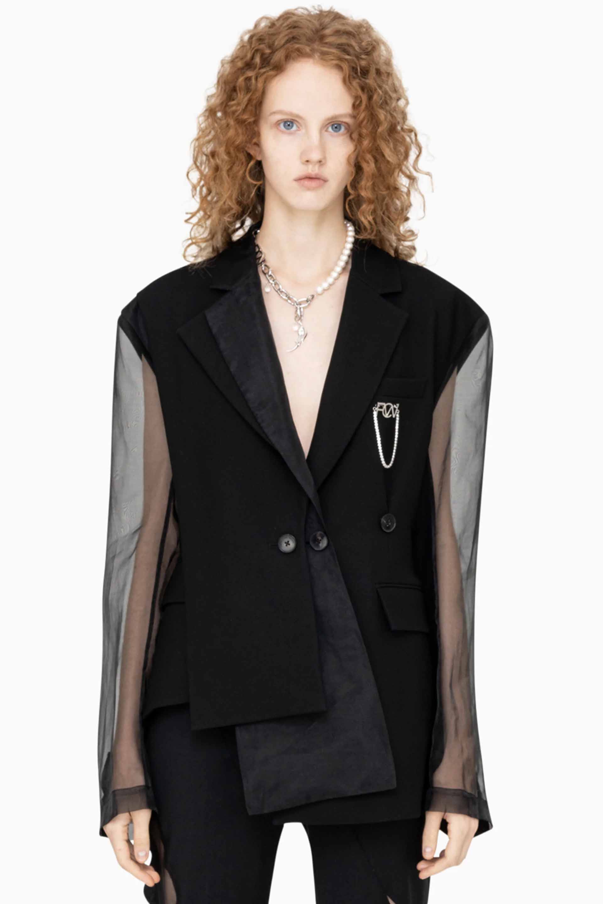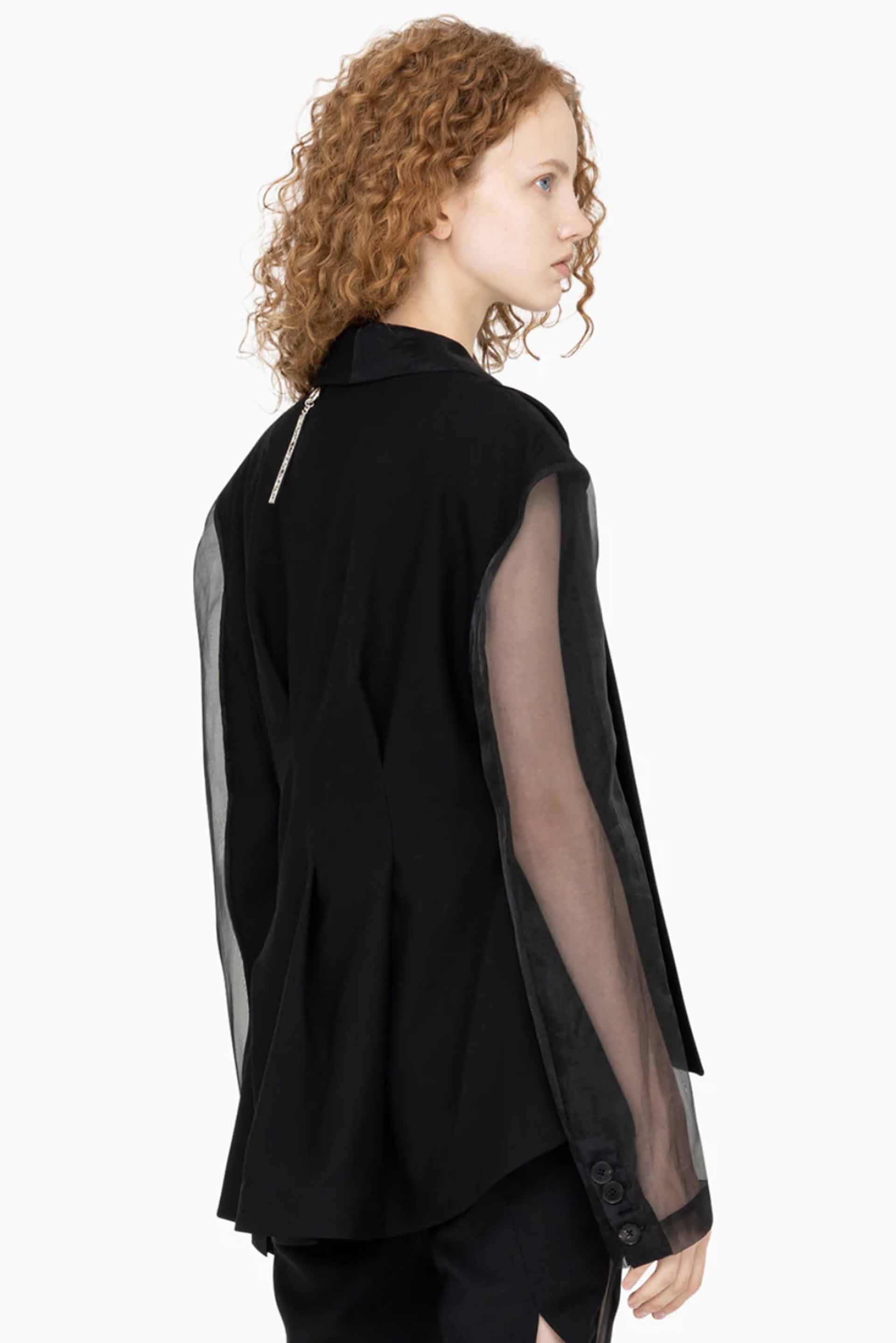 Deconstructed layered jacket. Made of black sheer with pleats to the front. Asymmetrical hem. Structured shoulders. Overlapping lapels and flap pockets to the front. Back pleats.