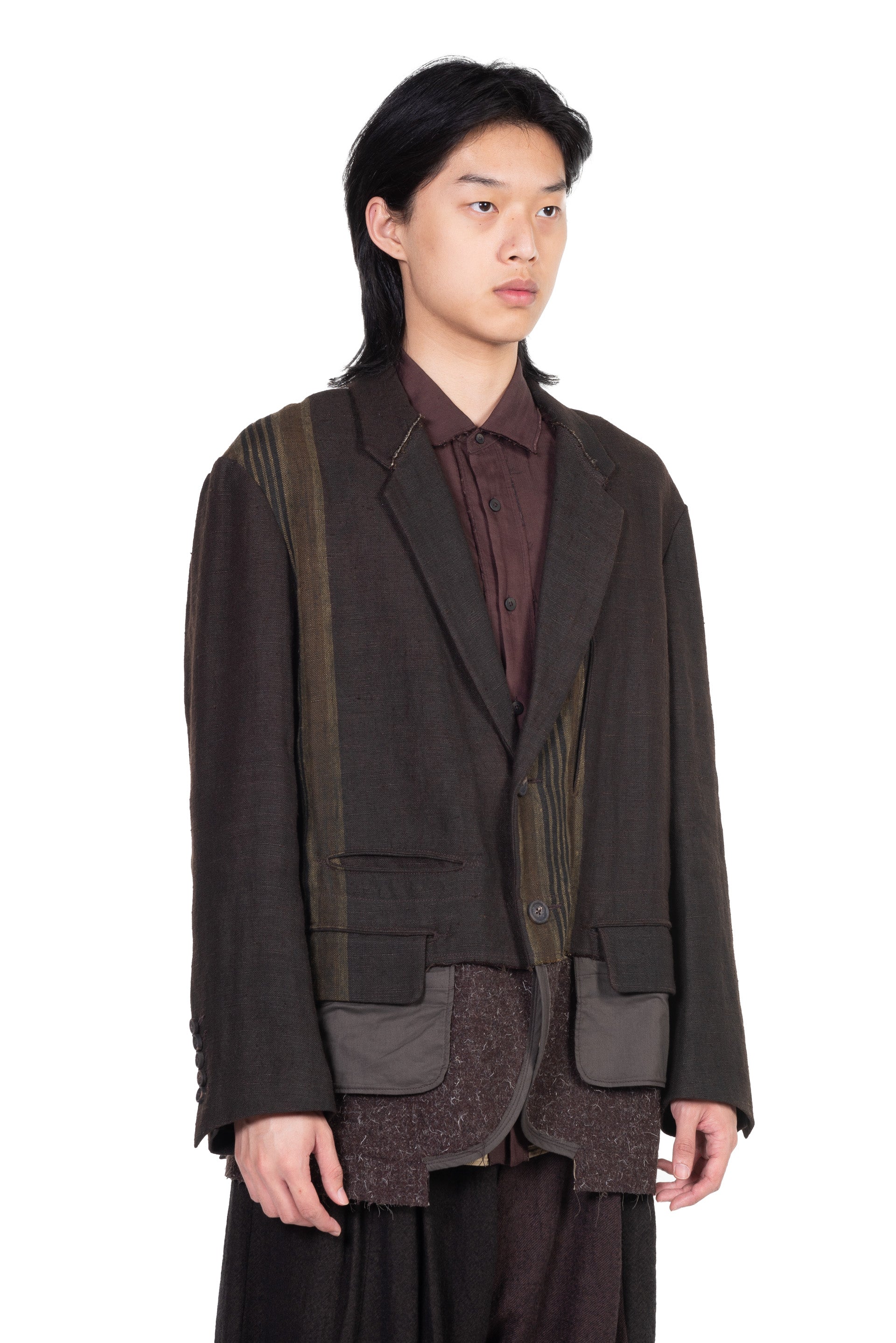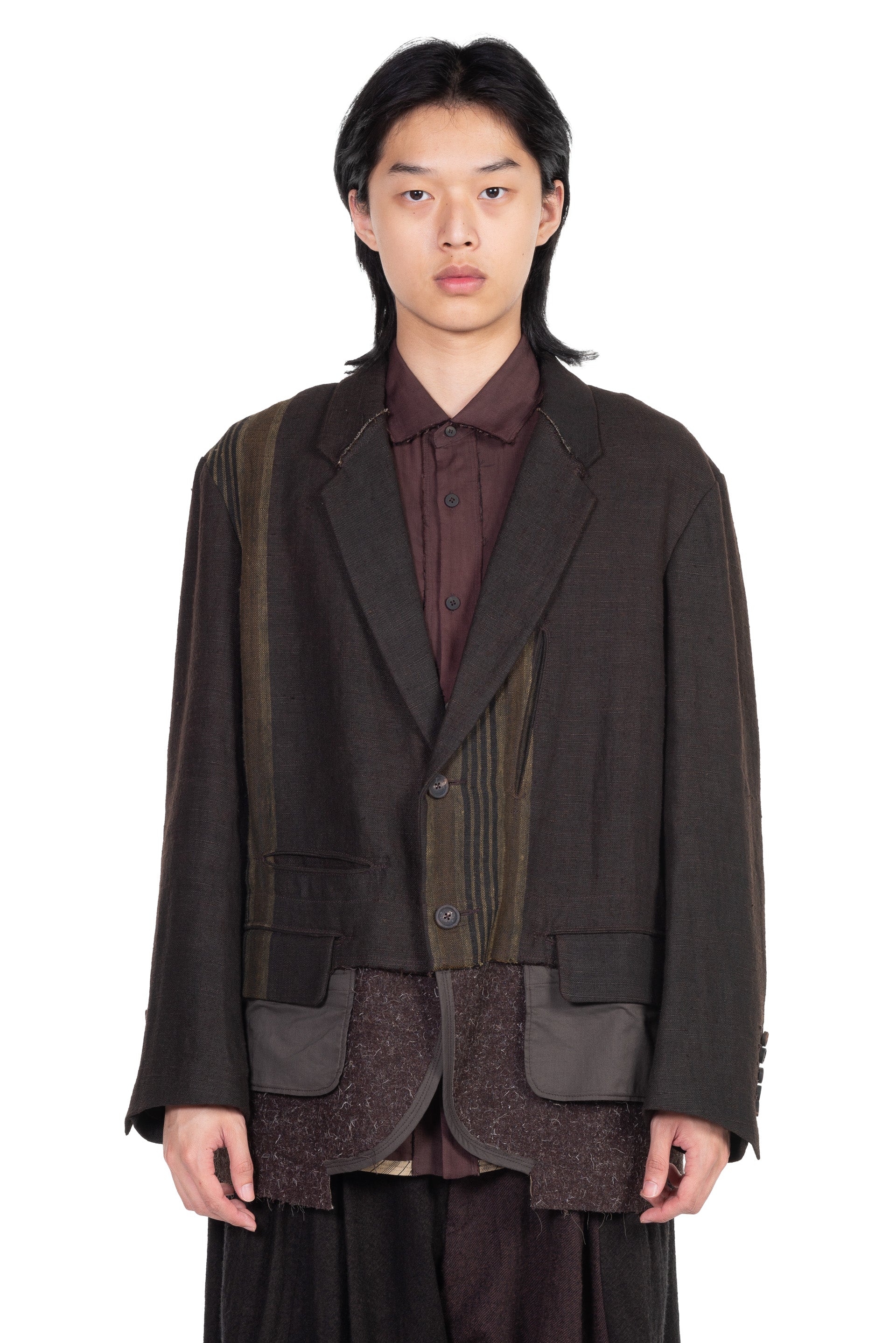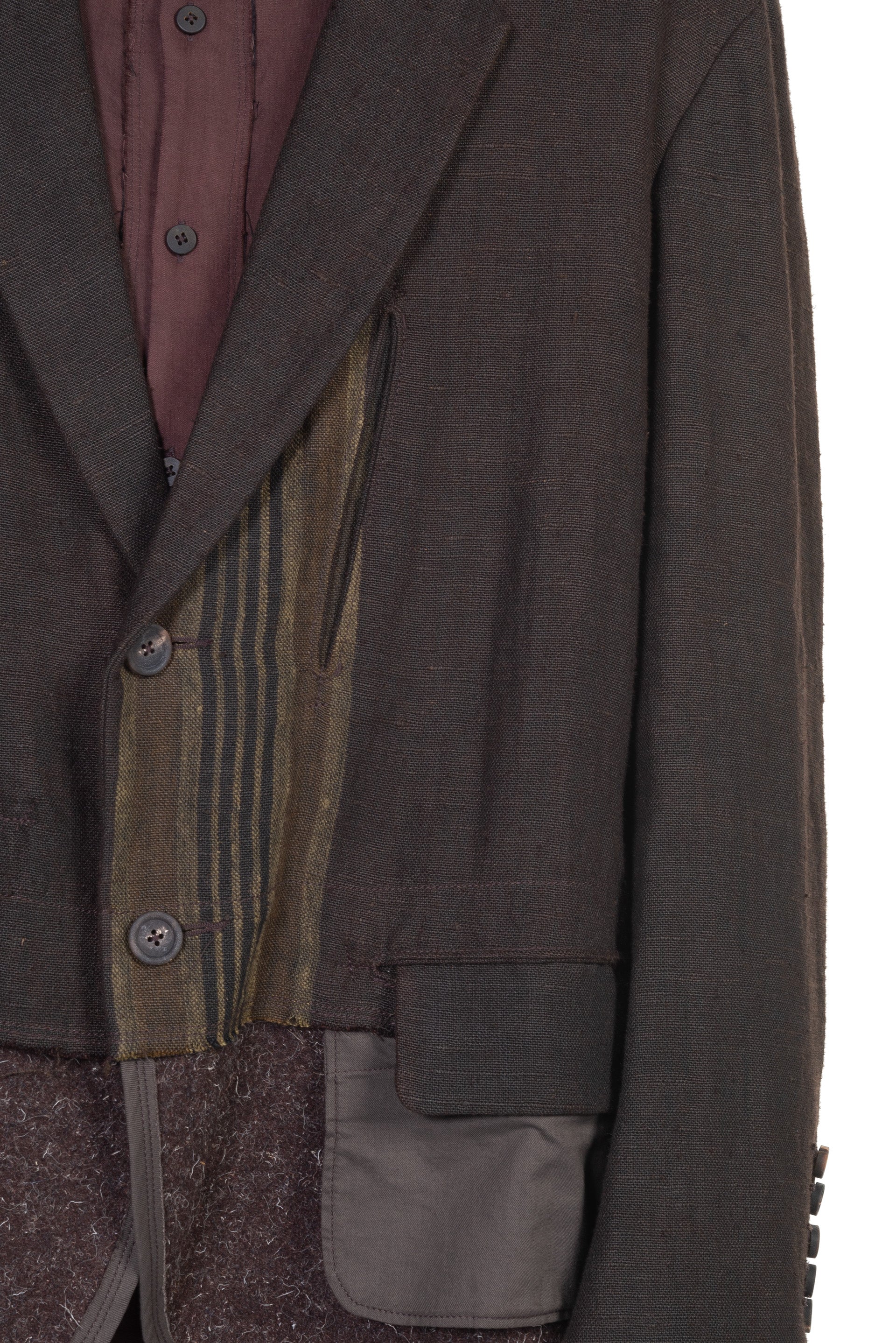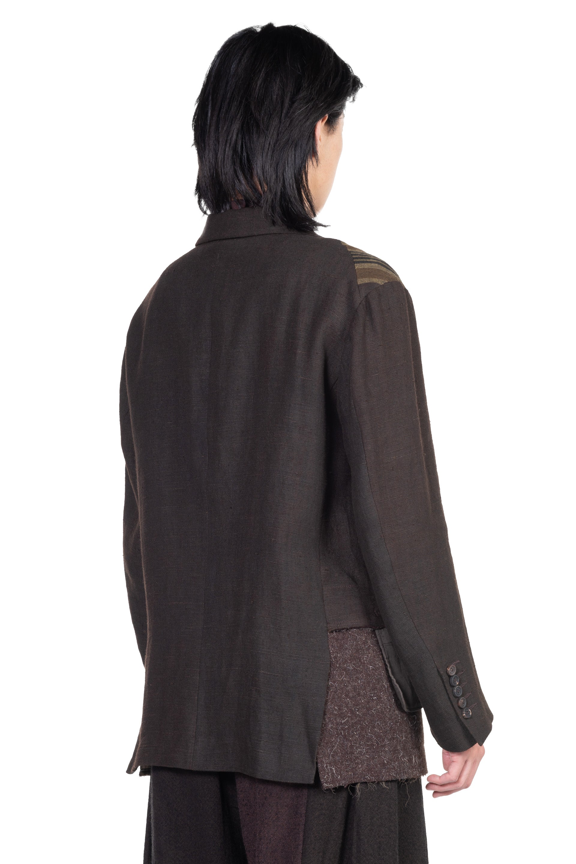 Layered Two Button Blazer. Long sleeves. Button closure at front. Button at cuffs. Signature layered construction. Multi fabric design.