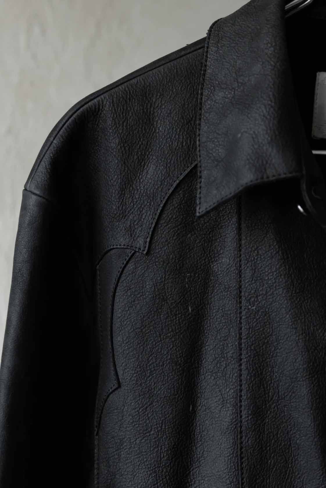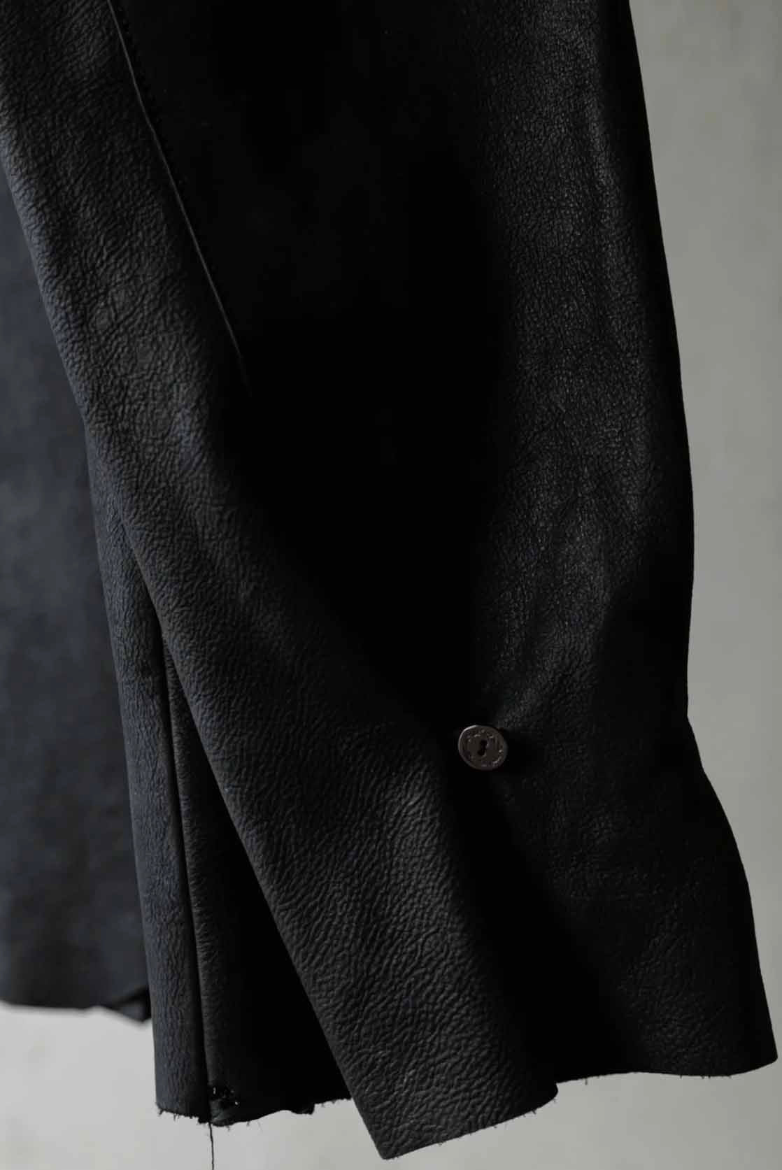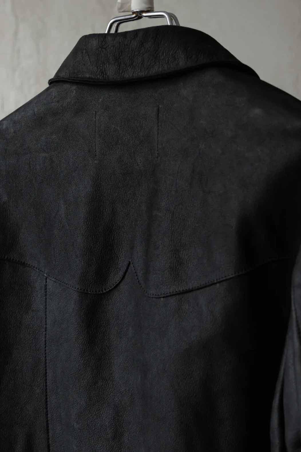 Professor. E understands the time of aesthetics from the use of cotton, hemp and wool. Fabric stitching, patching, designs without edge trimming, deconstruction, and reproduction are all Professor. E's signature elements creating classic immortal designs that can be viewed with the Leather Shirt Black