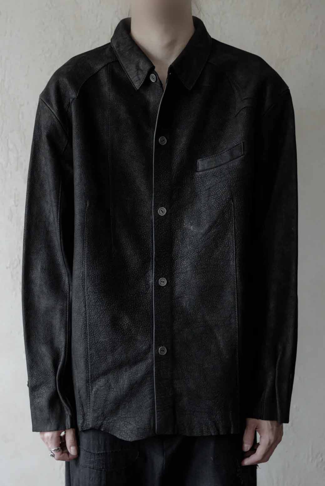 Professor e leather shirt. Crafted from premium cowhide leather with a sanded finish that gives it a more subdued tone than ordinary leather. The buttons are custom-made metal fasteners developed by Professor.E.