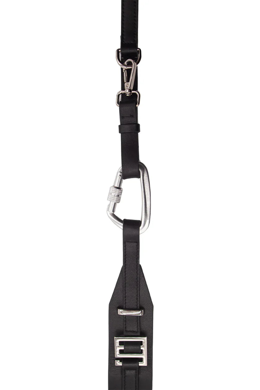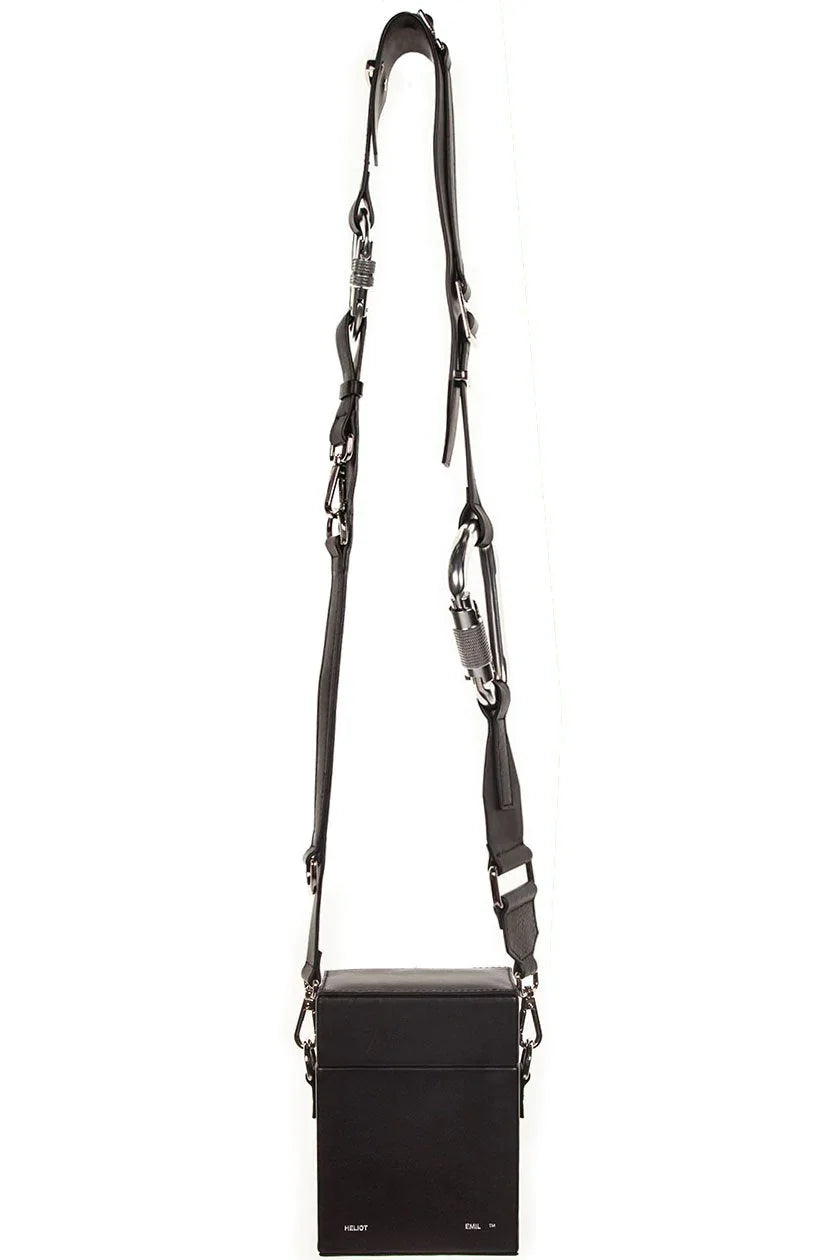 Custom hardware trimmings. Leather material. Single compartment with soft-closure. Heliot Emil Logo on front. Multi-adjustable strap. Carabiner details on strap. Thick leather cover on strap for carrying.