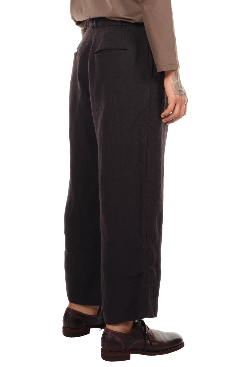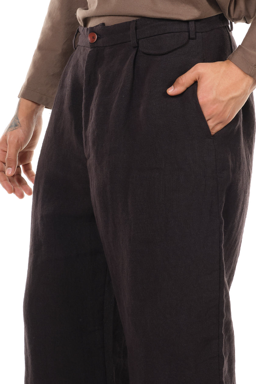 Leisure Pants in Black from Peng Tai. Button closure at waist. 2 pockets at side. Handmade buttons. Raw finish throughout. Brand signature stitching at back.