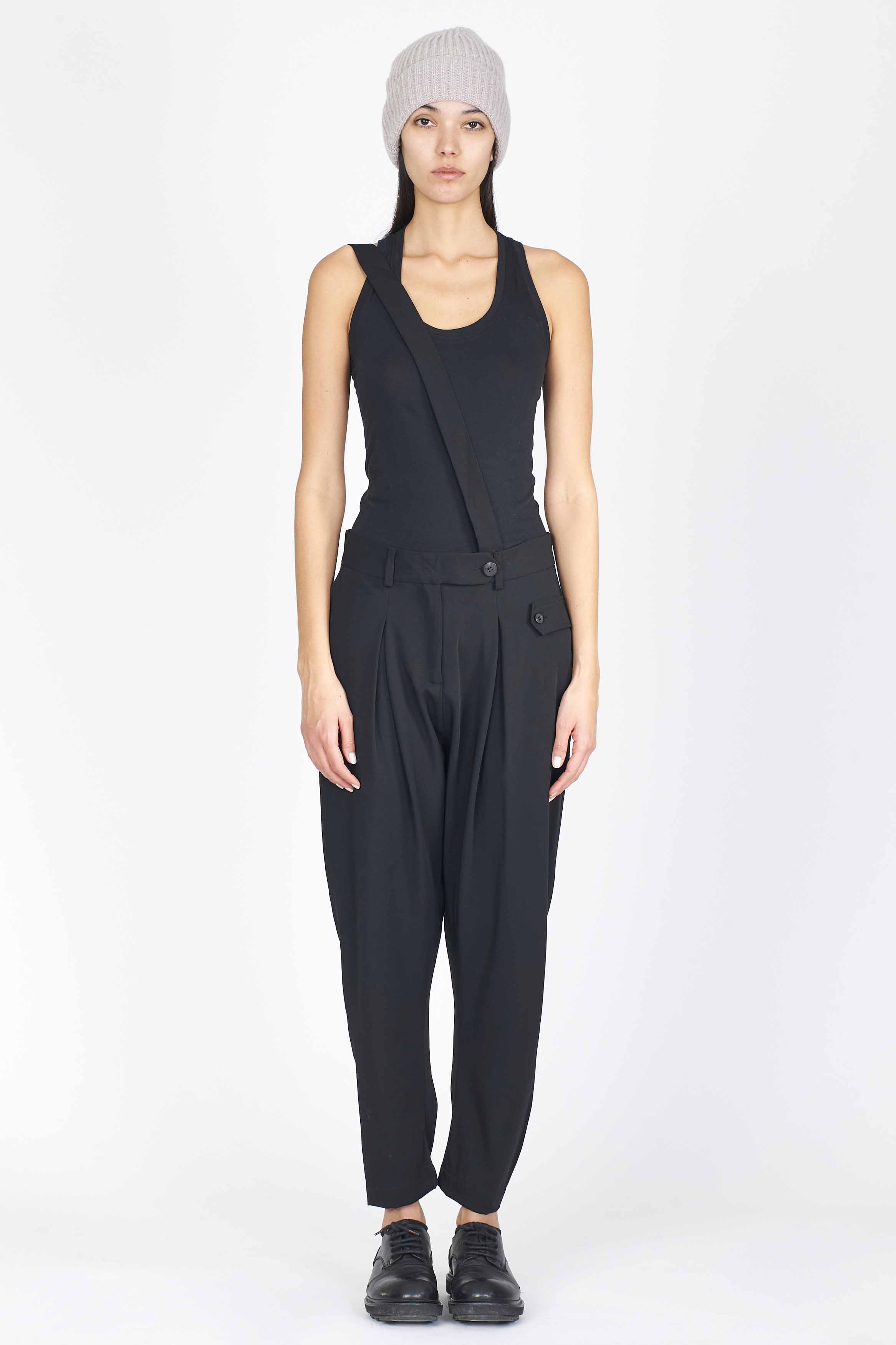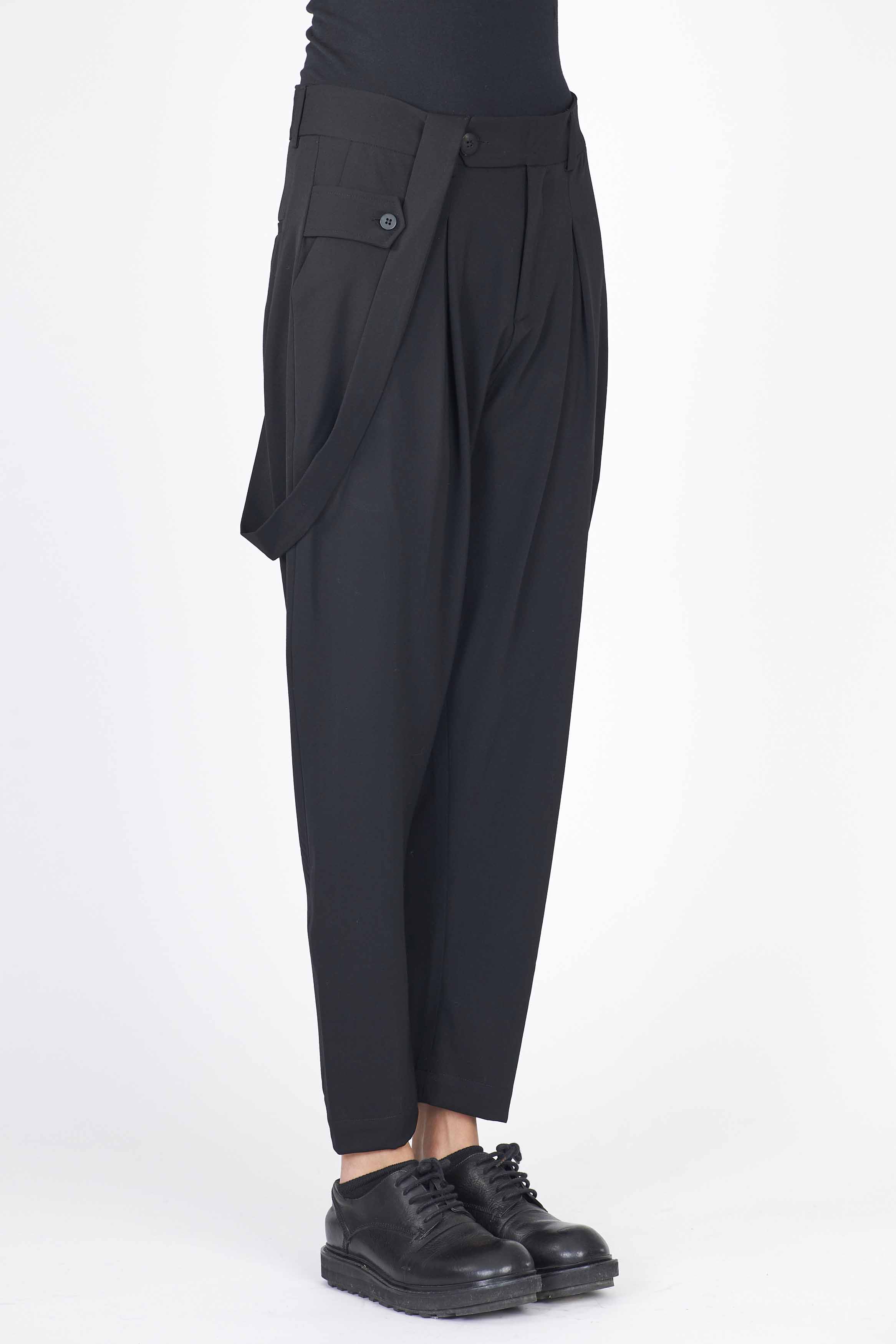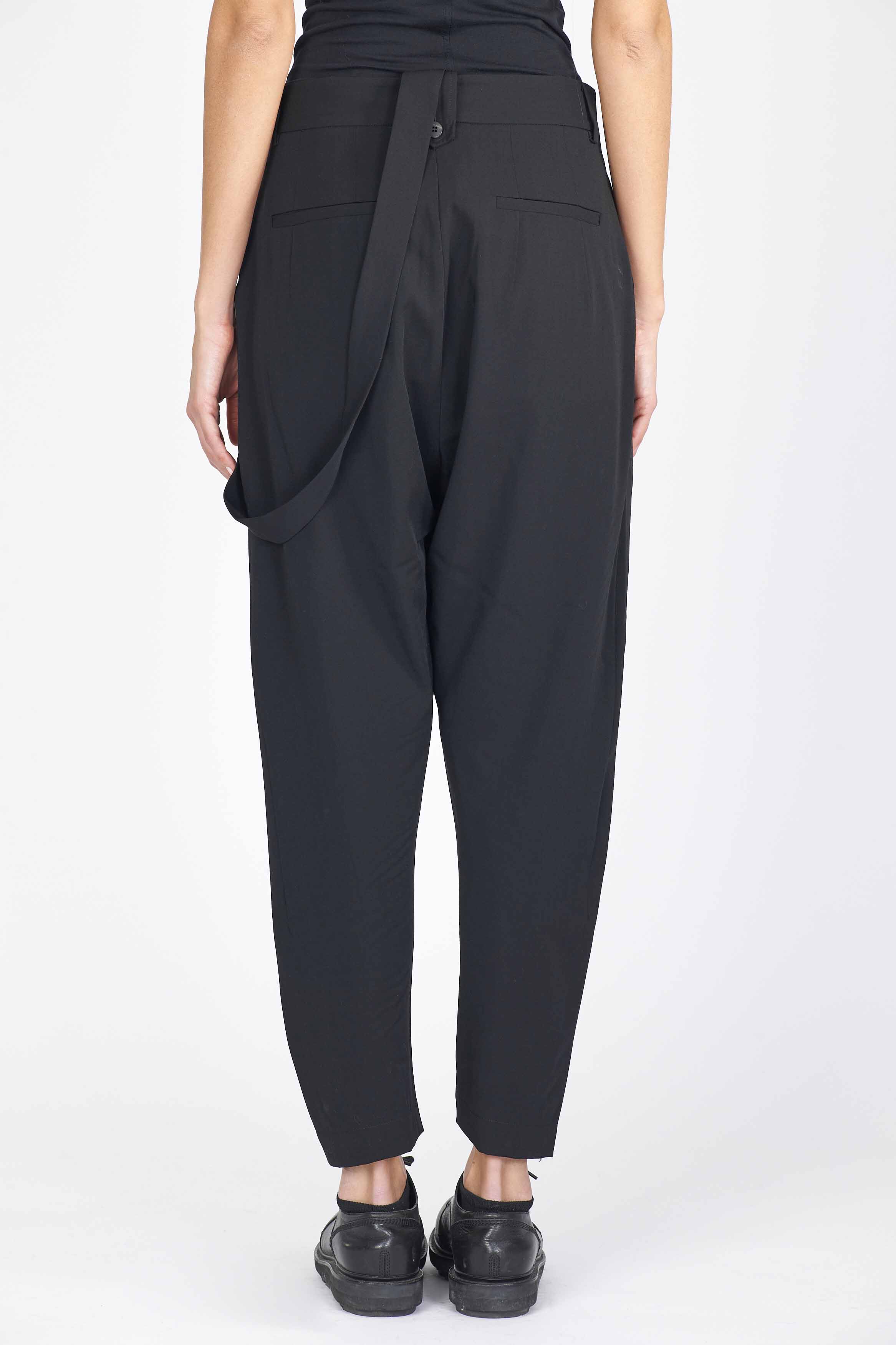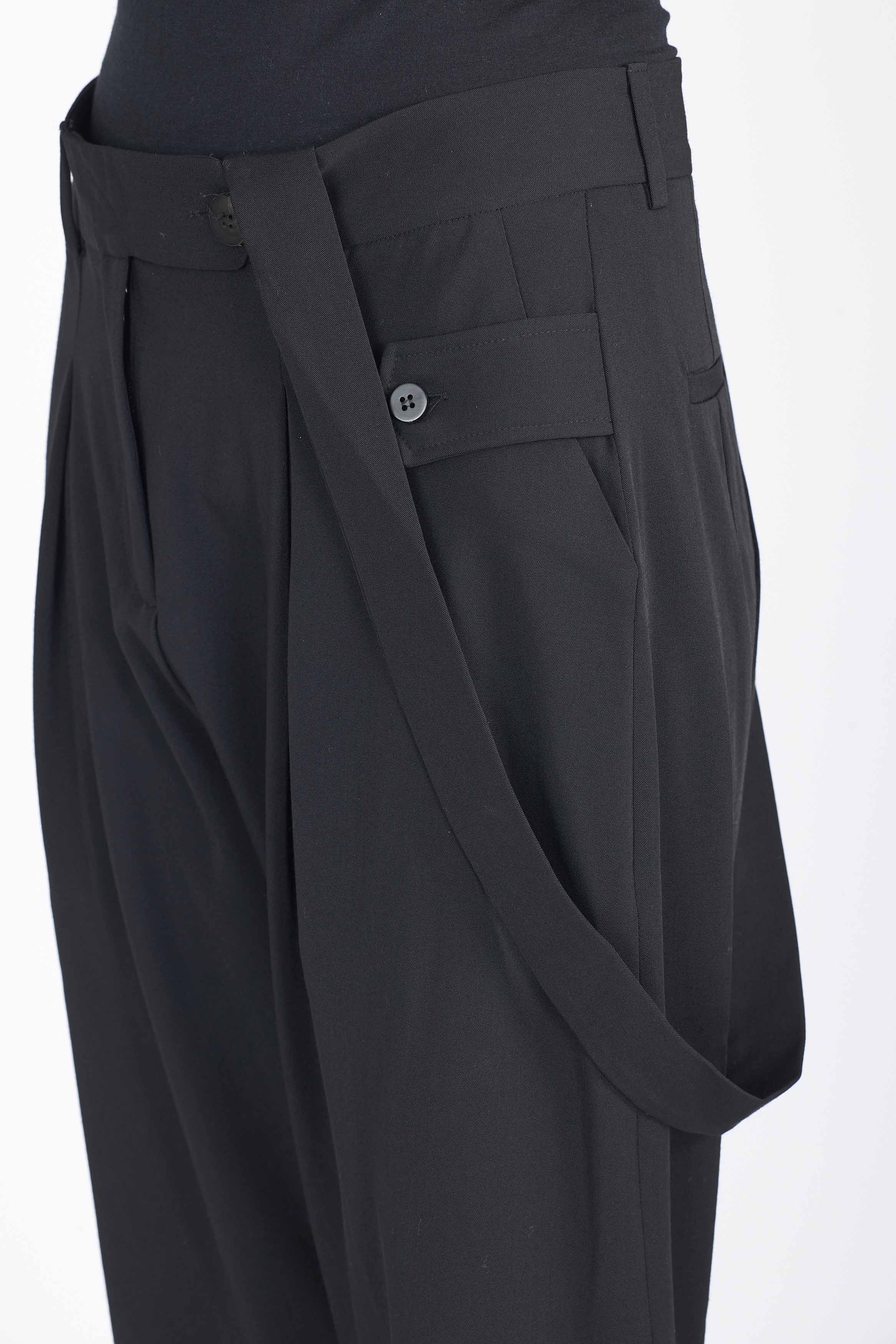 Isabel Benenato Light Wool Drop Crotch Pants. Button closure at waist. Suspender on side. Drop crotch.
