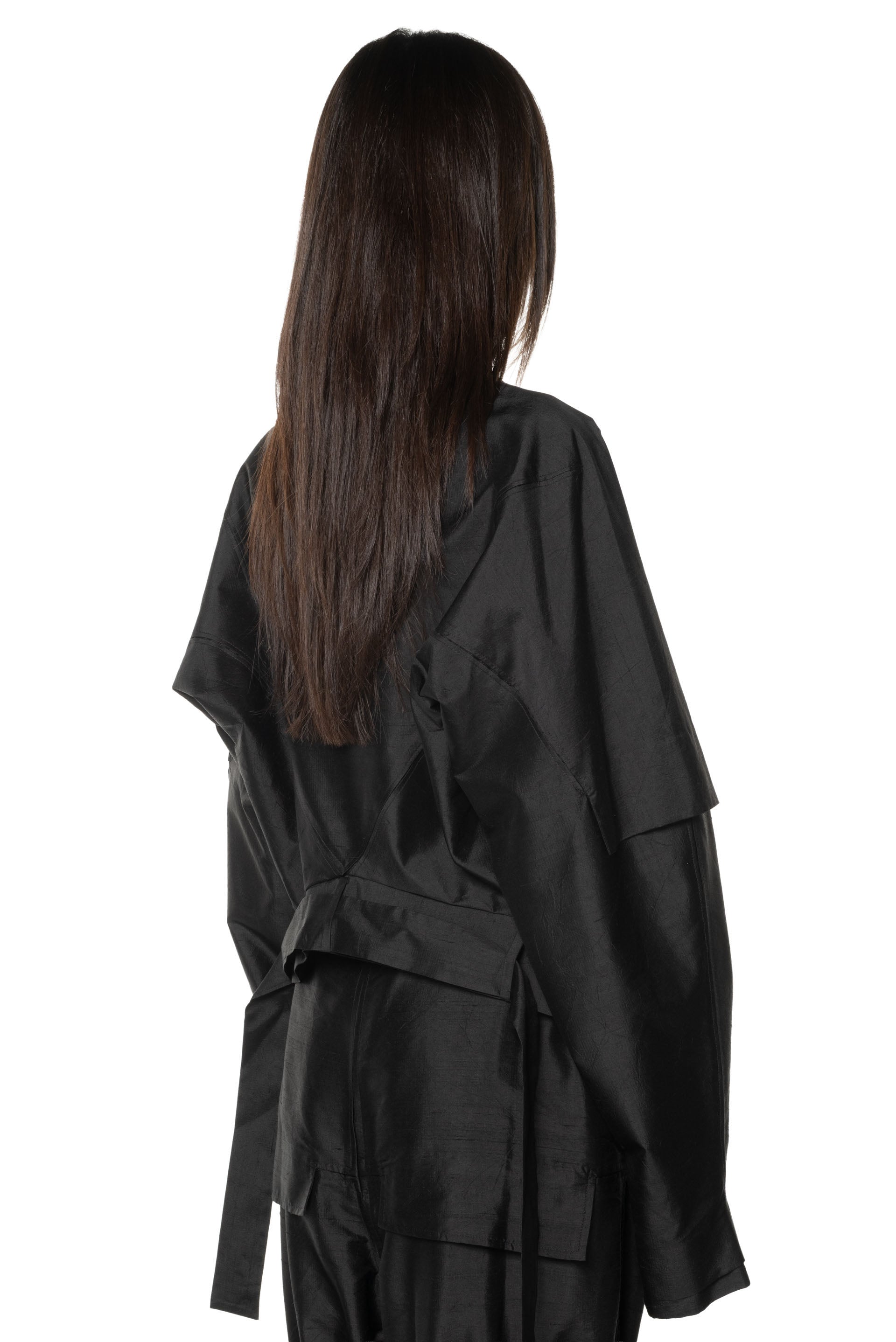 Yehuafan believes in feminine beauty with his own way to explain the smooth curve to compliment women’s body. He specialised in asymmetrical cutting and deconstructed silhouette as seen with the Linen and Silk Jacket Green.