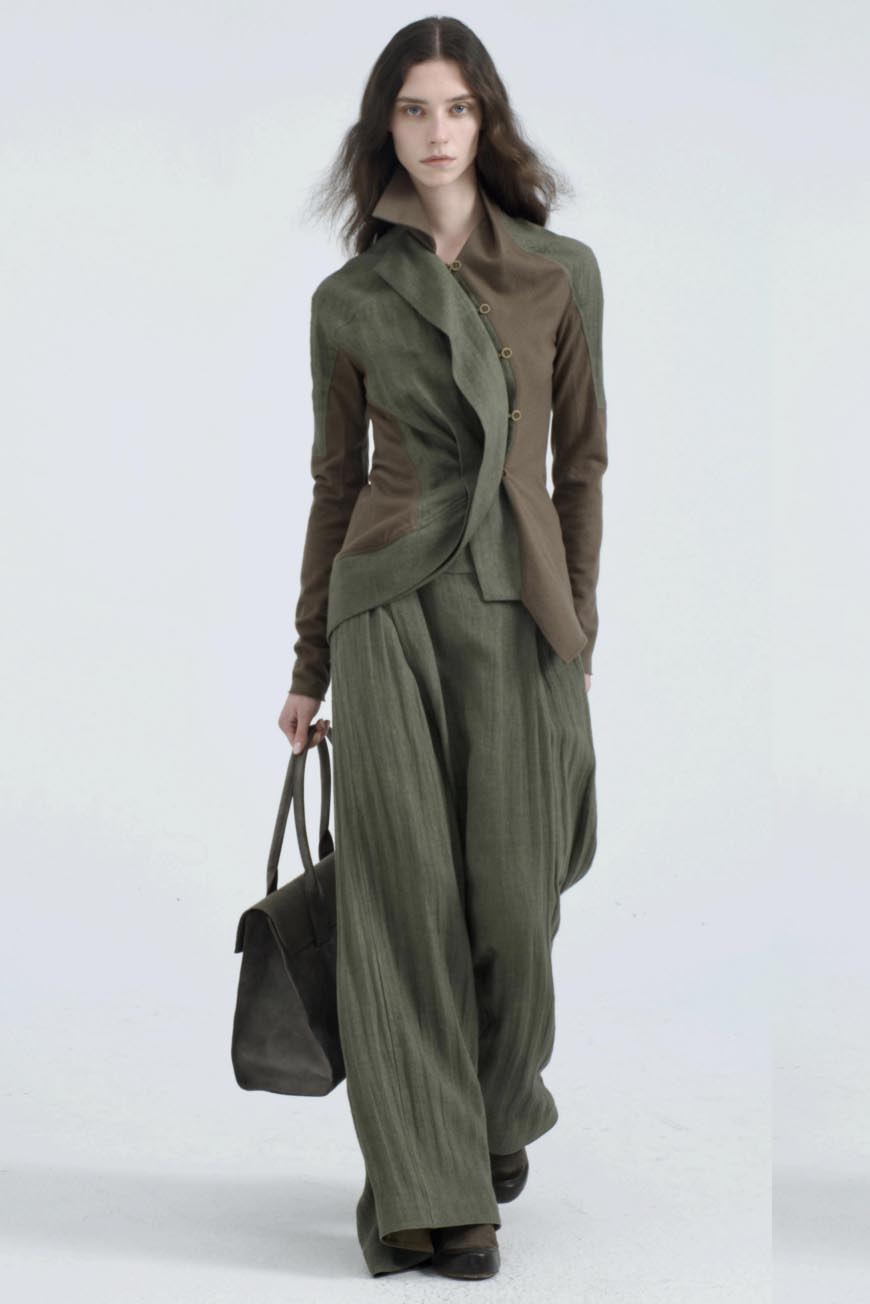 Yehuafan believes in feminine beauty with his own way to explain the smooth curve to compliment women’s body. He specialised in asymmetrical cutting and deconstructed silhouette as seen with the Linen Pants Green.