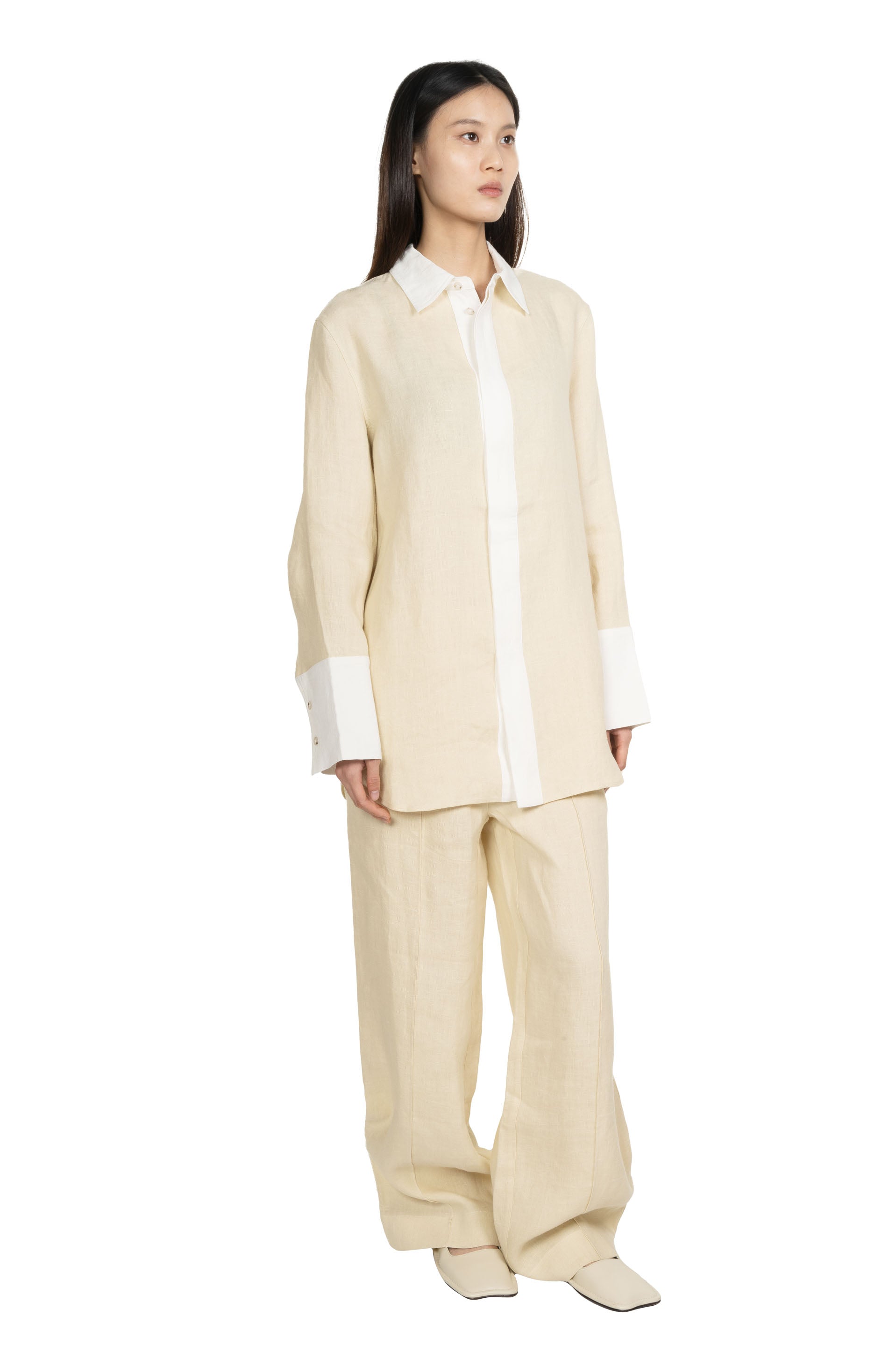 Swaying linen shirt. Long sleeves. Button closure at front. Button closure at cuffs. Turned up sleeves. Two colour contrast at front and cuffs.