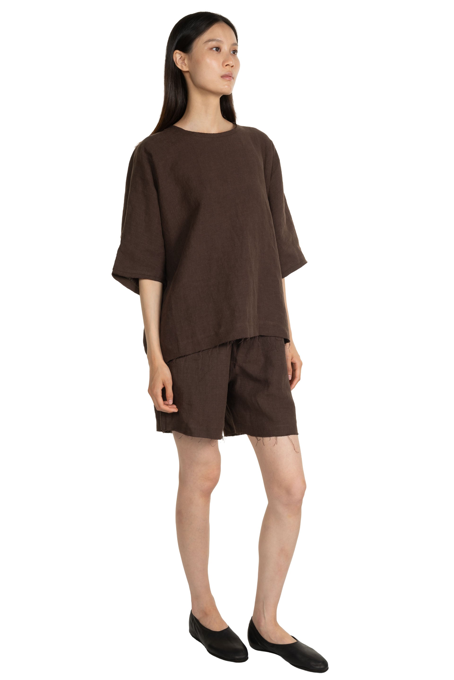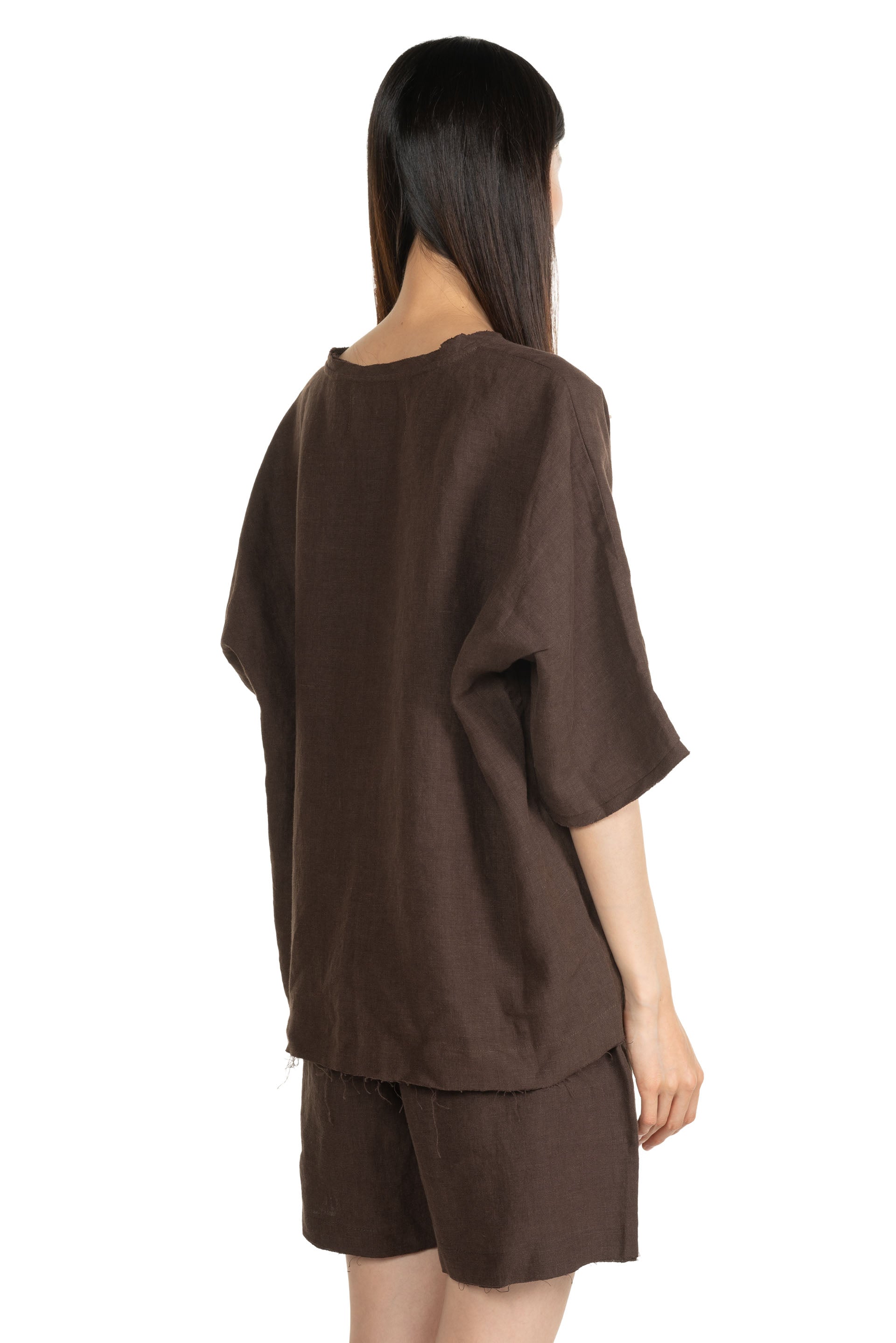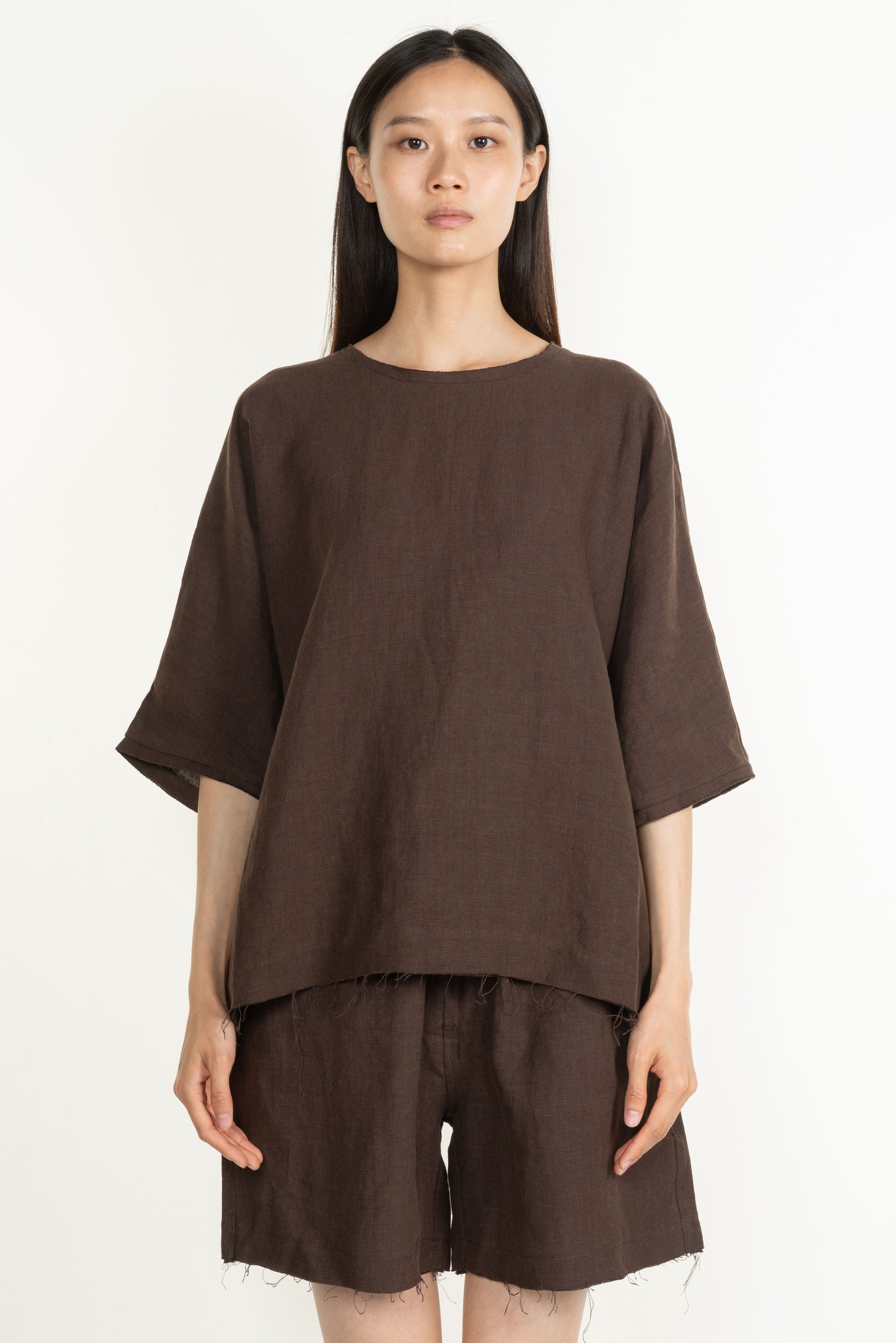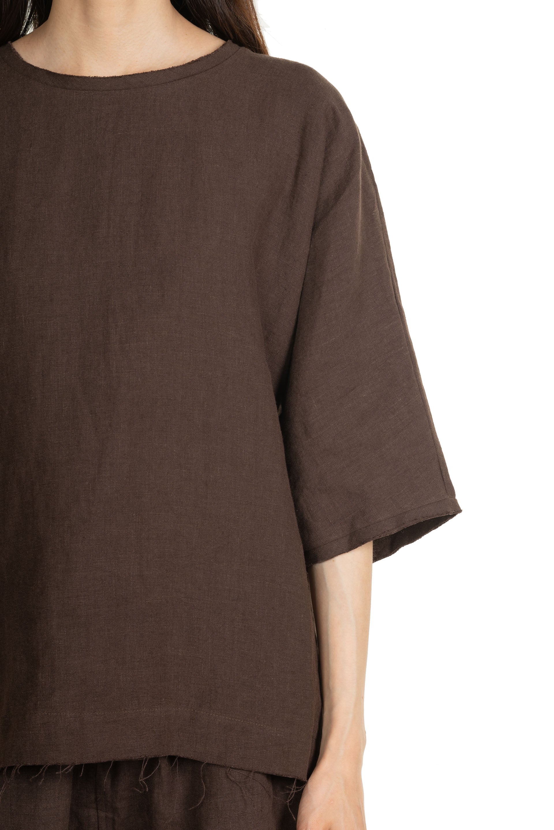 Kar Brown Linen T-Shirt. Short sleeve. Boxy fit. Round neck. Raw edges.
