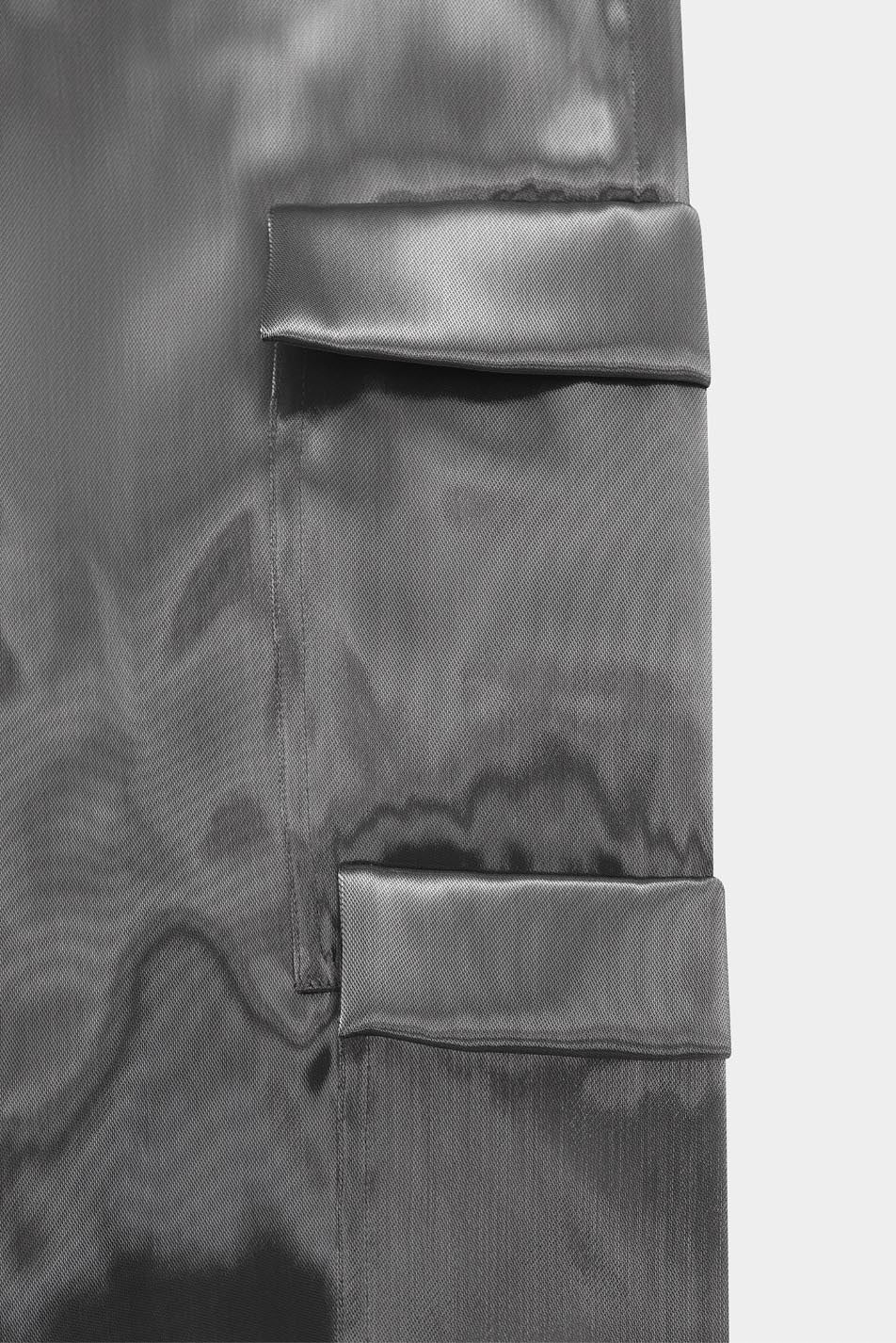 Signature Liquid Metal trousers, now in oversized cargo style with pockets. Oversized fit. Liquid metal fabric. Patch pockets at sides of legs and back. Diagonal zips in trouser hem for flared fit adjustment. Hook and eye closure waistband. Edgebound seam allowances with front and back lining. 'H'-beltloop at back.