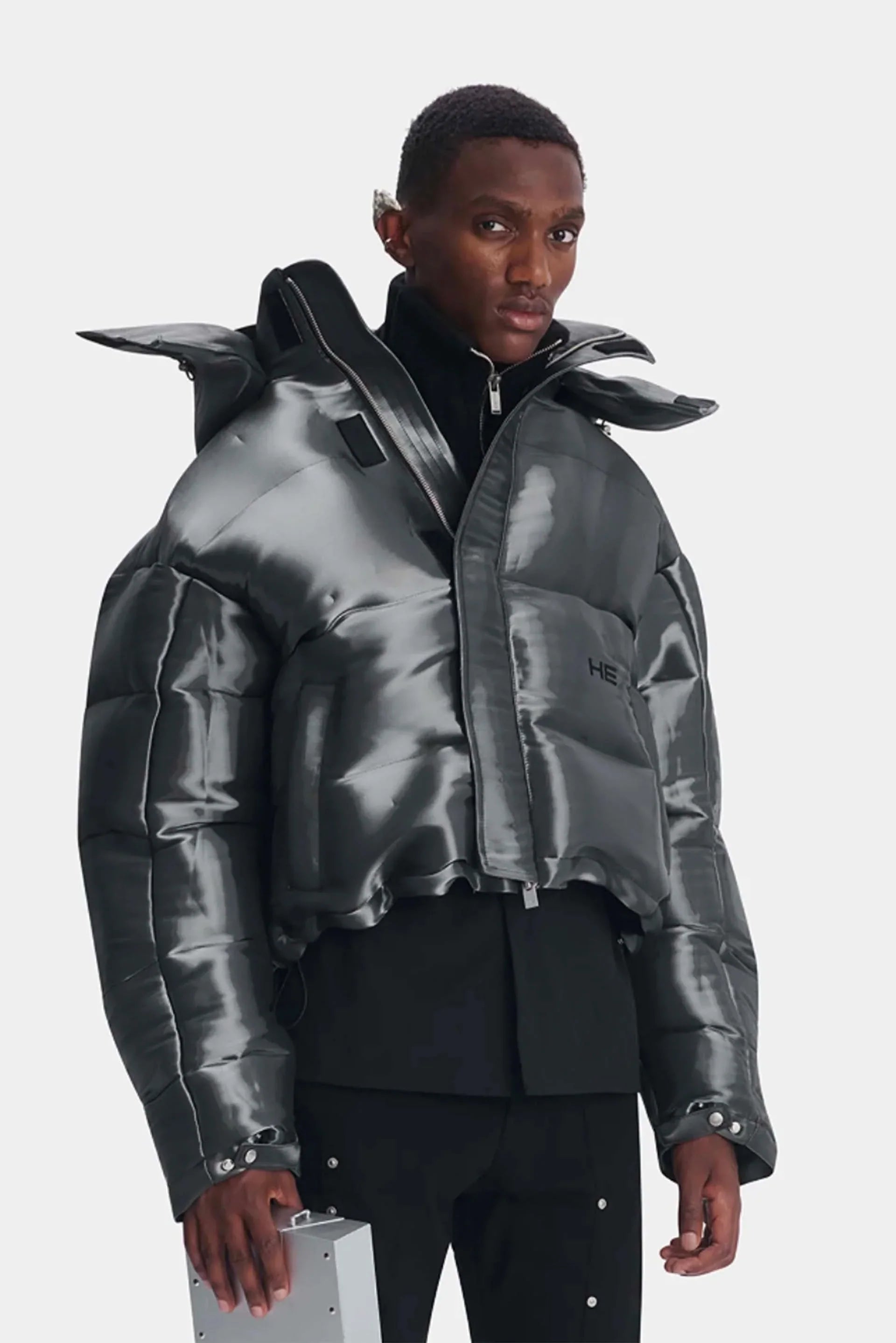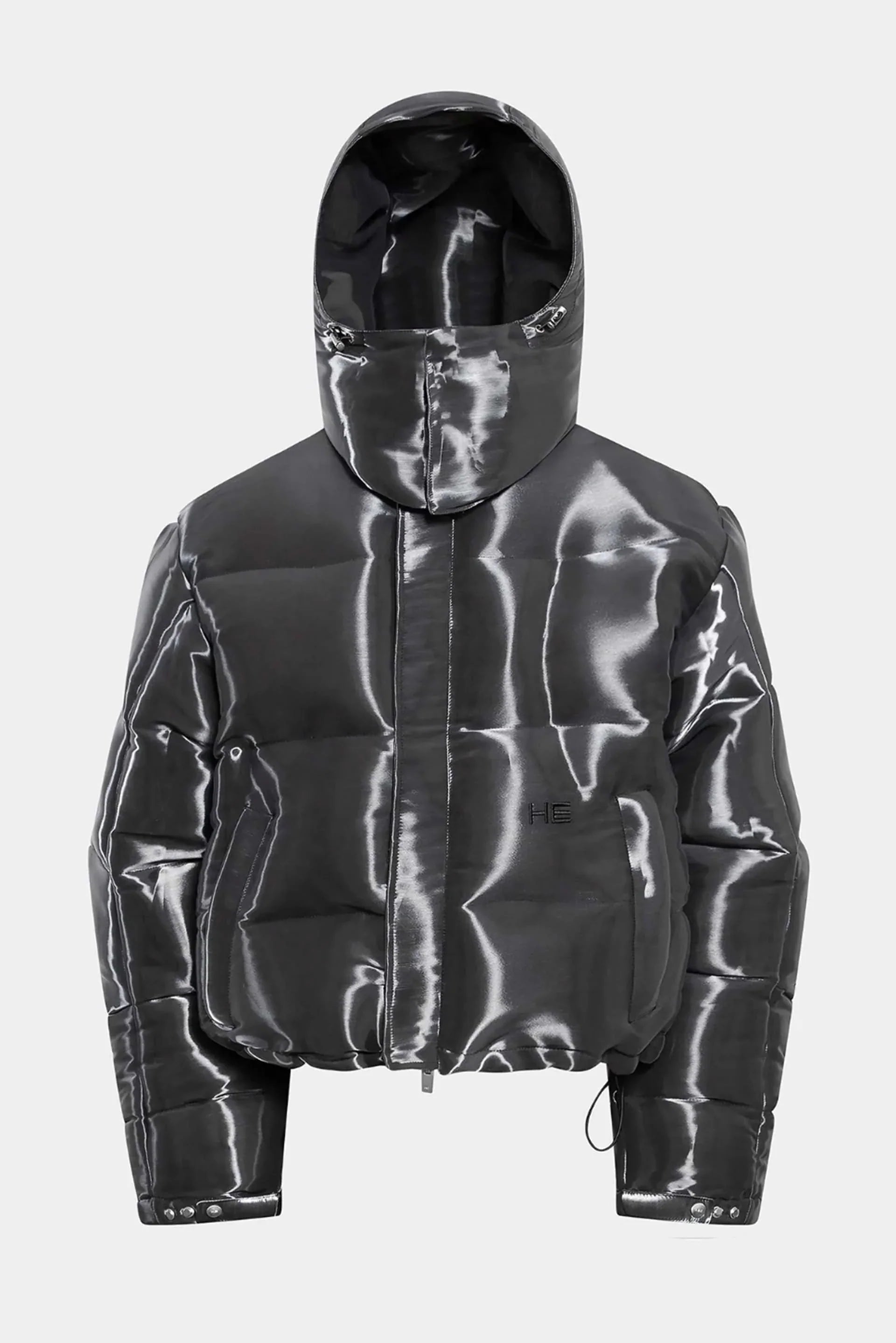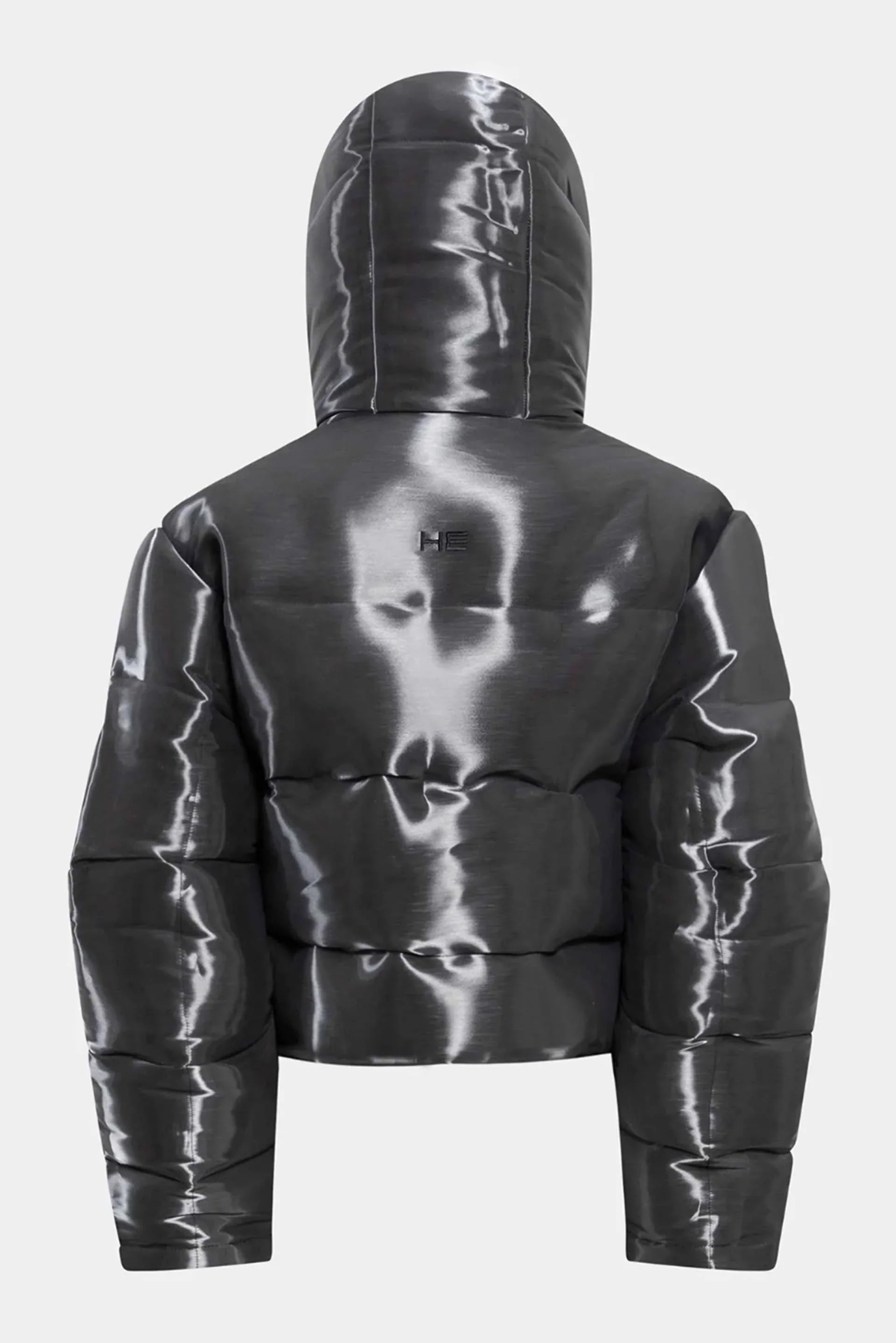 Signature liquid metal fabric with a high shine effect. Straight quilting lines. Two-way front zip closure. Front welt pockets with metal press button closure. Embroidered HE logo on the back. Cropped fit