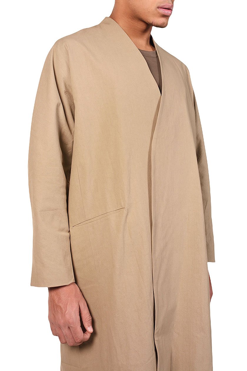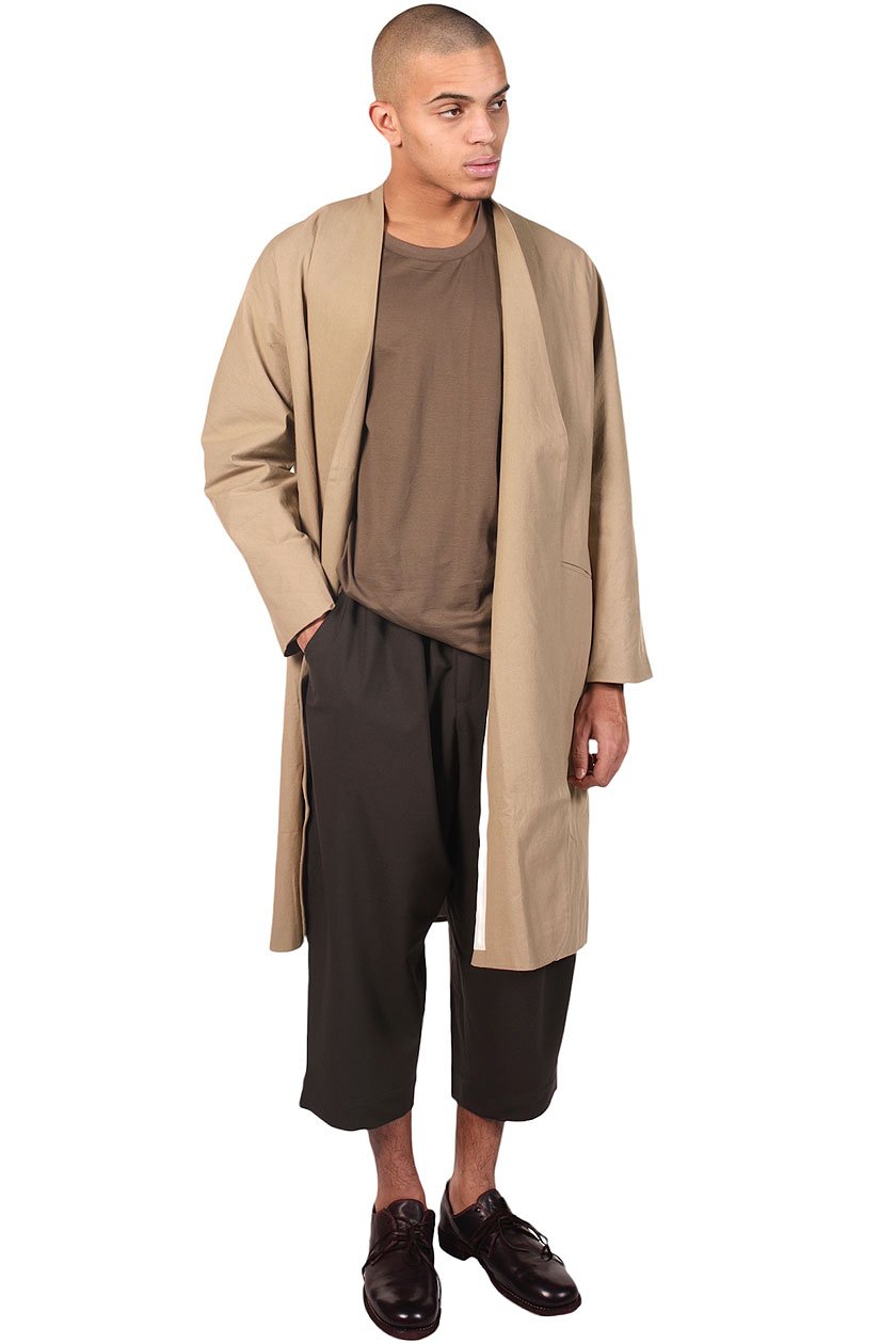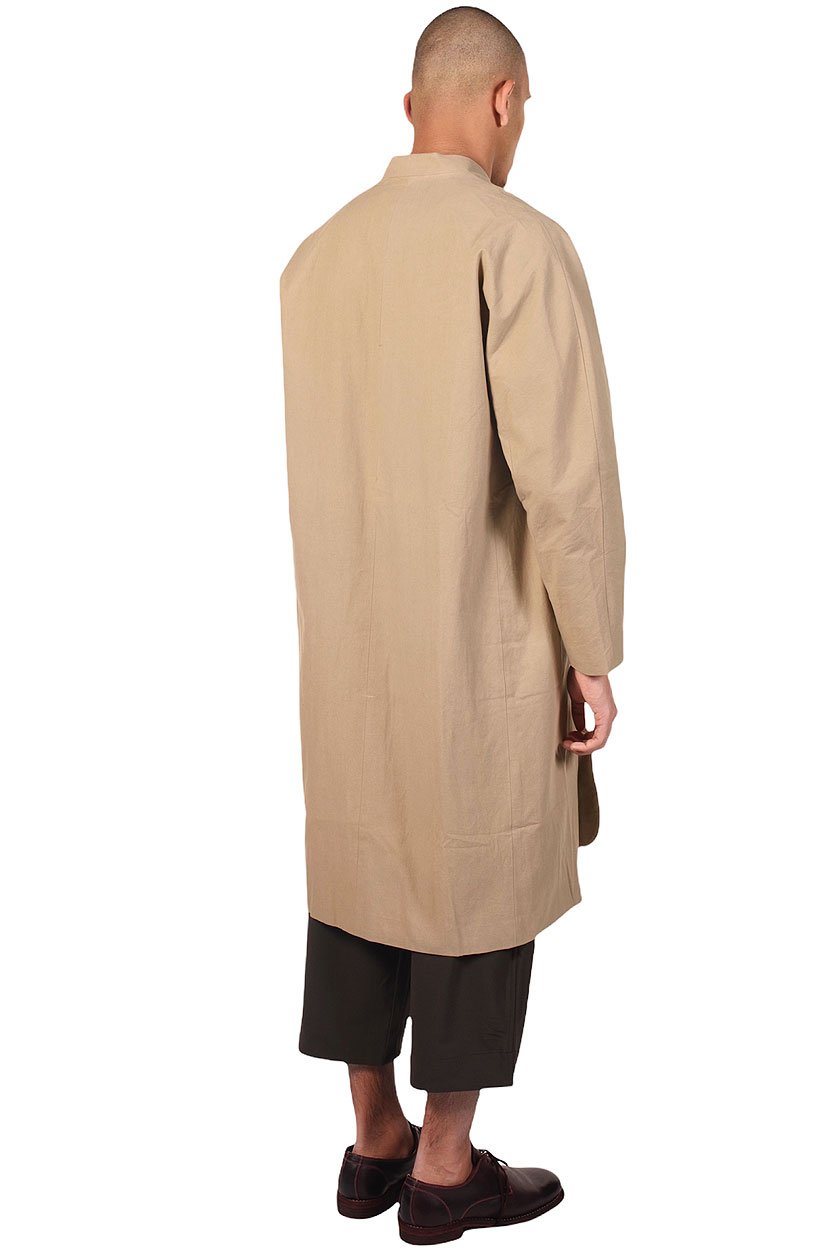 Long Celadon Collarless Coat. Collarless. Dropped shoulders. Fully lined. Two side pockets.