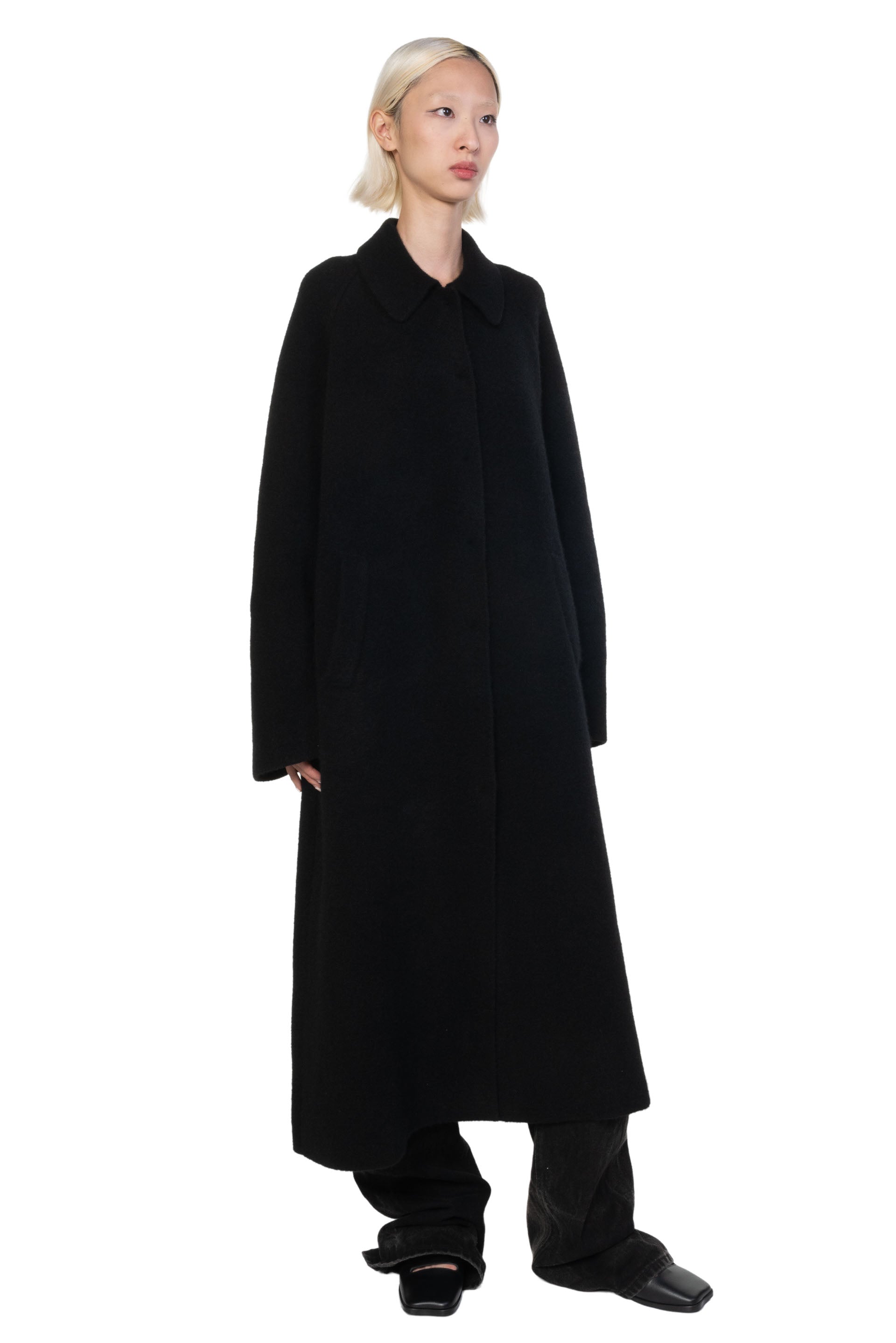 Black Yak wool coat from Boboutic. Classic collar. Long sleeves. Button closure at front. Hidden button system. Two side pockets. Signature Yak mix. Soft textural fabric. Lightweight.