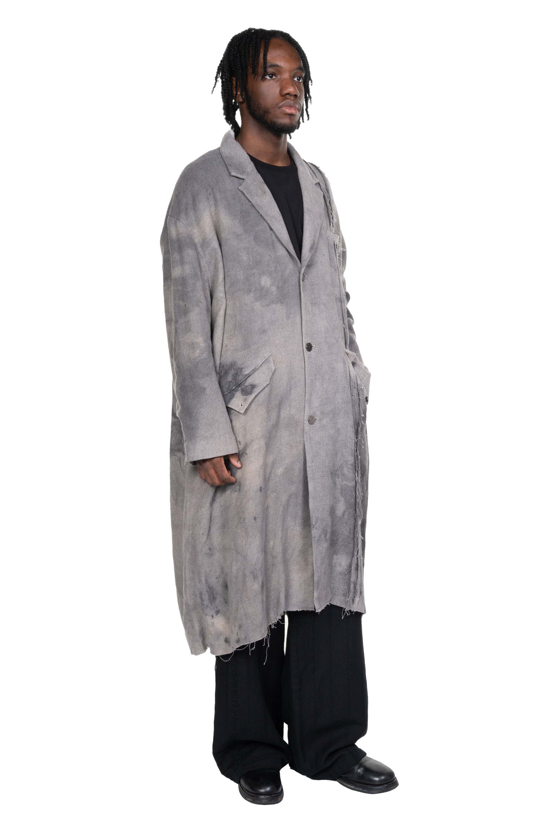 Professor. E Forgotten Material Long Coat Natural Dyed Grey from Professor e. Long sleeves. Two side pockets. Signature metallic button at front and cuffs. Lined with signature printed lining. Button closure at front. Natural grey dye throughout. Distressed throughout. Slightly oversized. Lace details at collar.