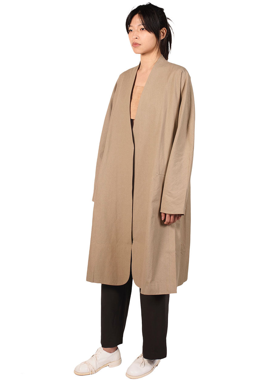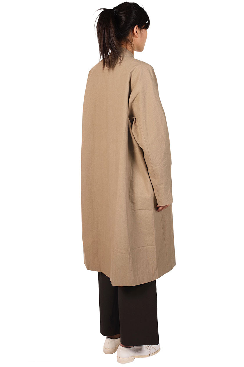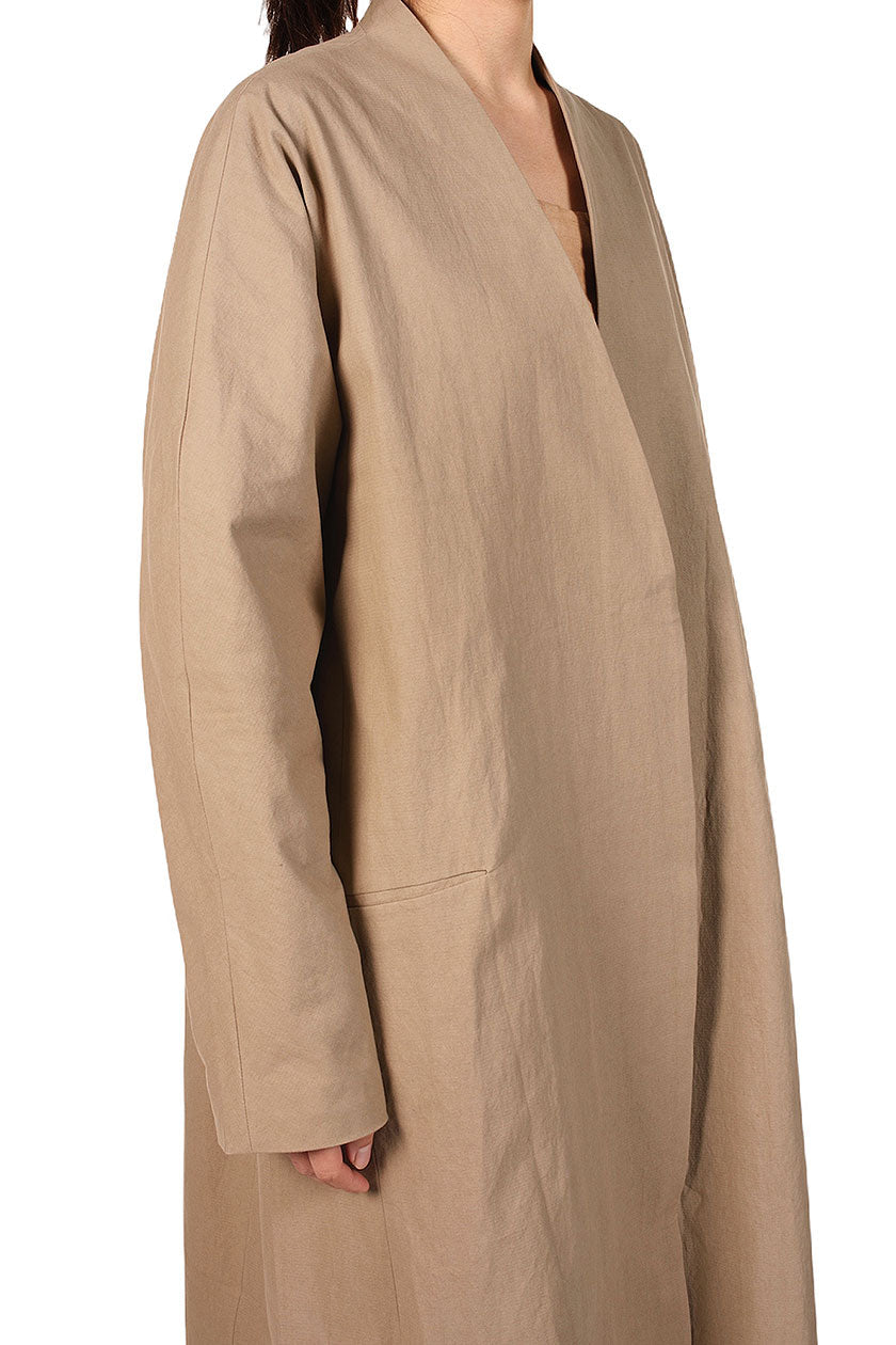 Long Kimono Coat. Collarless. Dropped shoulders. Fully lined. Two side pockets.