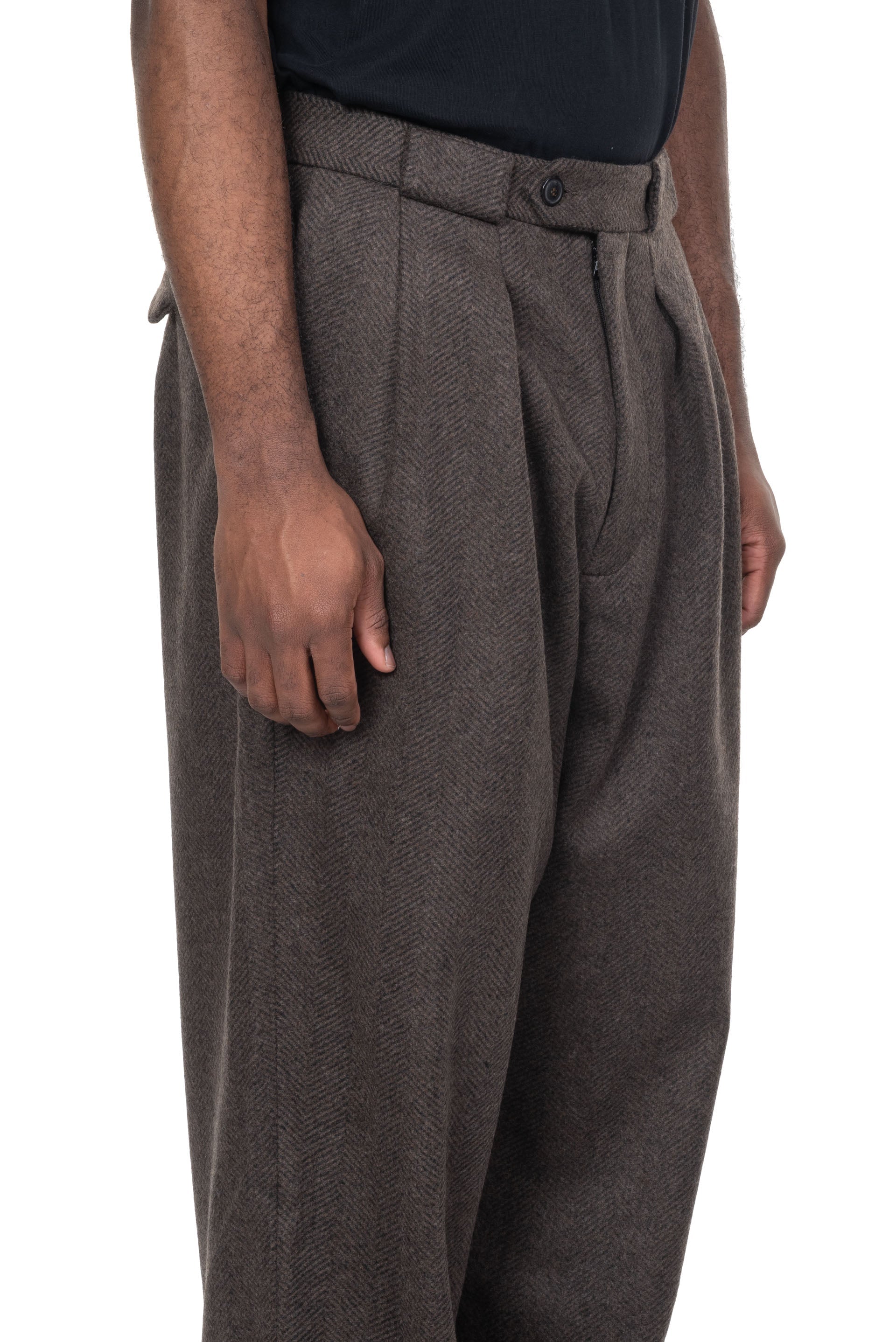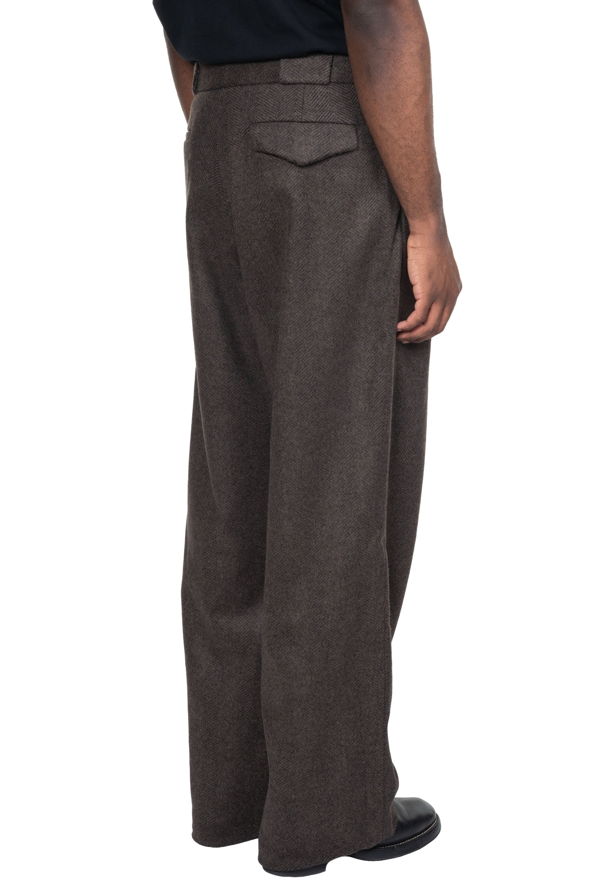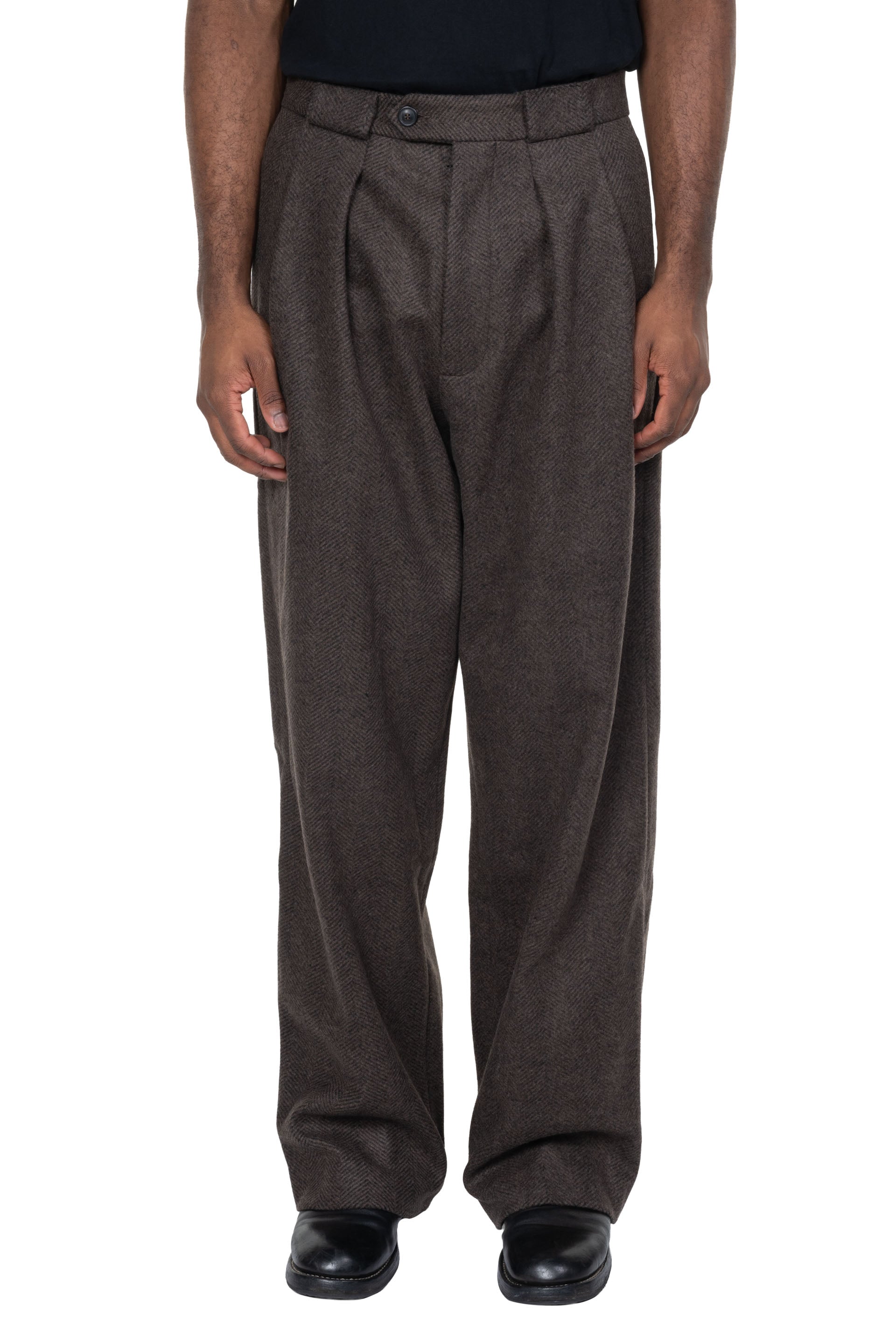 Lownn Long Wide Pants Wool Cashmere Coffee Brown. Button closure at waist. Two side pockets at Side. Two pockets at back. Pleats at front. Belt loops. Soft flannel wool fabric. Long wide fit.