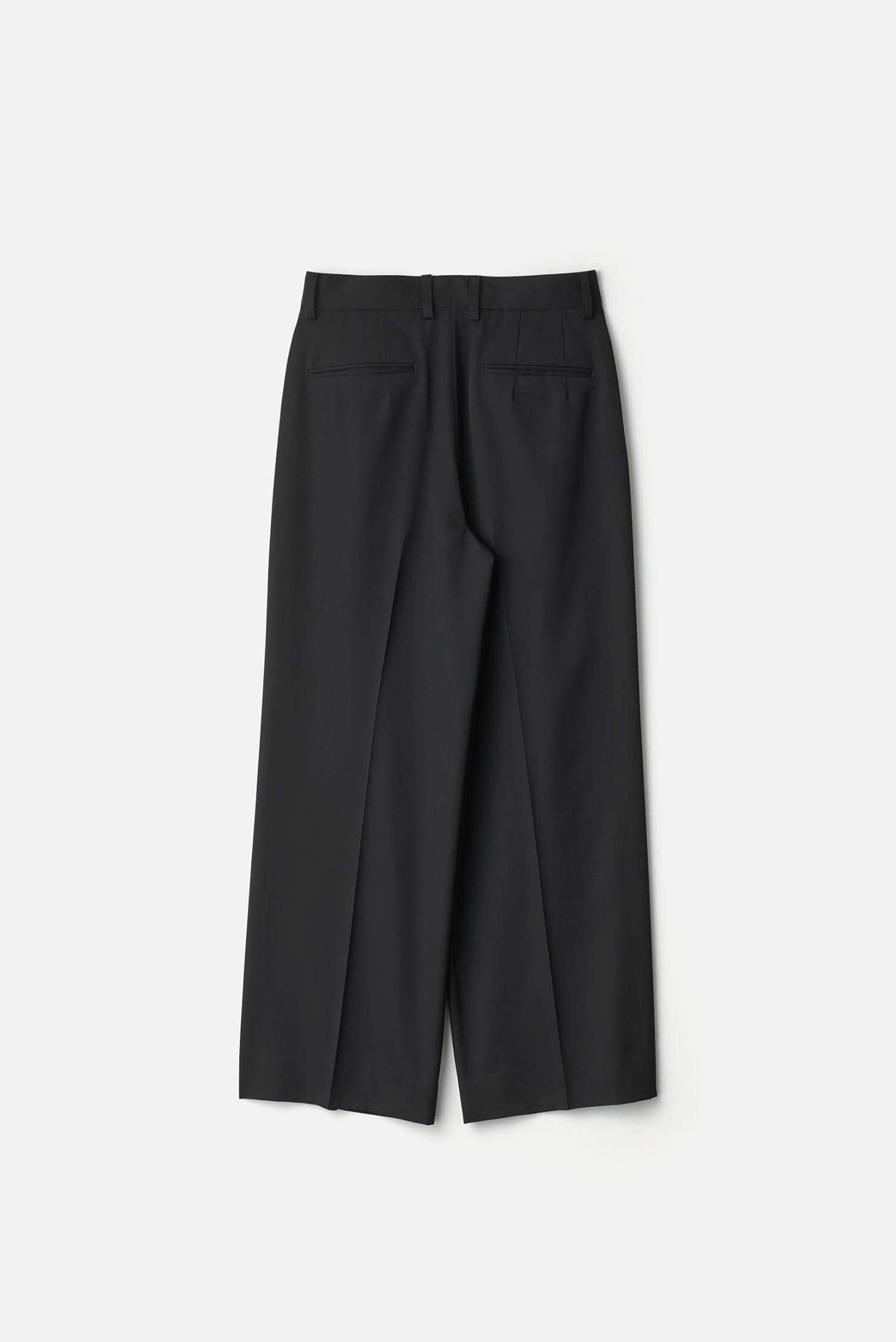 Two tuck trousers with a wide silhouette from thigh to hem, crafted from original wool gabardine woven at high density using 2/90 Super120’s yarns and piece-dyed. The silhouette is slightly tapered to maintain a clean and refined look despite the wide fit.