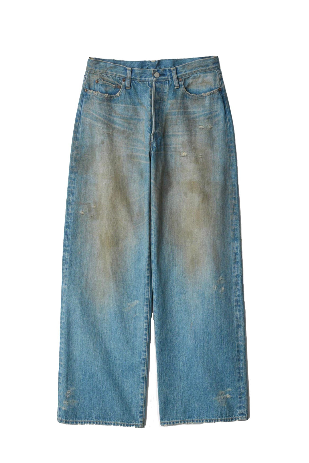 ssstein Loose Denim Jeans. Button closure at waist. Button closure. Two side poclets. Two back Pockets. Loose fits. Distressed dyed look. Soft textural cotton feel.
