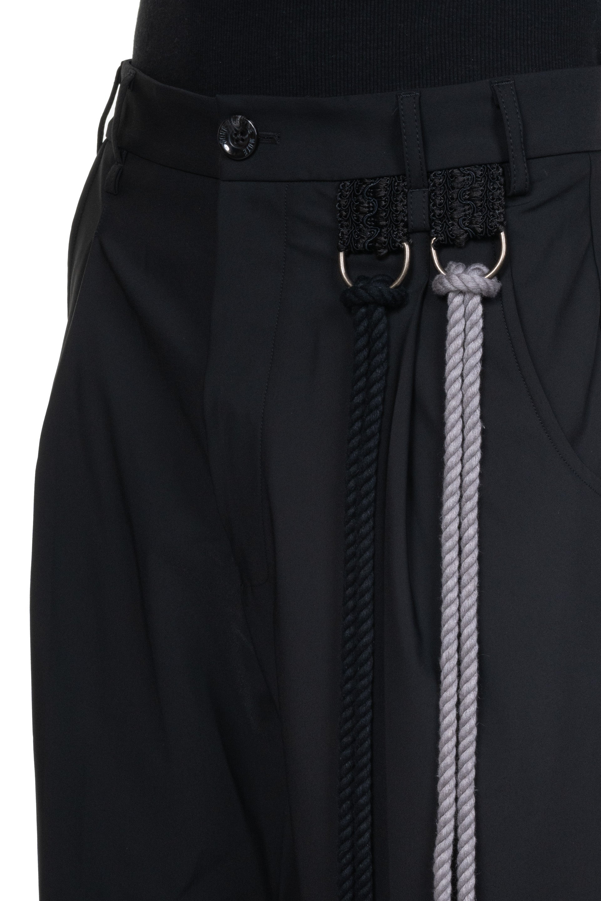 Song for the Mute loose pleated pants. Button closure at front. Two side pockets. Two back pockets. Pleated at front. Detachable tussle detail at waist.