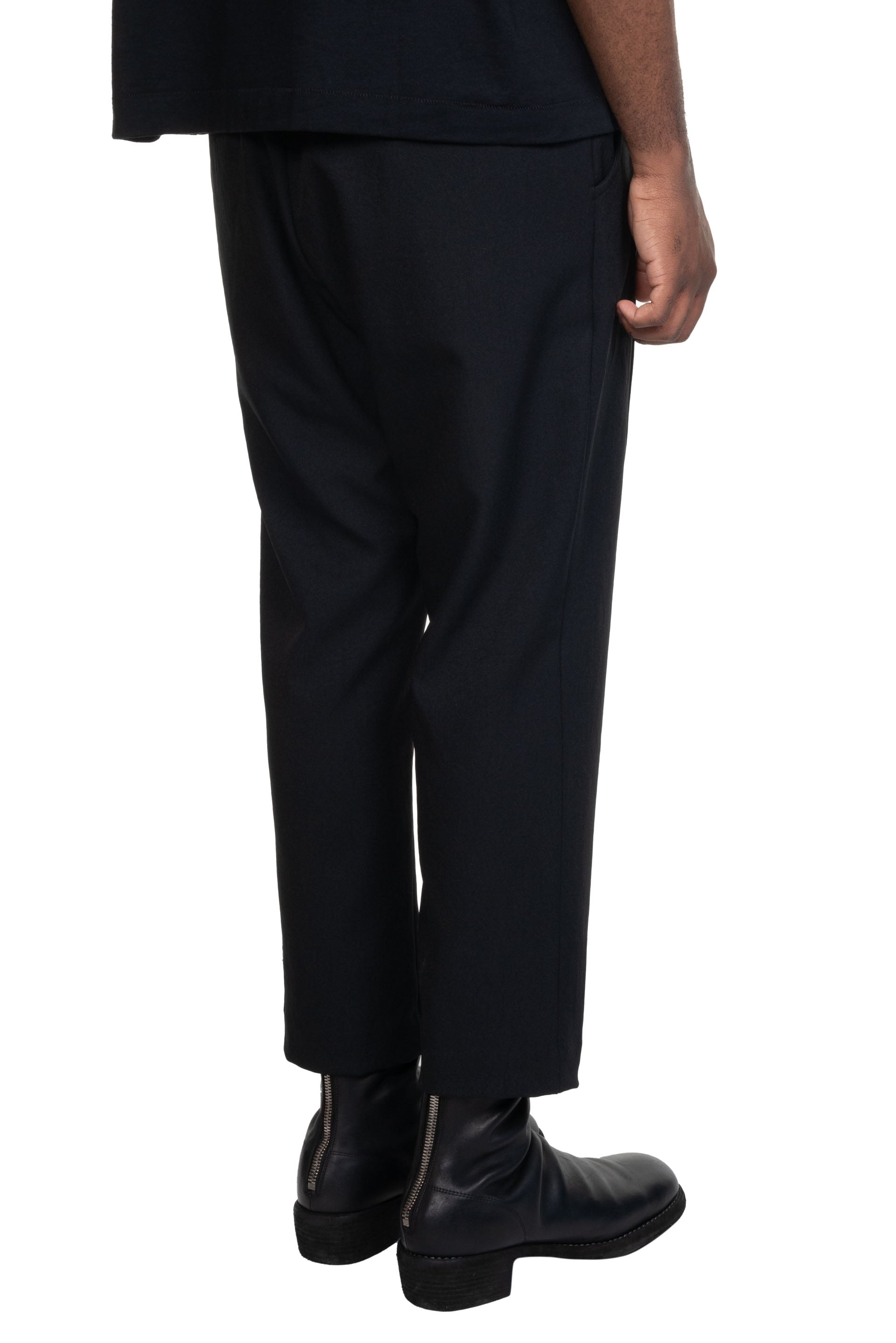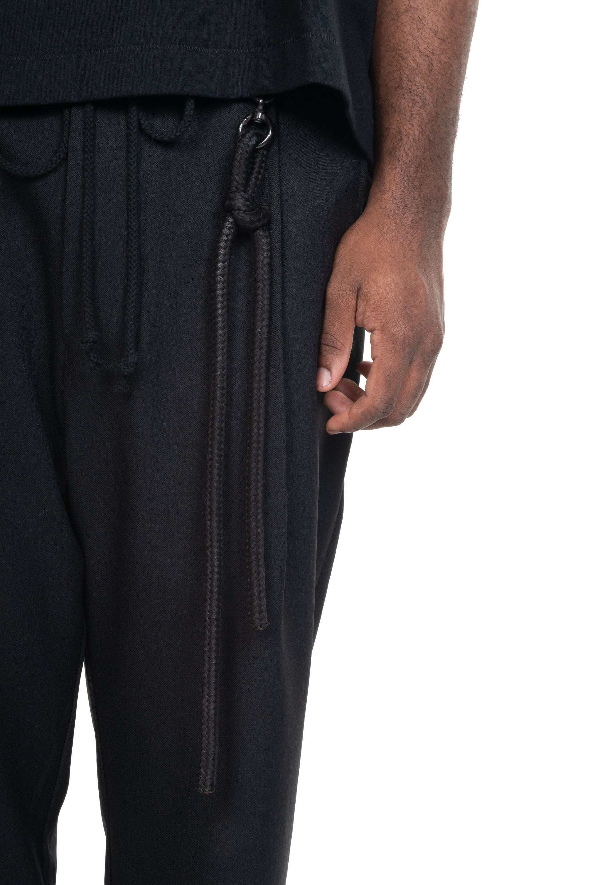 Song for the Mute signature single pleated cropped trouser in a lightweight and fluid recycled poly. Two side pocket with cotton lining. Featuring an elasticated waistband, tapered hemline and seasonal tonal rope lanyard.