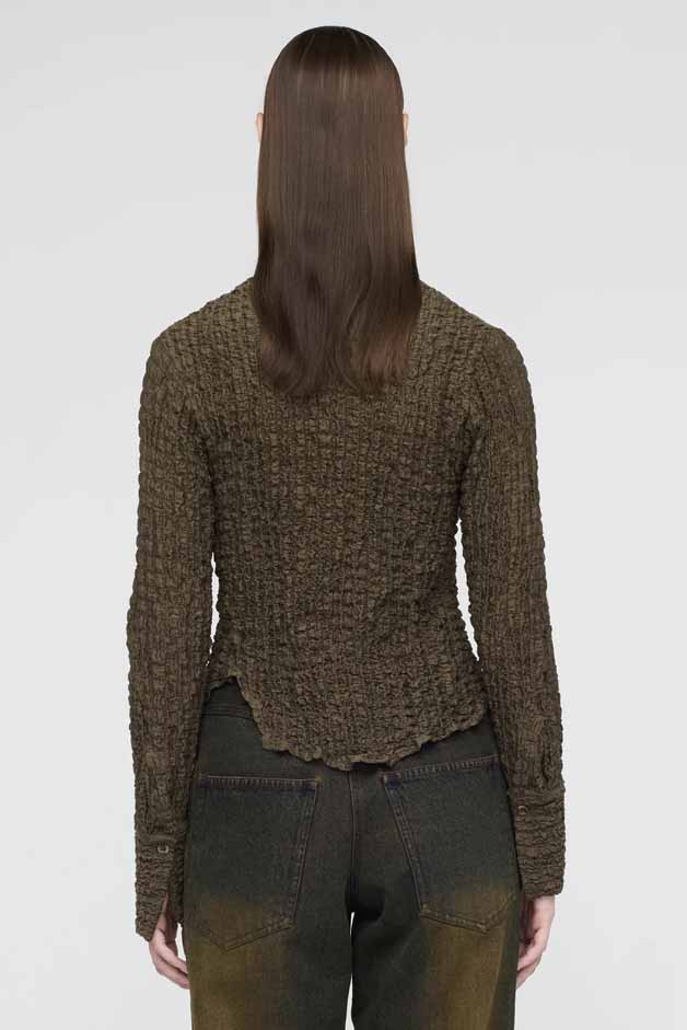 Constructed from a three-dimensional, waffle-like stretch cotton blend, the fabric lends both structure and flexibility, enhancing comfort while adding tactile depth.