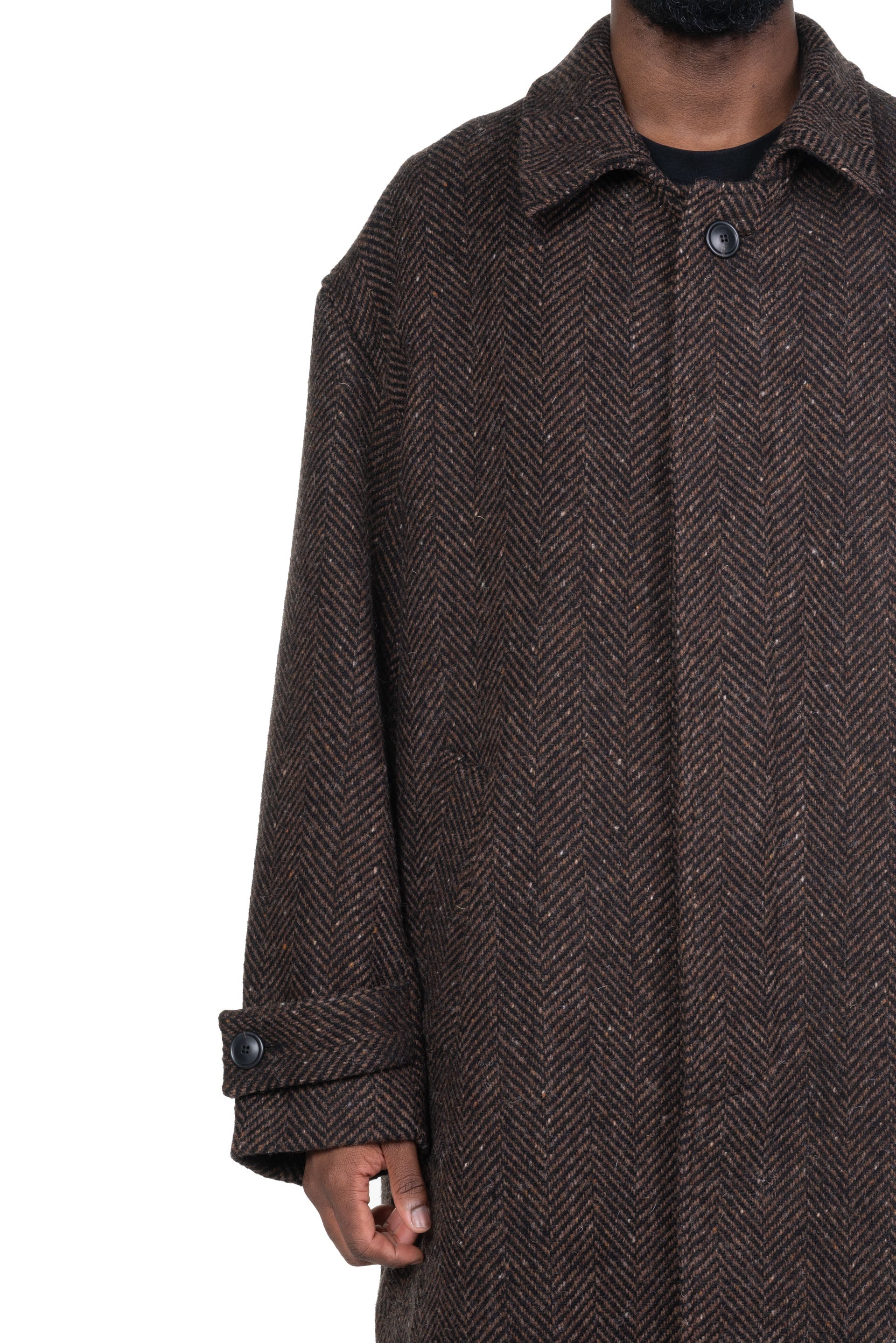 Lownn Mac Overcoat Wool Cashmere Dark Brown. Single breasted. Button closure at front. Two side pockets at Chest. Two pockets at side. Long sleeves. Lined. Oversized fit.