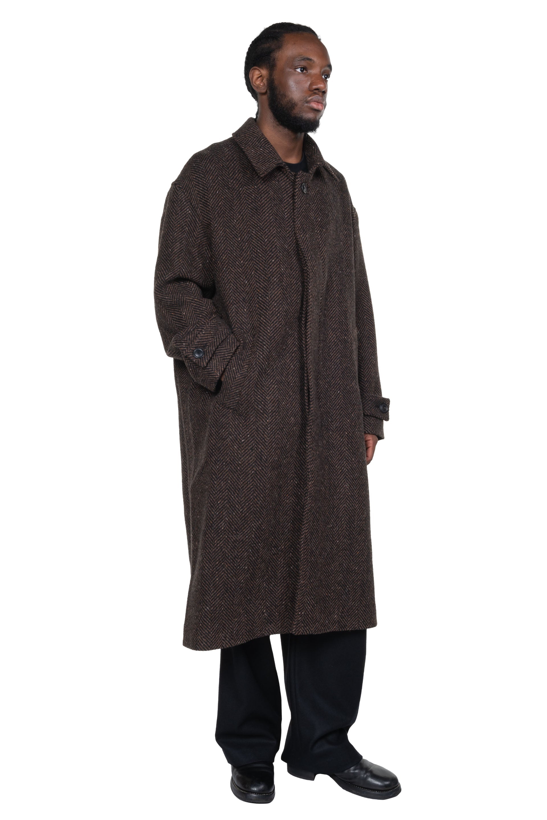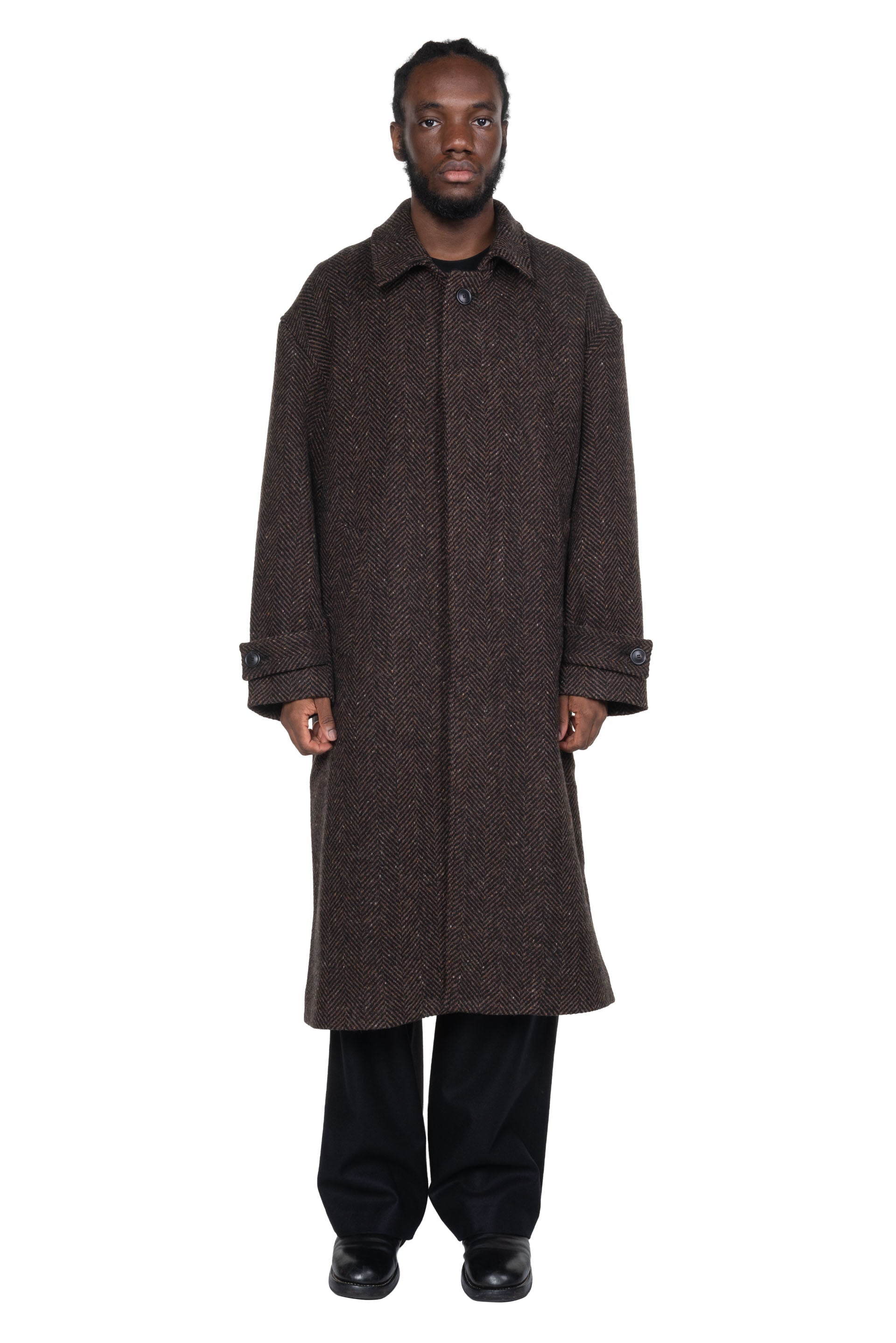 Always in search of uniformity, focusing on form and function rather than thematic seasonal collections, Lownn reinterprets utilitarian menswear with a minimalist and contemporary approach and gives you a testimony of its time as seen with the Mac Overcoat Wool Cashmere Dark Brown.