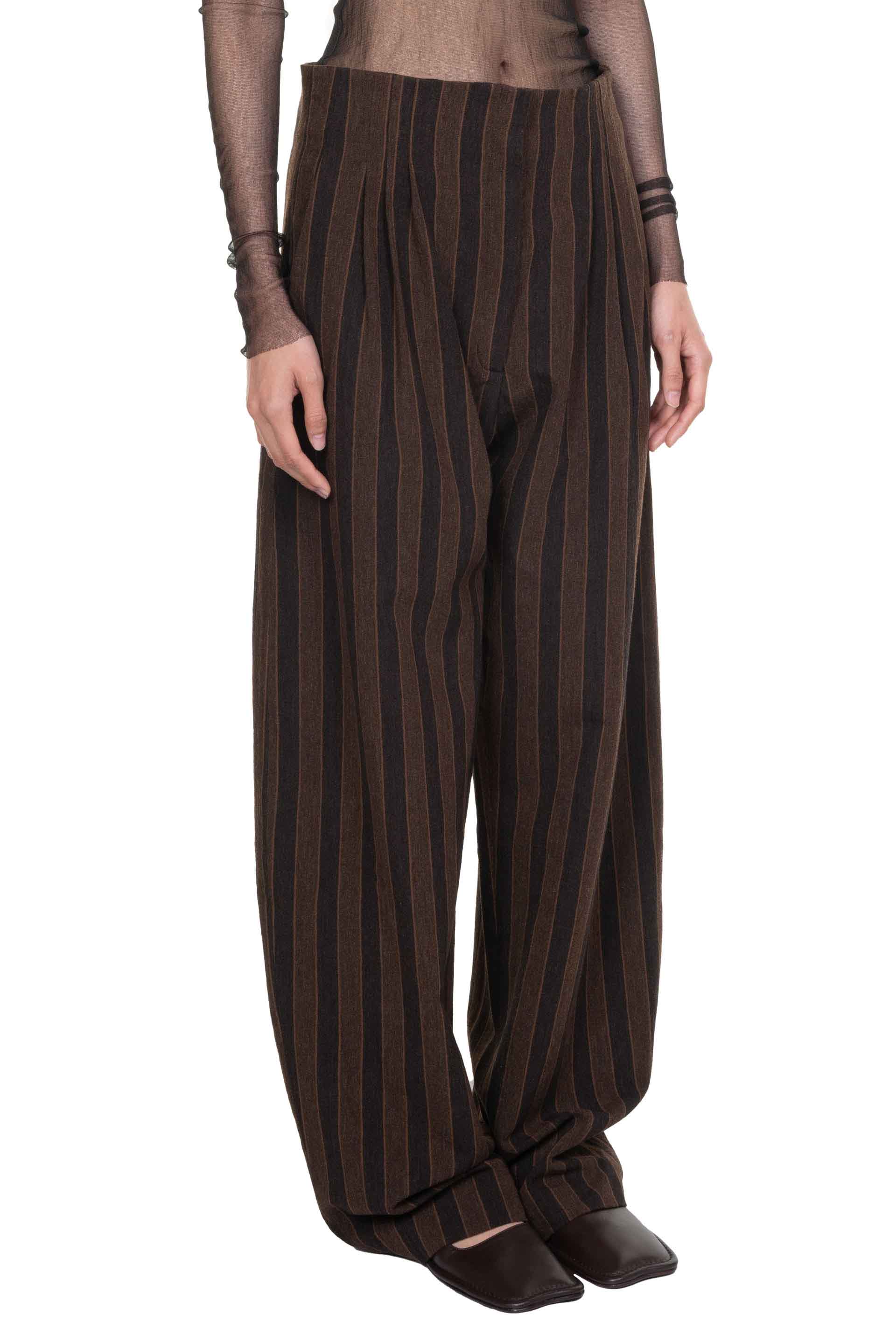 Unisex high-waisted, wide-leg pants with front pleats and side pockets. Made of a striped fabric that combines linen and brown virgin wool. Two side pockets.