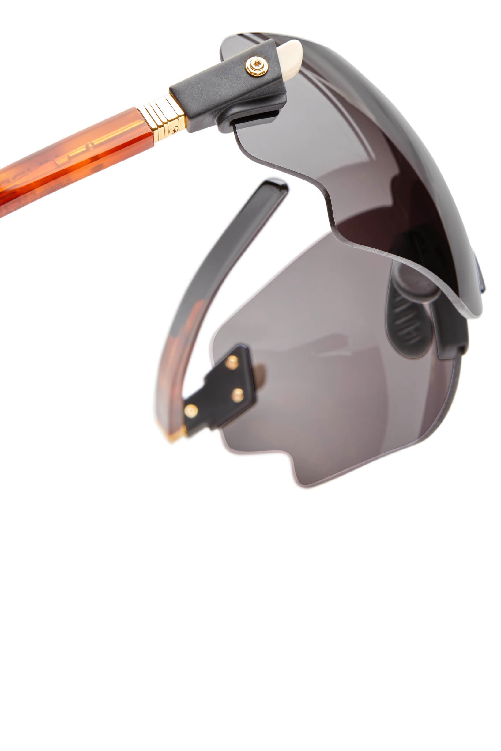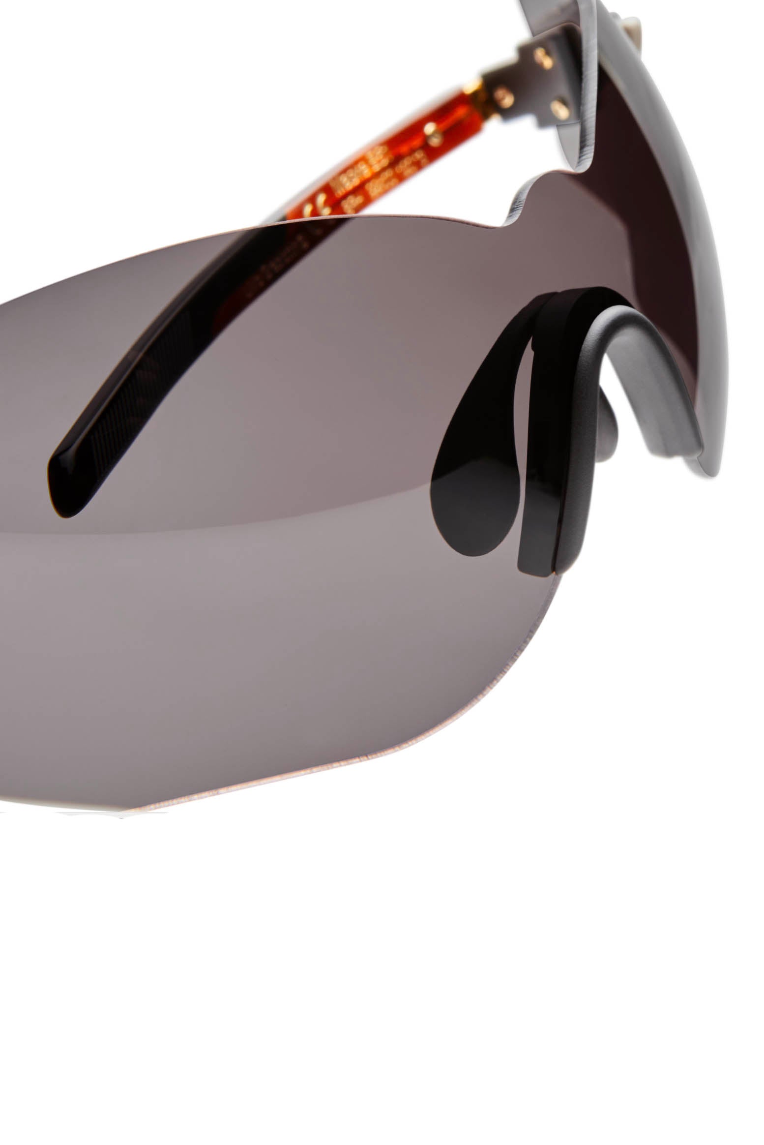 The Mask E51 Black Matt Havana embodies the perfect synergy of a sport look and forward-thinking industrial design. Shield-style rimless frame fitted with ergonomically shaped lenses enhanced with a metal top brow line. These masks exude sophistication whilst surprising with exceptional details, as the gears on the sides and gilled detailing on the temples. Fast-riding, forward-looking, fluid silhouettes that sit at the intersection of luxury and high-tech sportswear.