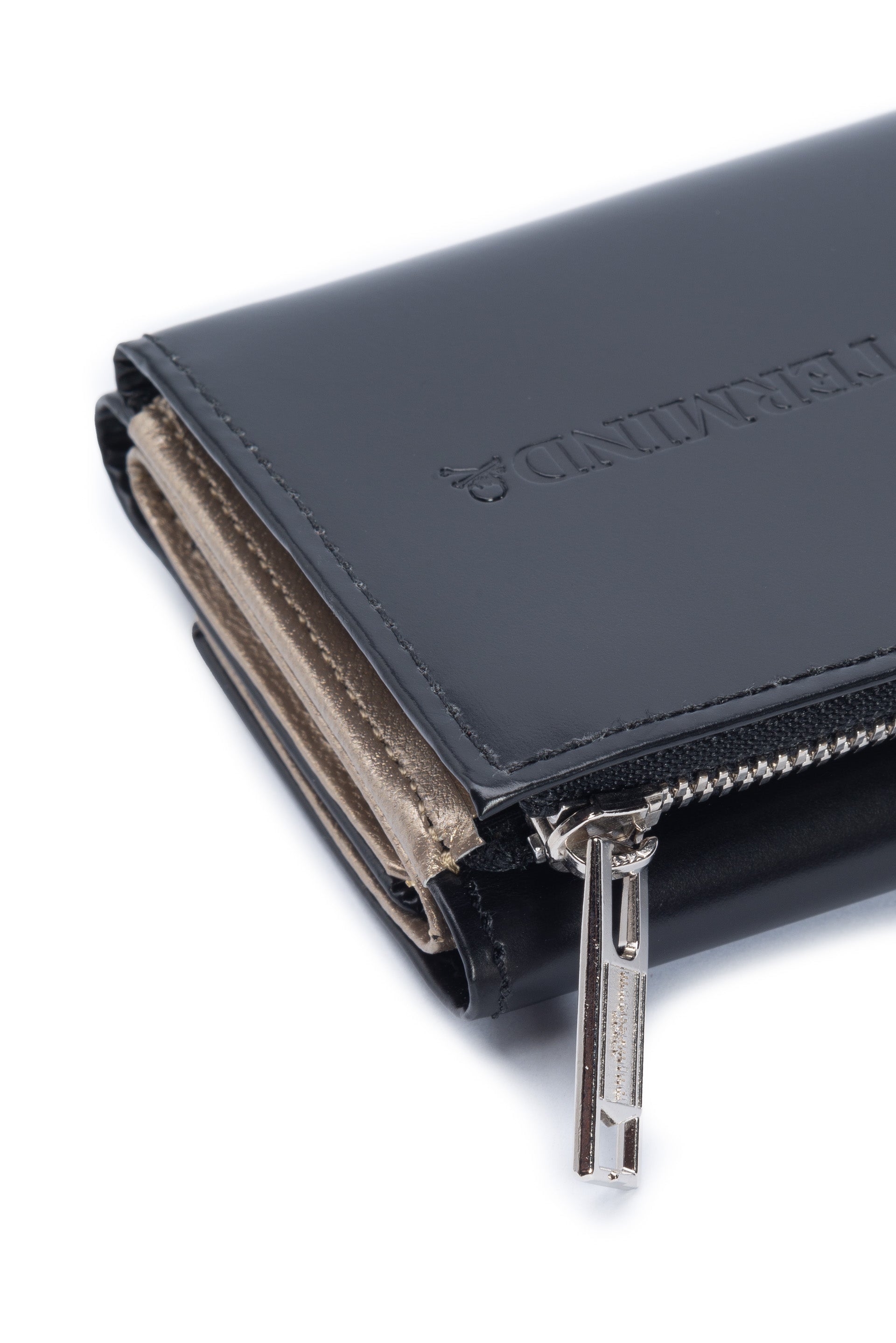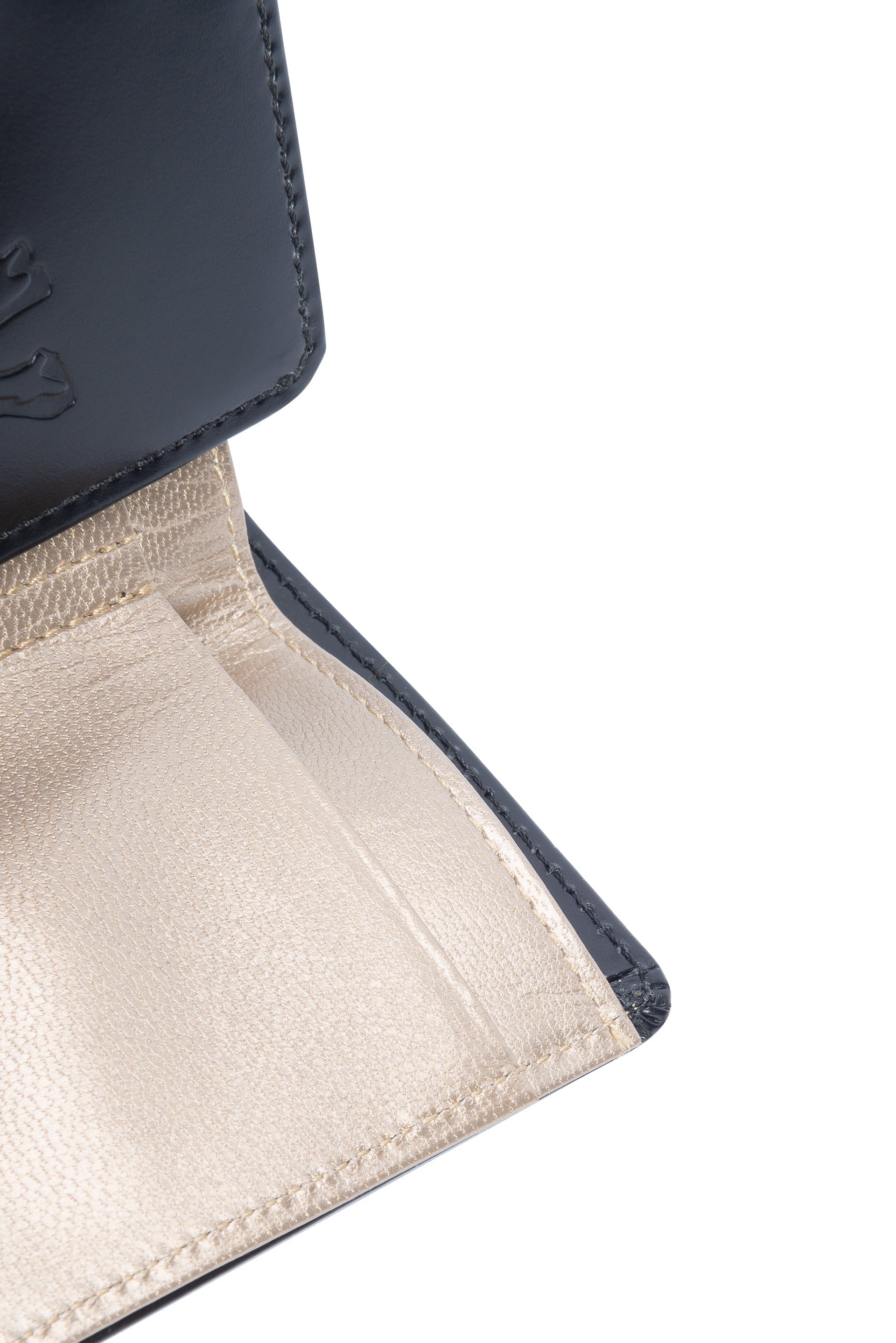 Embossed logo at front. Note slot. Inner coin pocket. 2 inner card slots. Press-stud closure. Gold inner details.