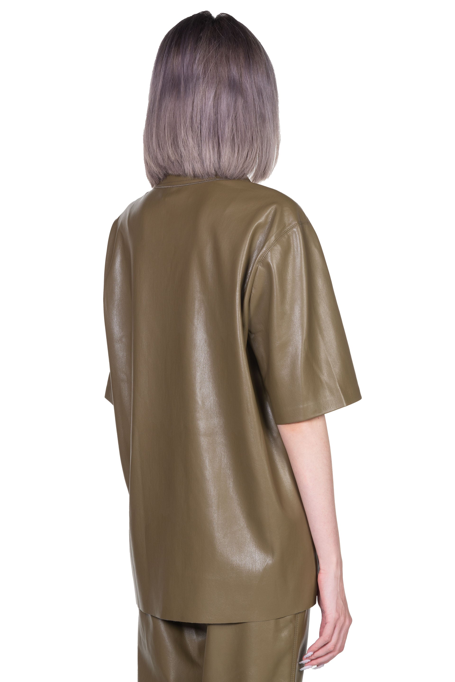 The Mayra shirt is crafted to a short-sleeve silhouette made from supple vegan leather in a versatile olive hue.