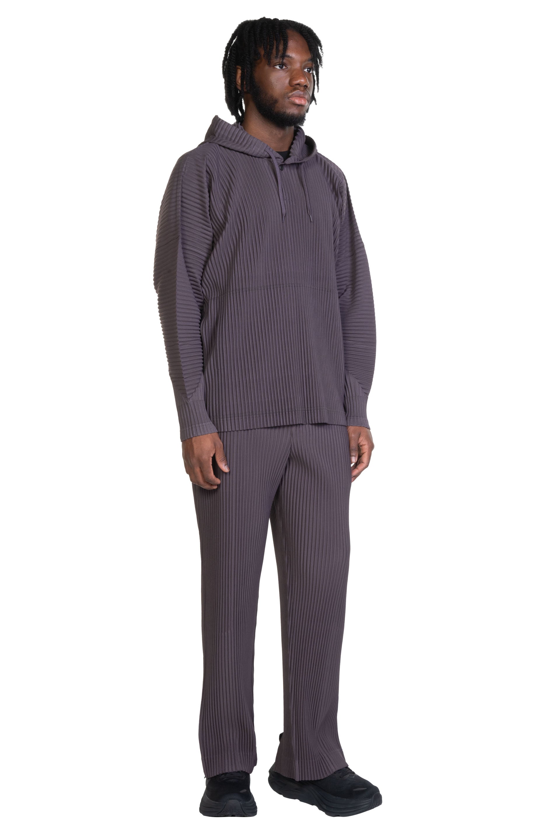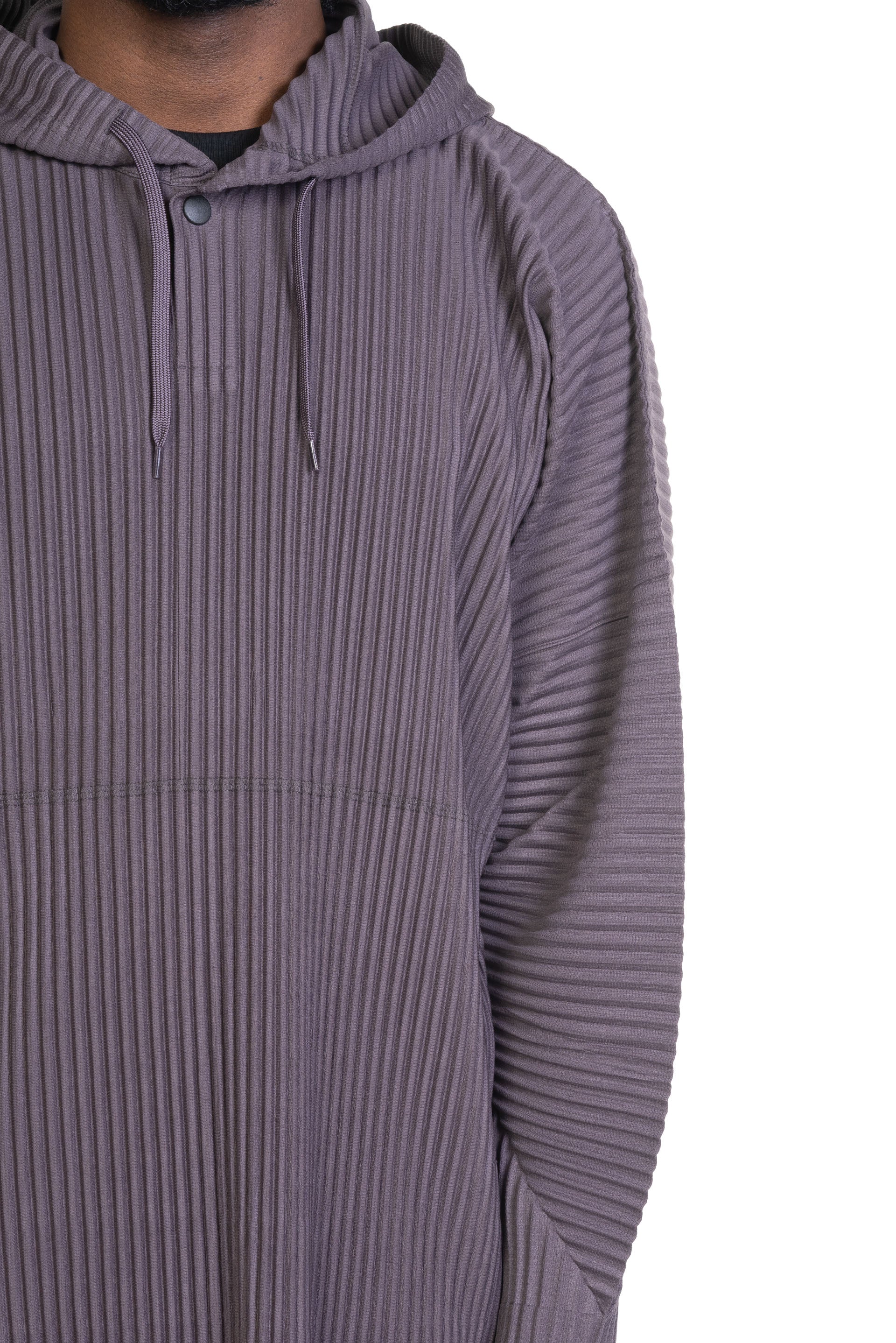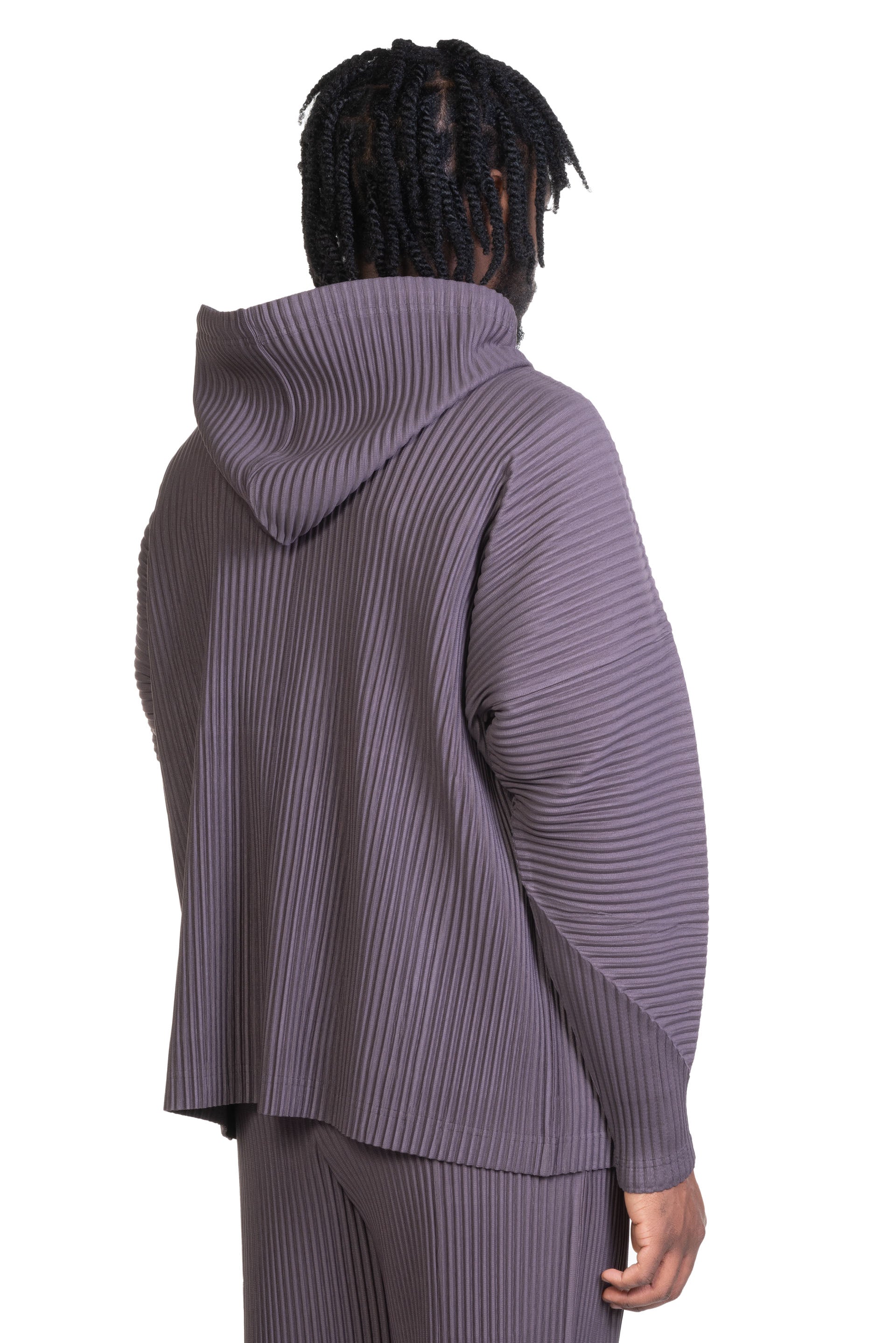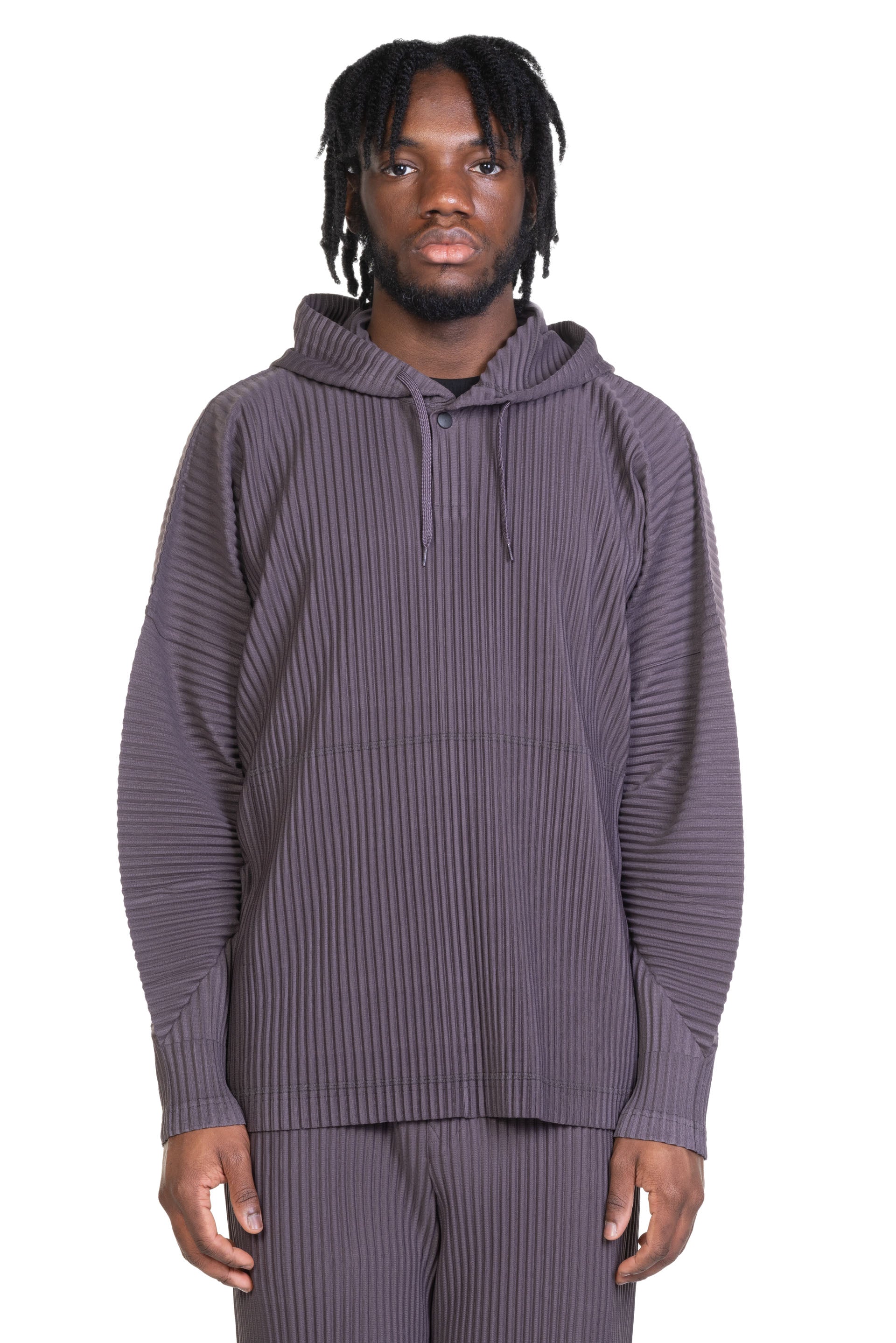 Homme Plisse Hoodie Slate Violet. This black pleated hoodie has a relaxed fit, long sleeves and a large front Kangaroo pocket. Drawstrings at hood. Button closure at neck. Lightweight and breathable fabric.