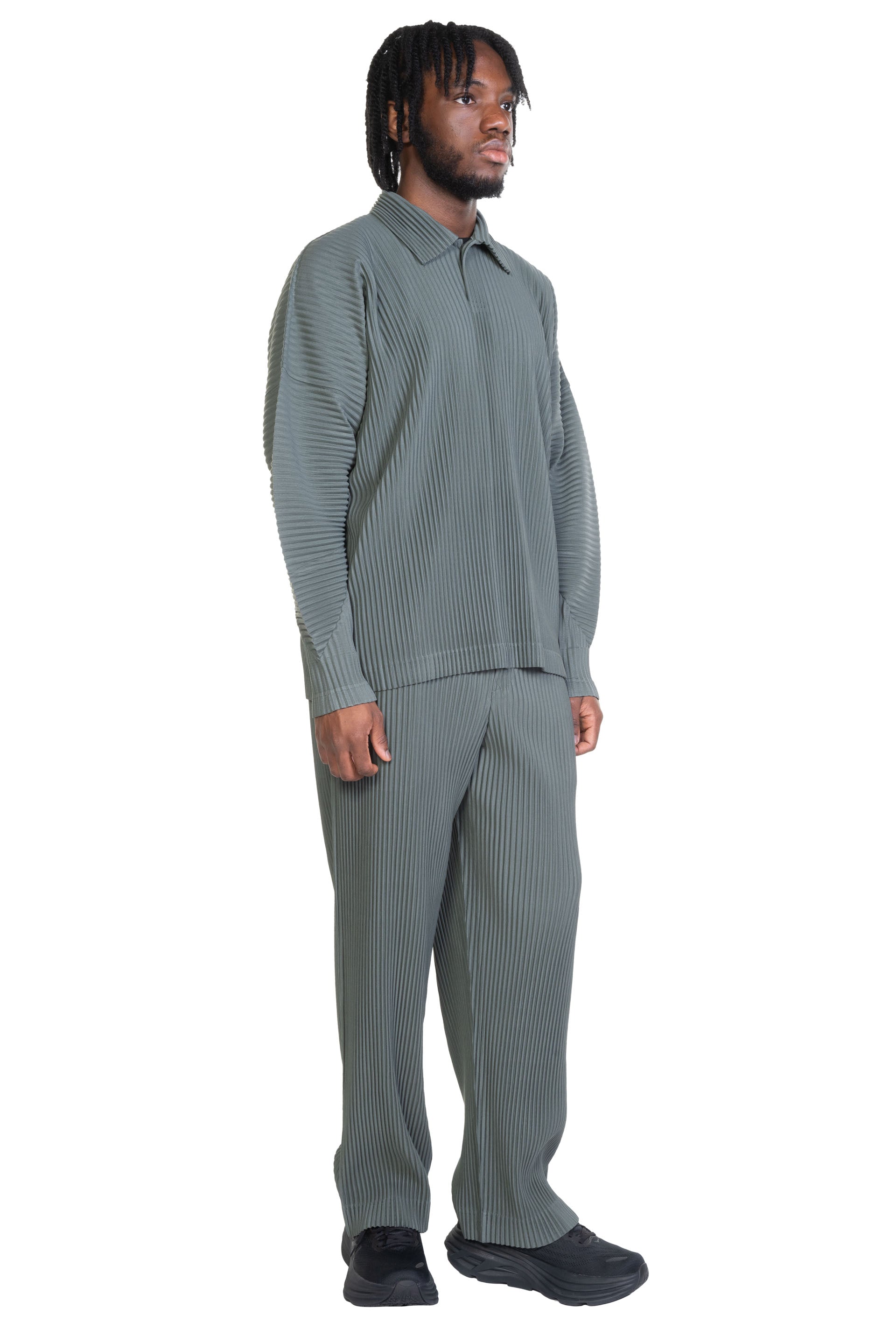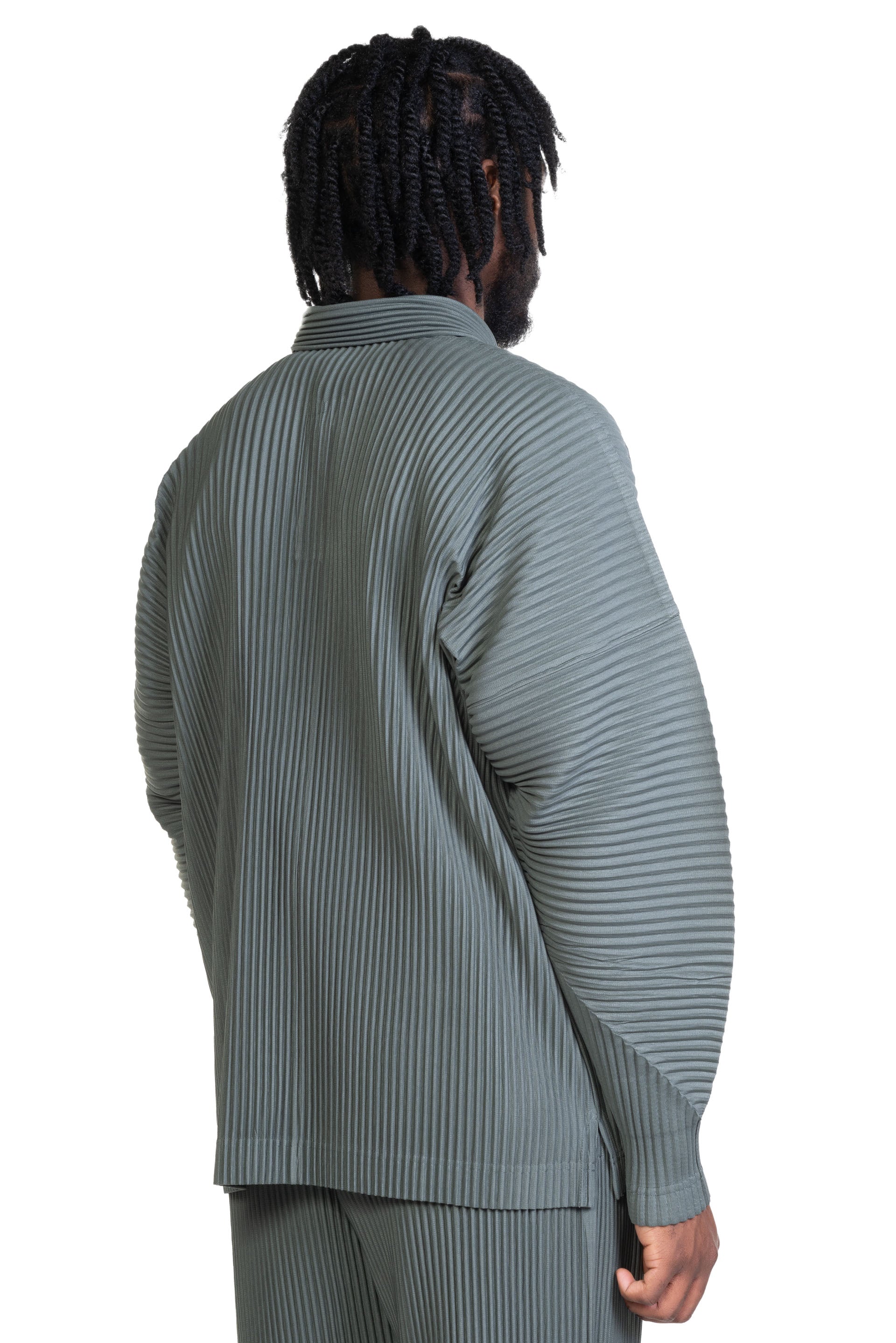 Issey Miyake Homme Plisse MC October Shirt Moss Green. This long-sleeved moss green pleated shirt has a relaxed fit and an open collar with a one-button closure.