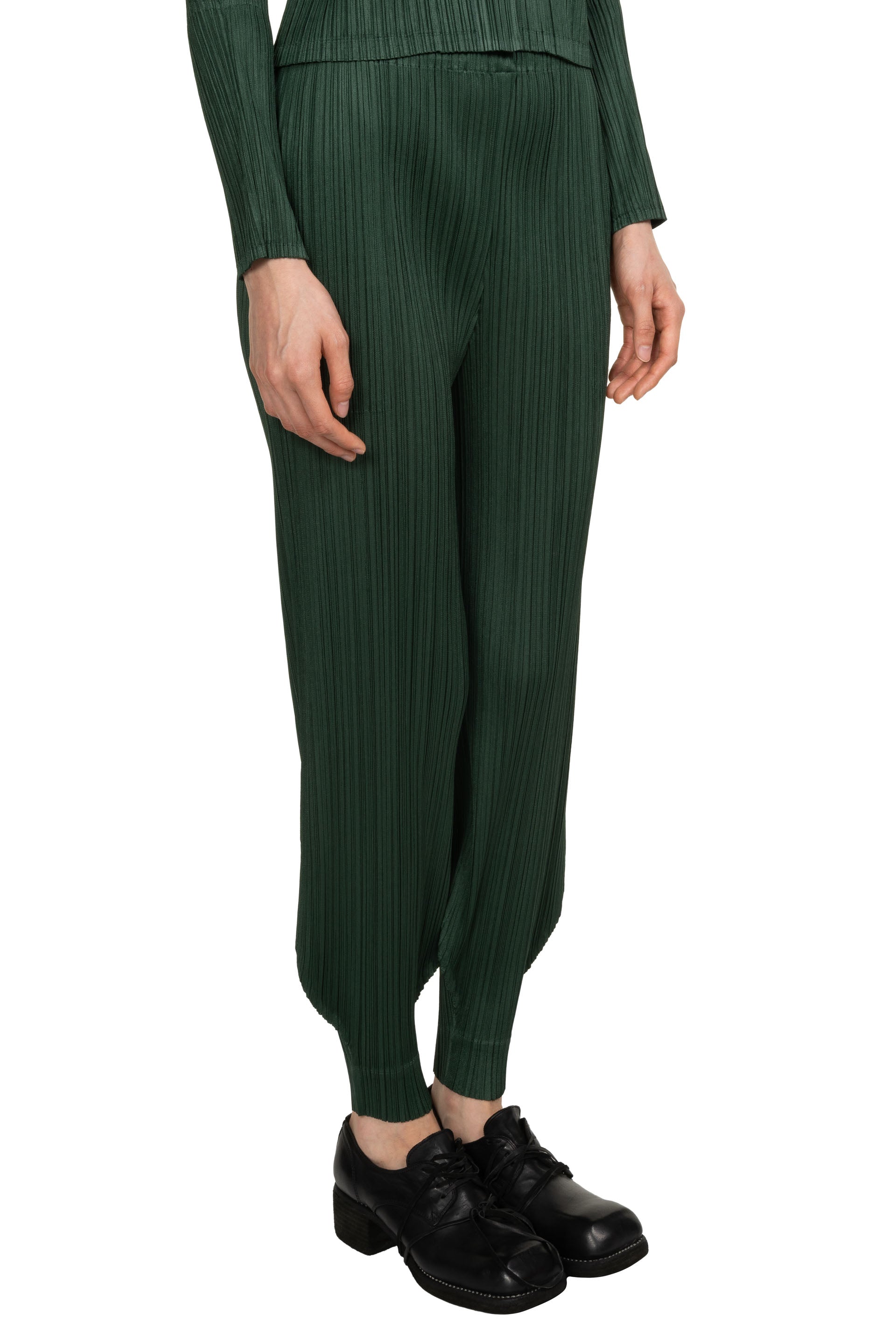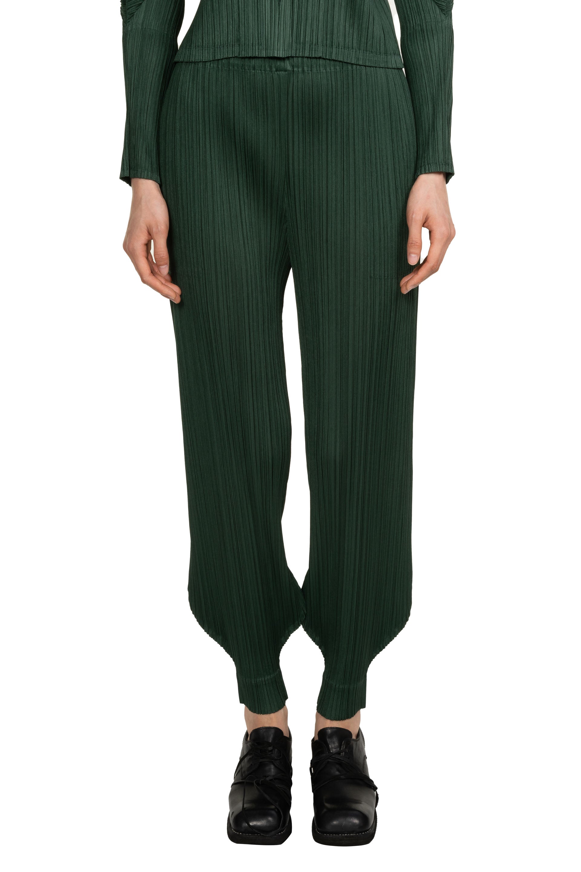 Pleats Please is crafted from a single thread, then creases are added after the clothes have been sewn into shape offering a combination of convenience, comfort and coolness. Pleats Please designs are simple with a strong silhouette as seen with the MC October Trousers Deep Green.
