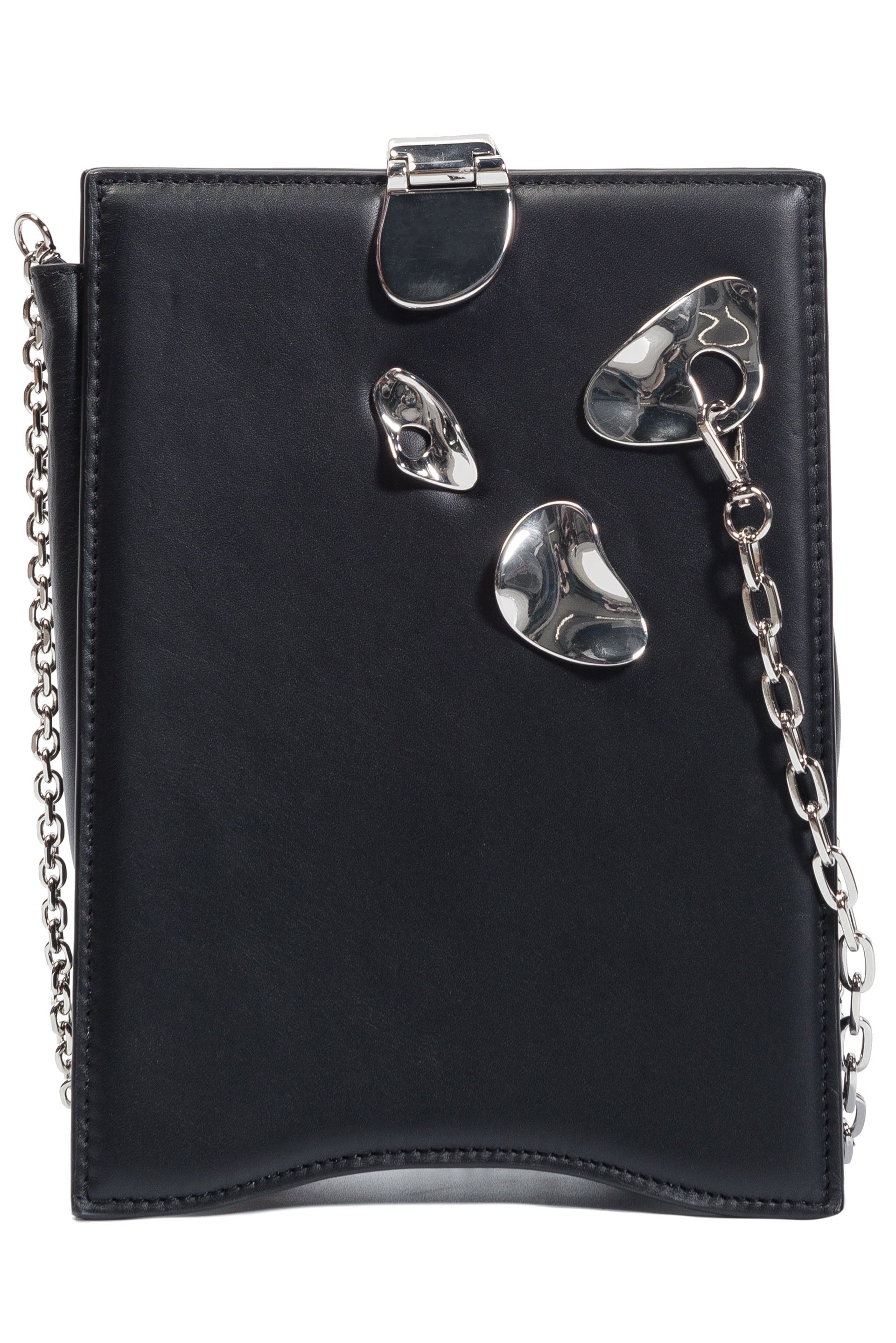 Leather in a smooth grain finish. Snap-fastening. Front plaque with chain trim. Front foil-stamped logo. Silver-tone metal hardware. One main compartment.