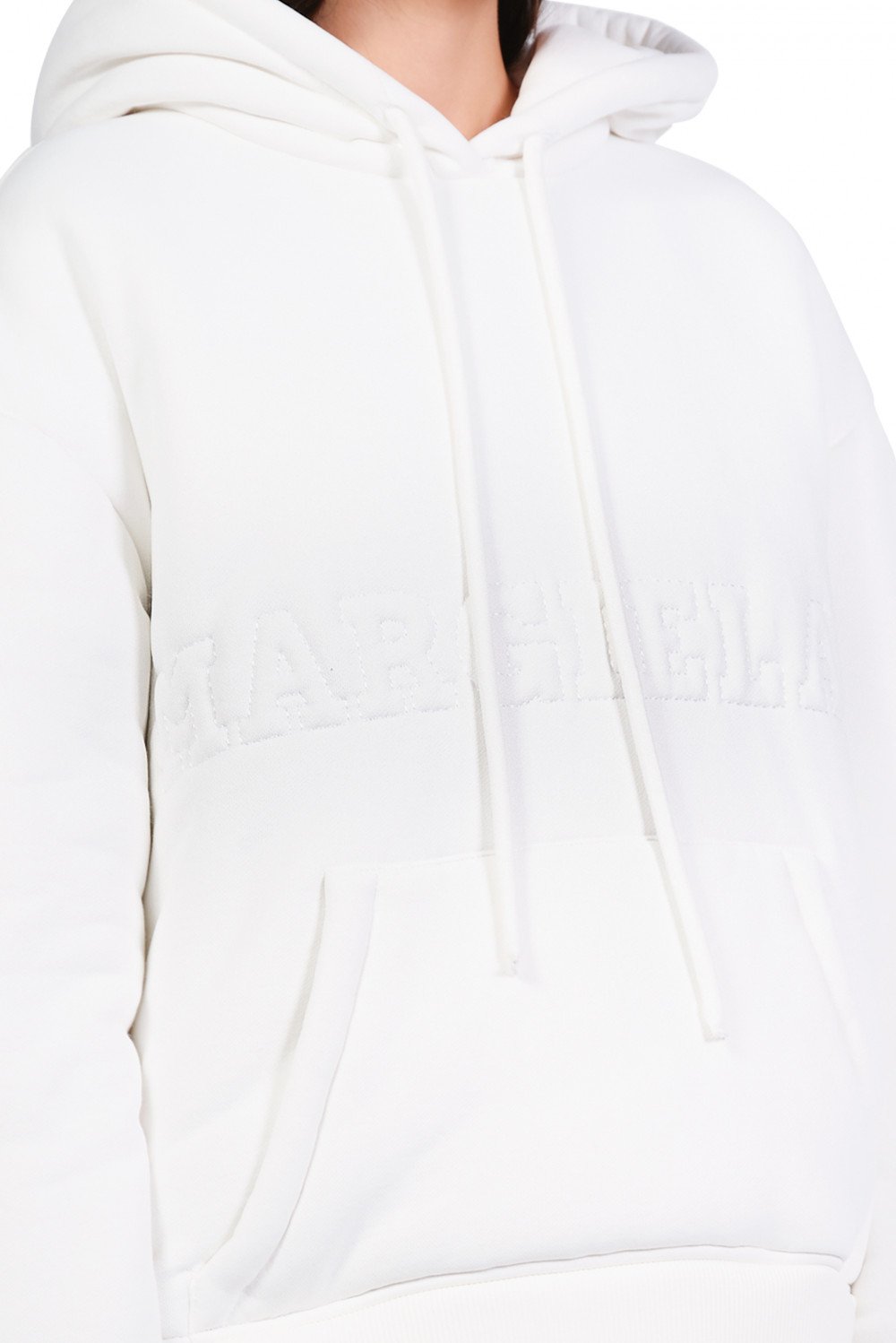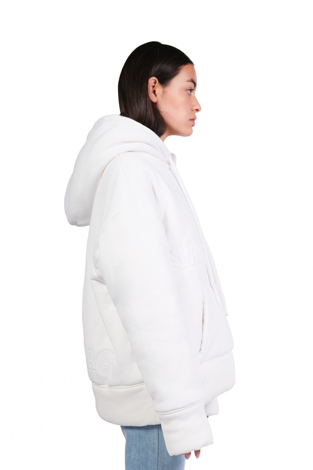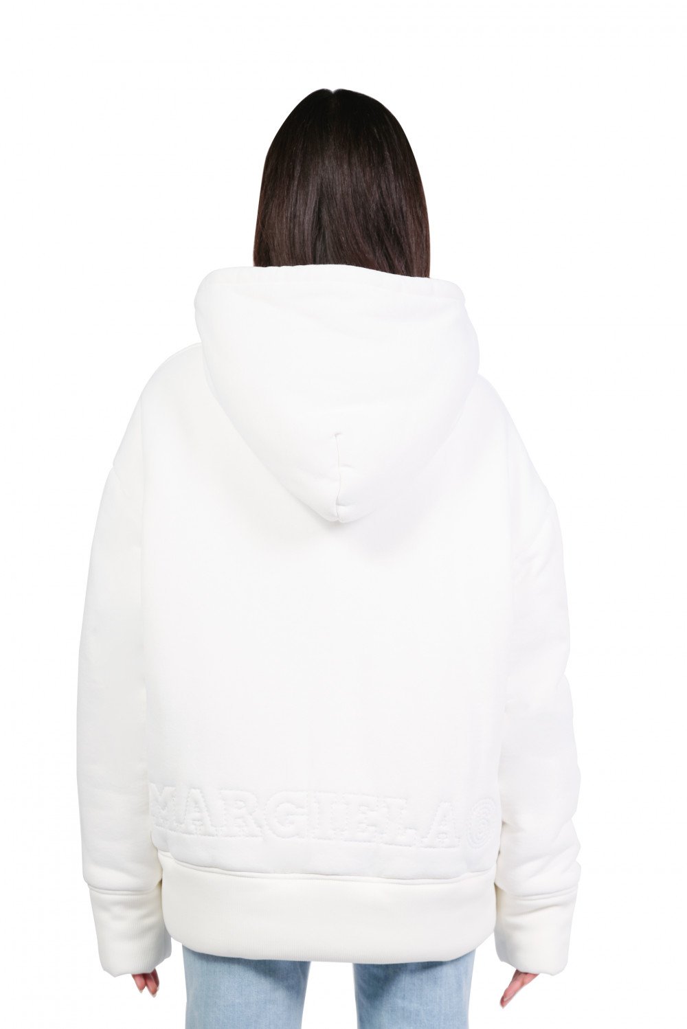 MM6 is known for its sporty ready-to-wear and off-beat accessories, more casual, street-inspired take on the Maison's intellectual approach to luxury as seen in the White Padded Hoodie.