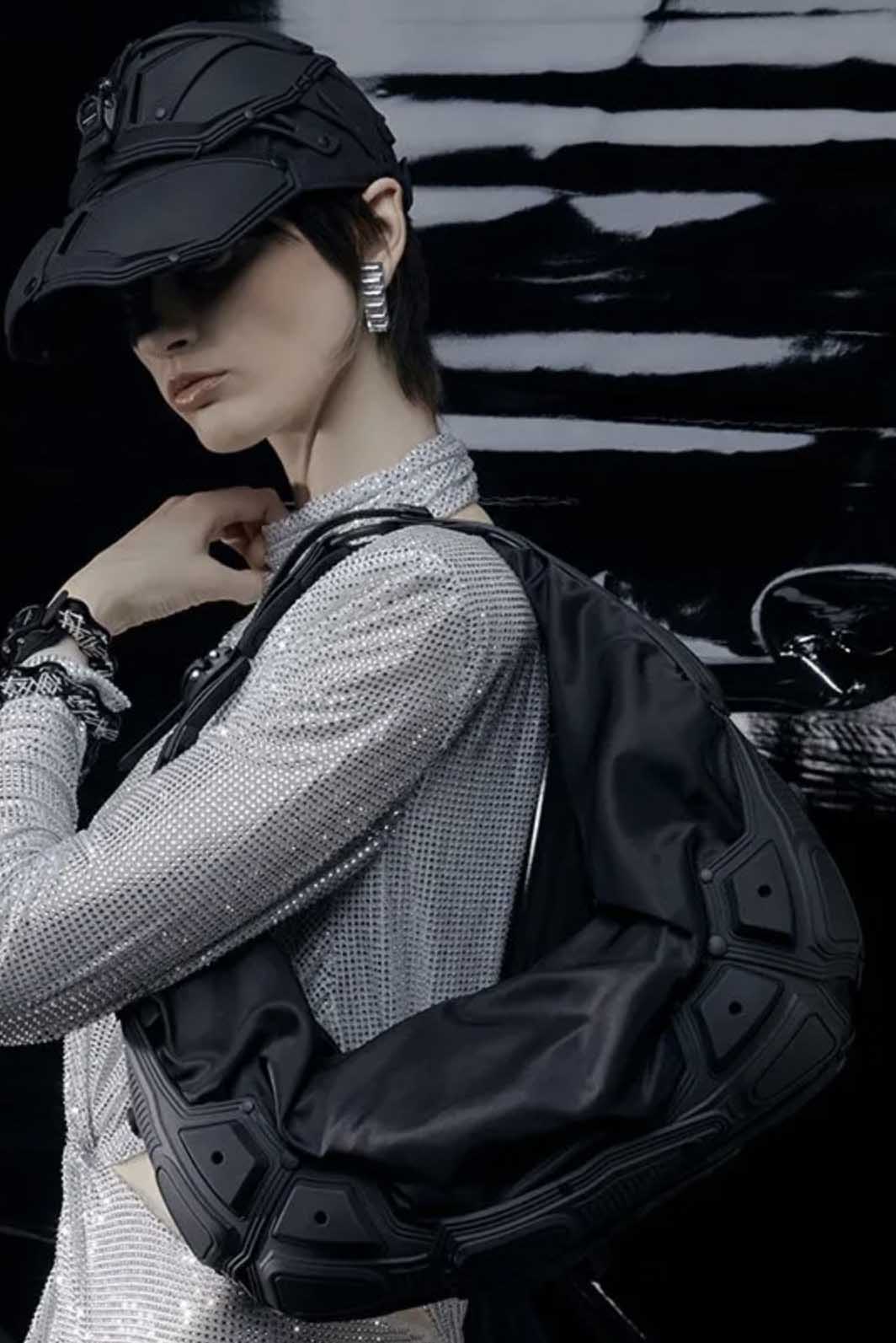 Innerraum is a transformative design philosophy that translates language into polyphonic objects, redefining luxury as an ecstatic conflict with the subconscious. It emphasizes the body as both extension and metaphor, where objects like bags become shells for personal belongings and experiences. Through the integration of disparate parts from different imaginaries and histories, Innerraum creates unique, evolving objects that embody transformation and a new aesthetic, reflecting the fluidity and complexity of the self as seen with the Module M03 Half Moon Bag Black Matt Black.