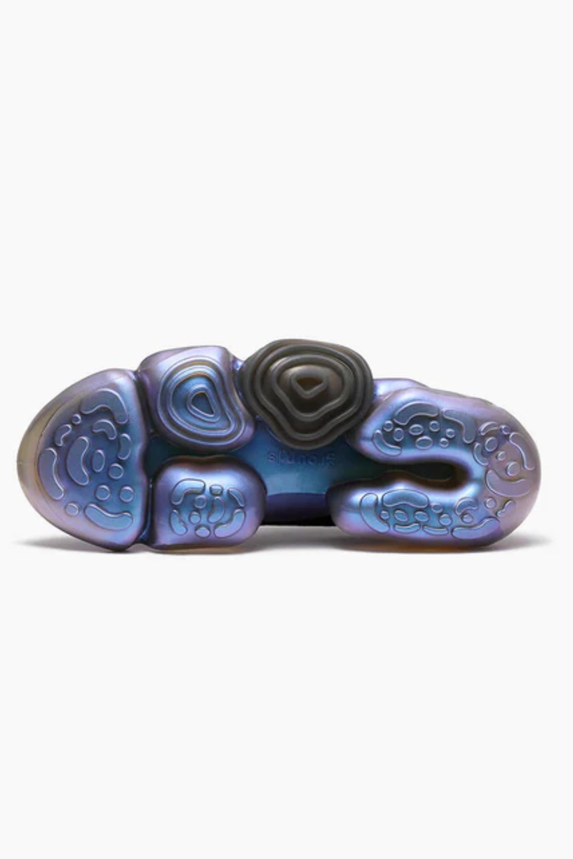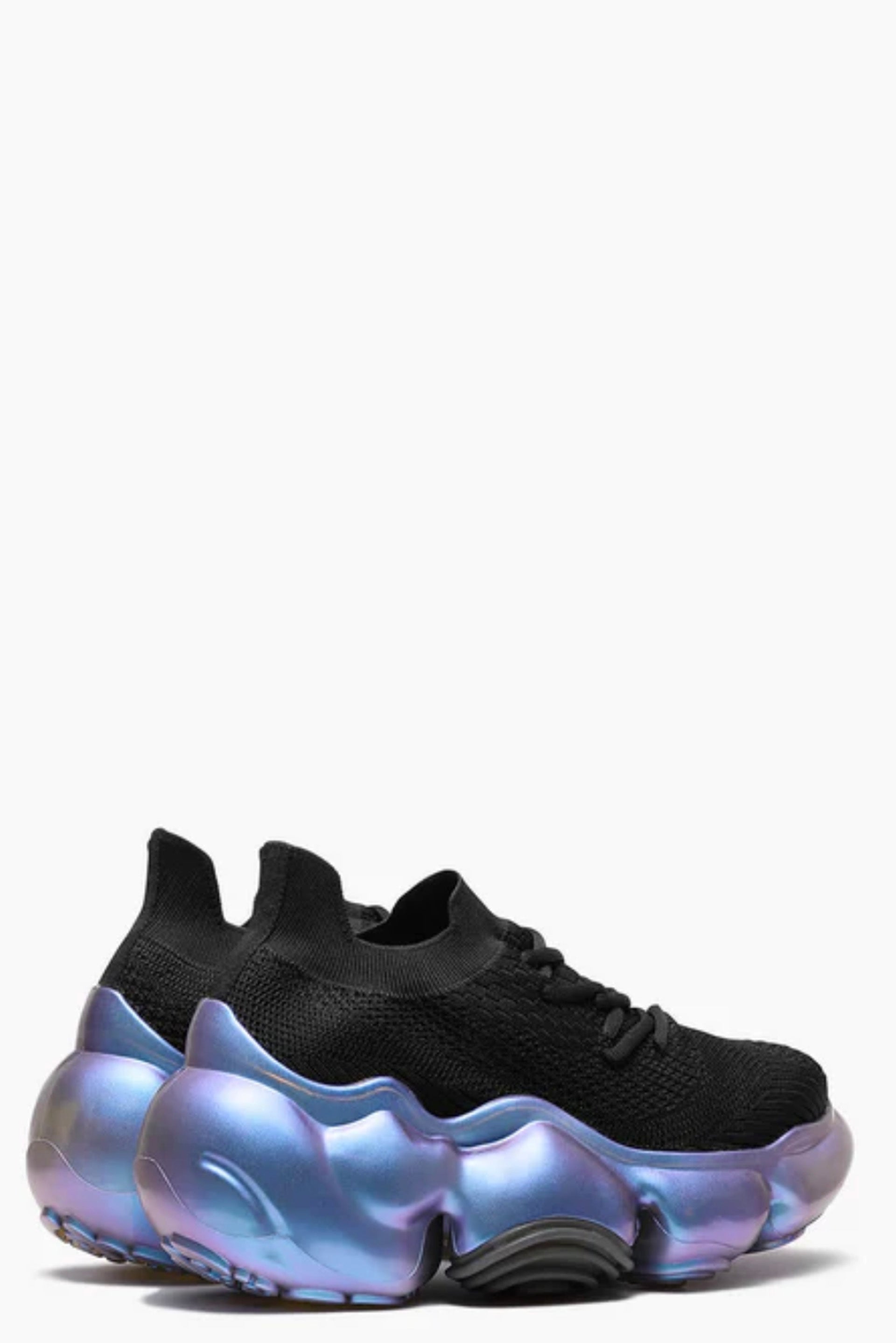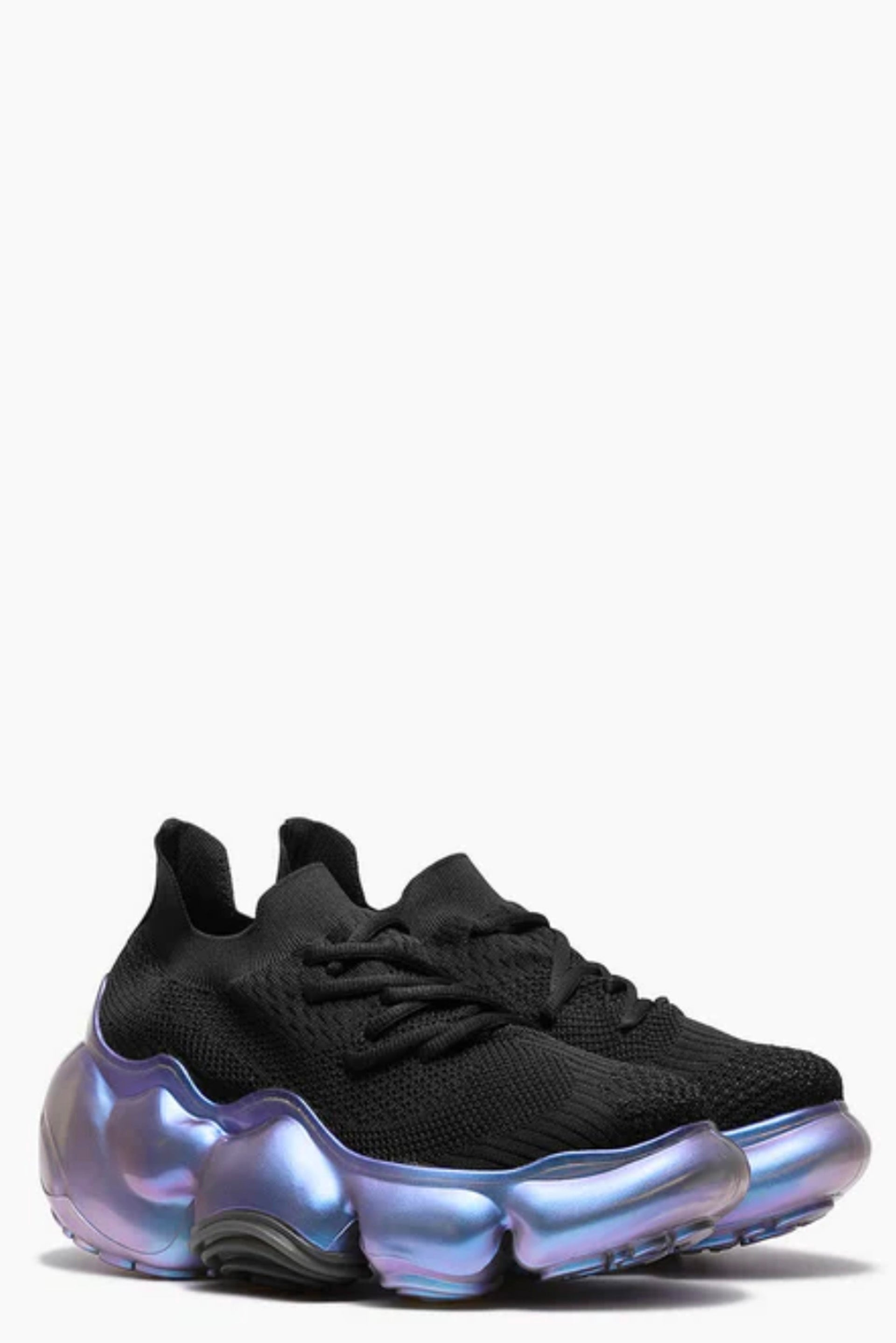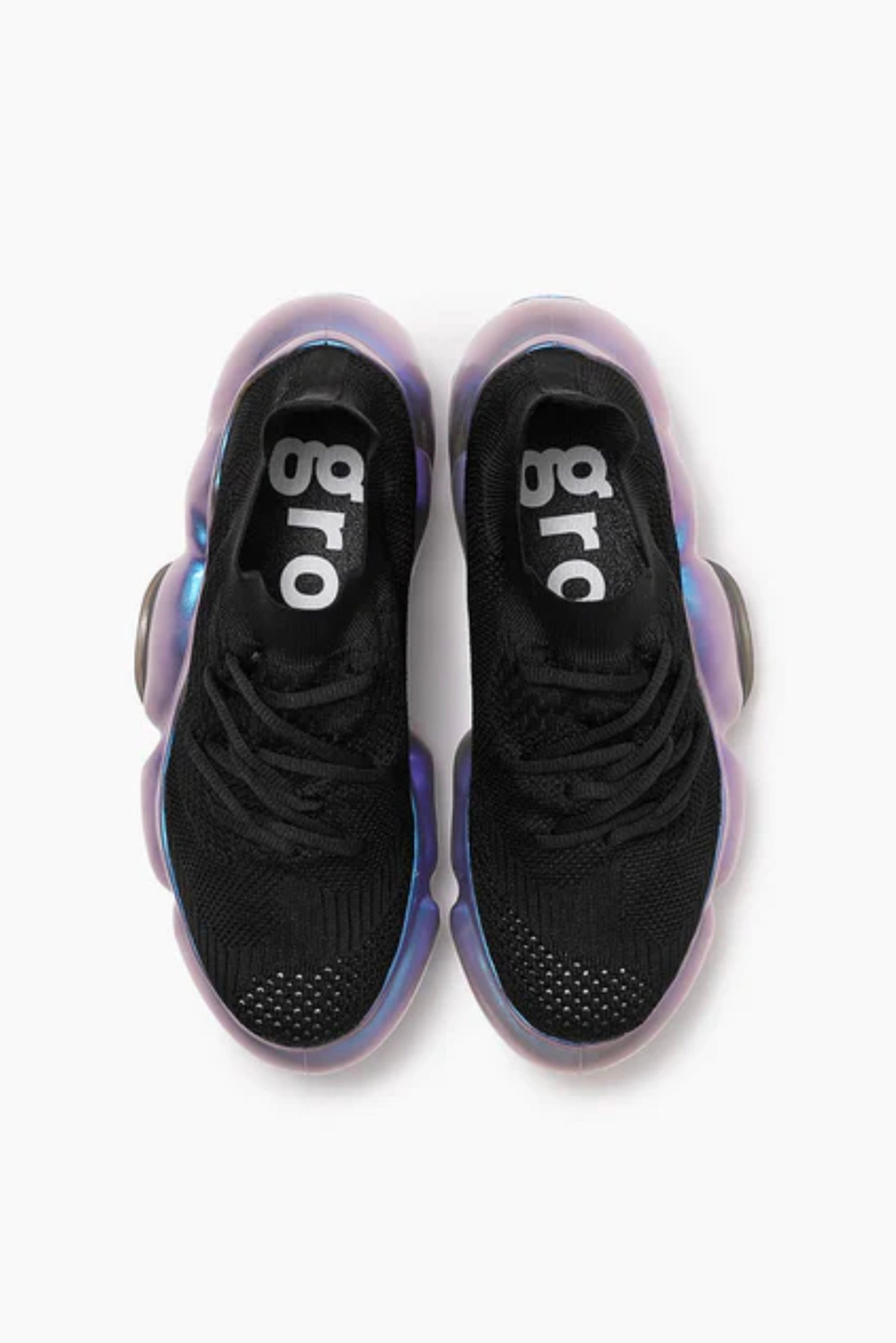 Grounds translates the pulse of Japanese youth into bold shoe design as seen with the Moopie Aurora Black Black. Footwear that looks as if you have stepped on something huge and gel-like The outsole, which is supposed to be sturdy to support the entire body, is deliberately made to look fluid and soft, a design that tickles the playful spirit. The rubber parts on the outside add an accent to the design. The upper has a delicate finish in contrast to the voluminous soles. The sharp shape, the nape of the foot, and the gentle slope from the toe to the heel give the impression of an elegant and slender style that is not found in existing sneakers. The asymmetrical layout of the shoe holes and pattern on the knit upper is a continuation of the abstract design of the outsole. Despite the thick soles, the entire sole is designed to support the body and provide adequate cushioning to prevent walking fatigue.