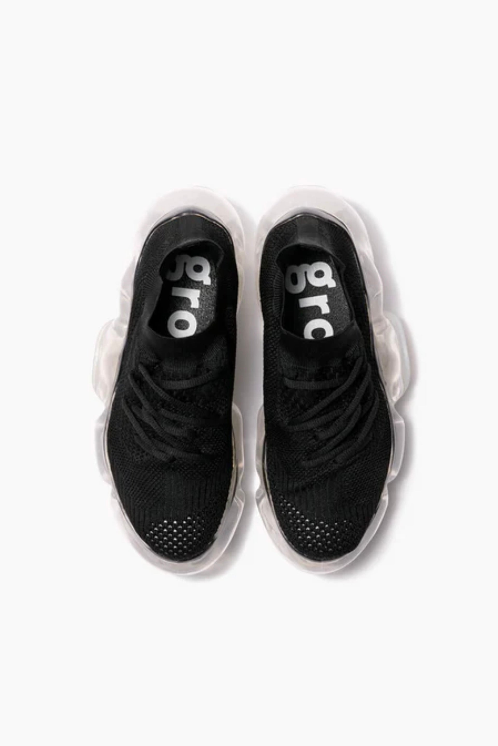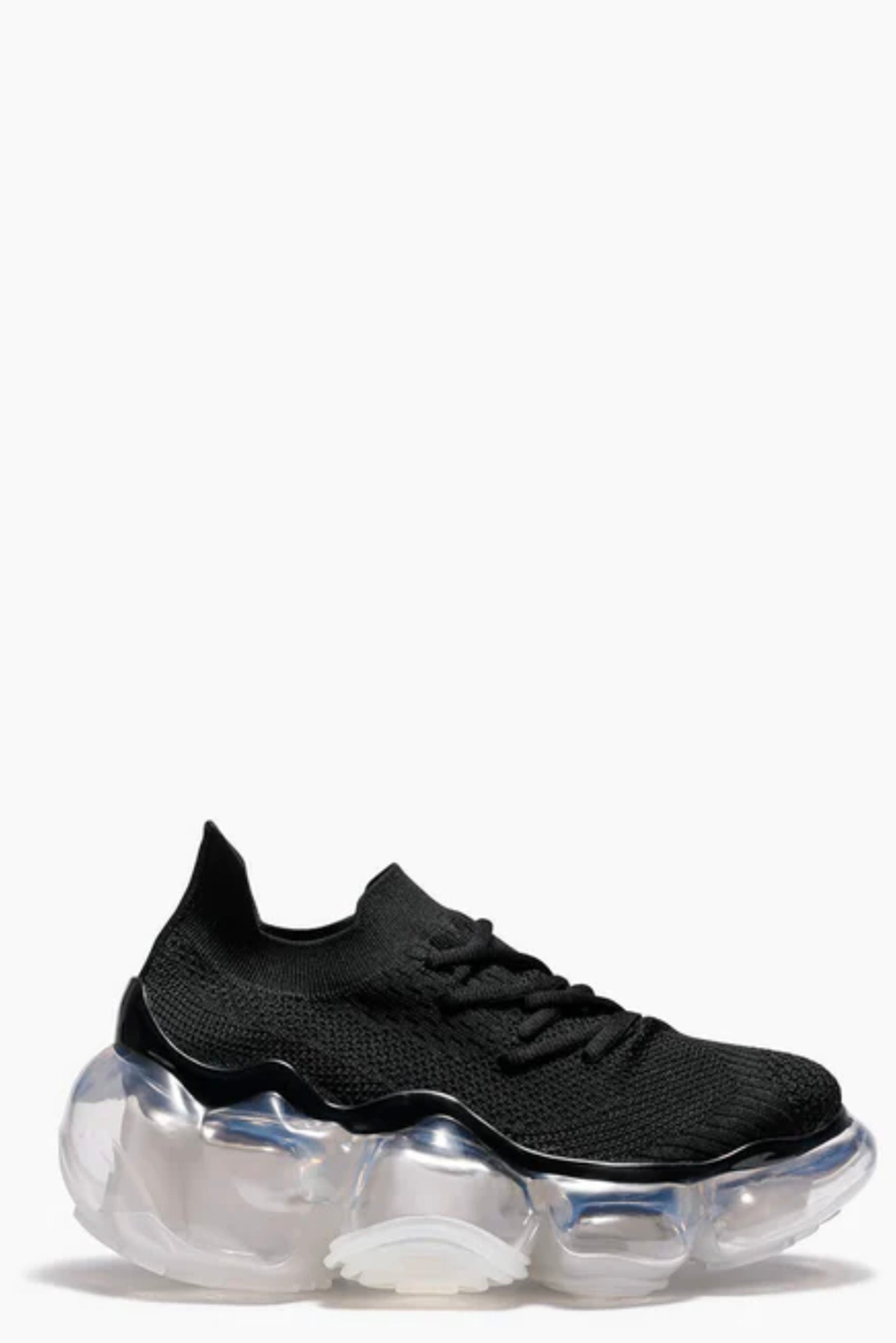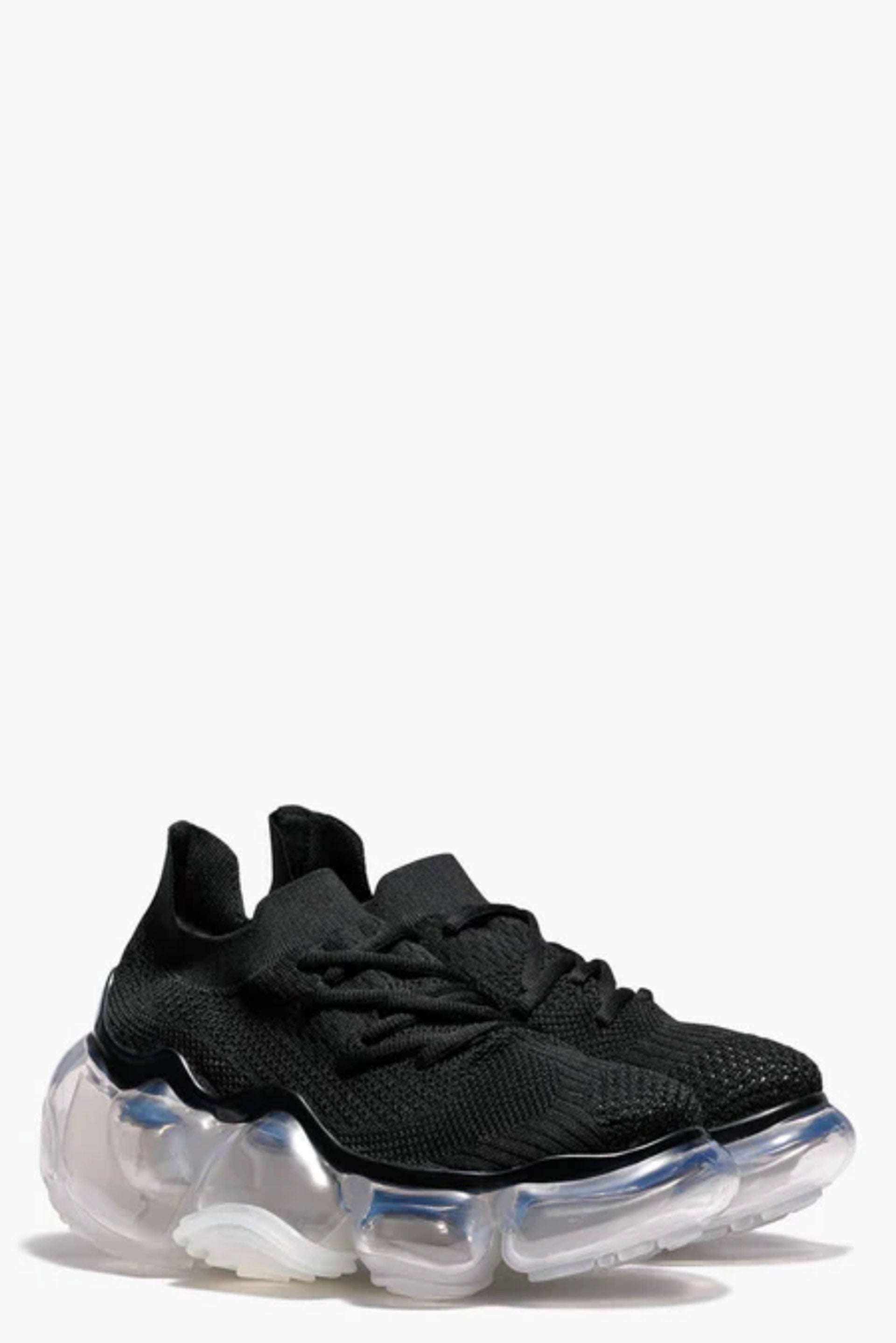 Grounds translates the pulse of Japanese youth into bold shoe design as seen with the Moopie Black Clear. Footwear that looks as if you have stepped on something huge and gel-like The outsole, which is supposed to be sturdy to support the entire body, is deliberately made to look fluid and soft, a design that tickles the playful spirit. The rubber parts on the outside add an accent to the design. The upper has a delicate finish in contrast to the voluminous soles. The sharp shape, the nape of the foot, and the gentle slope from the toe to the heel give the impression of an elegant and slender style that is not found in existing sneakers. The asymmetrical layout of the shoe holes and pattern on the knit upper is a continuation of the abstract design of the outsole. Despite the thick soles, the entire sole is designed to support the body and provide adequate cushioning to prevent walking fatigue.