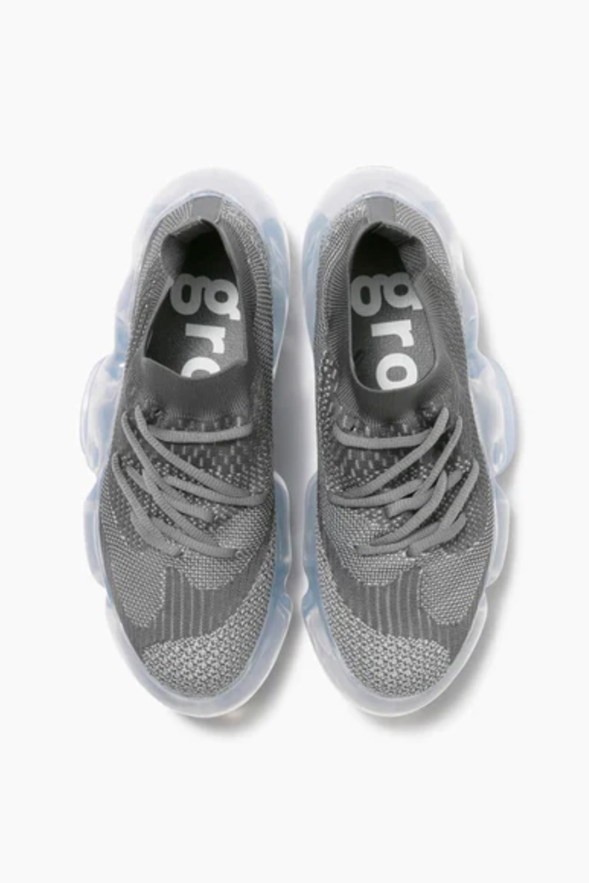 Grounds translates the pulse of Japanese youth into bold shoe design as seen with the Moopie Charcoal Ice Gray. Footwear that looks as if you have stepped on something huge and gel-like The outsole, which is supposed to be sturdy to support the entire body, is deliberately made to look fluid and soft, a design that tickles the playful spirit. The rubber parts on the outside add an accent to the design. The upper has a delicate finish in contrast to the voluminous soles. The sharp shape, the nape of the foot, and the gentle slope from the toe to the heel give the impression of an elegant and slender style that is not found in existing sneakers. The asymmetrical layout of the shoe holes and pattern on the knit upper is a continuation of the abstract design of the outsole. Despite the thick soles, the entire sole is designed to support the body and provide adequate cushioning to prevent walking fatigue.