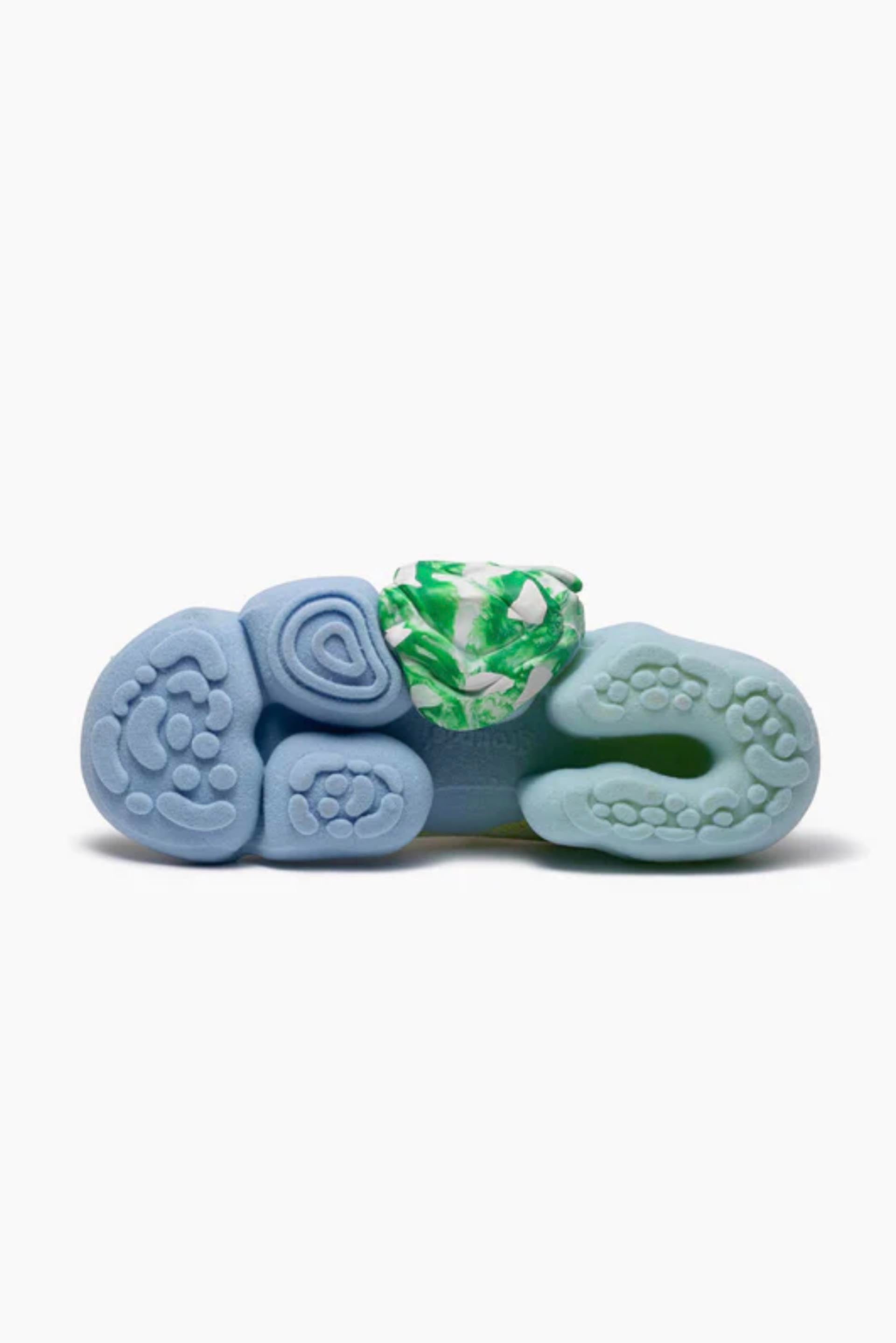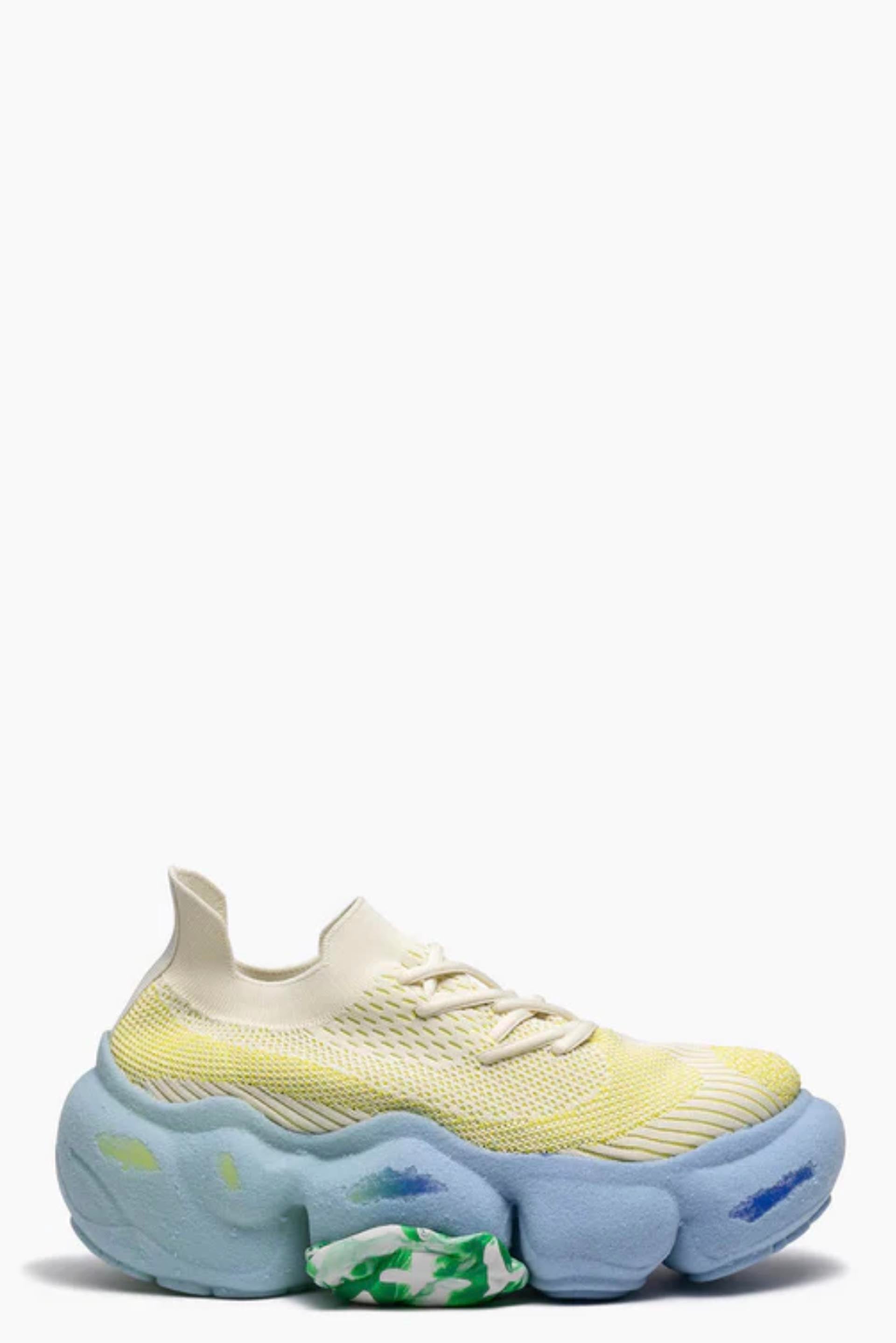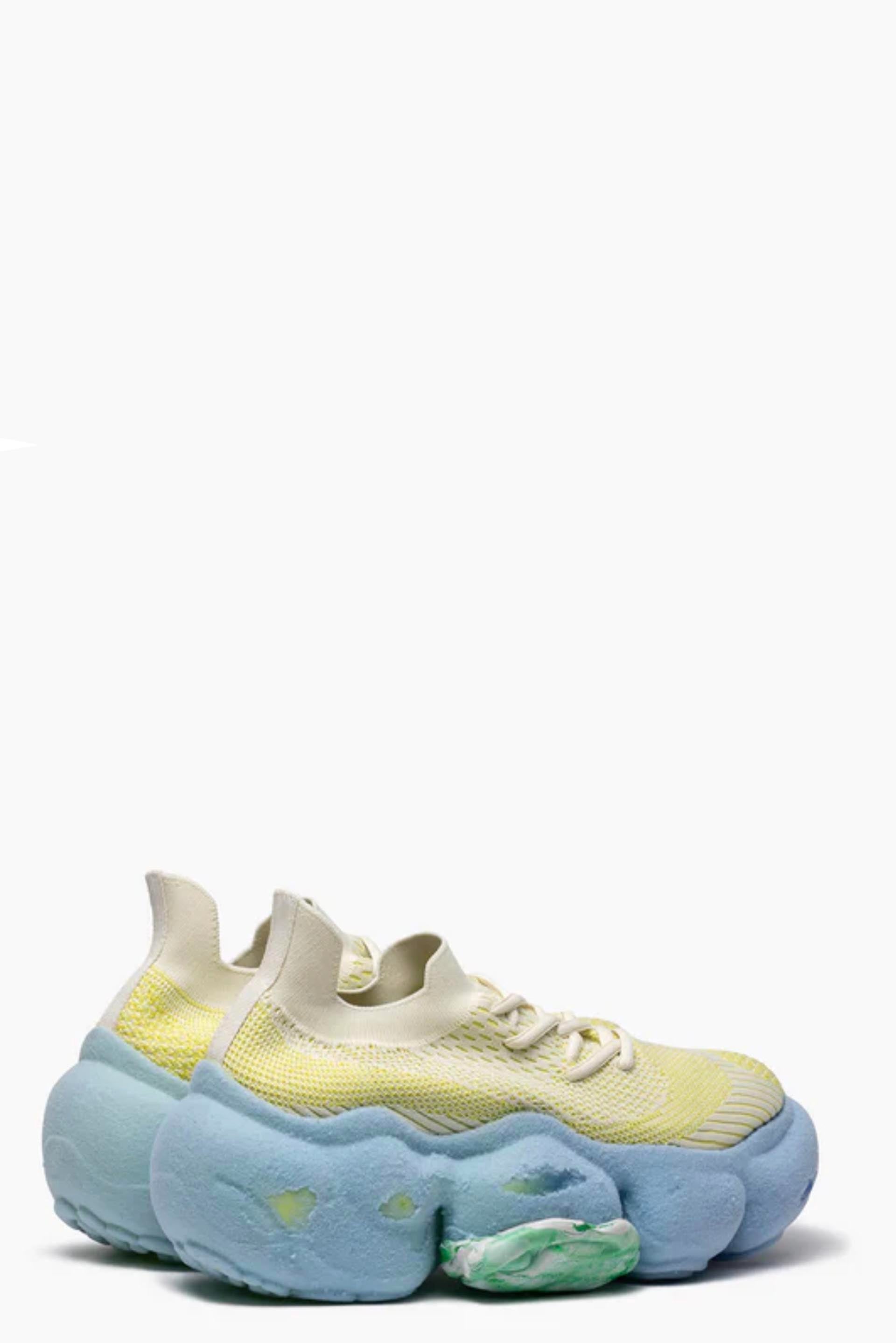 Footwear that looks as if you have stepped on something huge and gel-like. The outsole, which is supposed to be sturdy to support the entire body, is deliberately made to look fluid and soft, a design that tickles the playful spirit. The rubber parts on the outside add an accent to the design. The upper has a delicate finish in contrast to the voluminous soles. The sharp shape, the nape of the foot, and the gentle slope from the toe to the heel give the impression of an elegant and slender style that is not found in existing sneakers. The asymmetrical layout of the shoe holes and pattern on the knit upper is a continuation of the abstract design of the outsole. Despite the thick soles, the entire sole is designed to support the body and provide adequate cushioning to prevent walking fatigue.