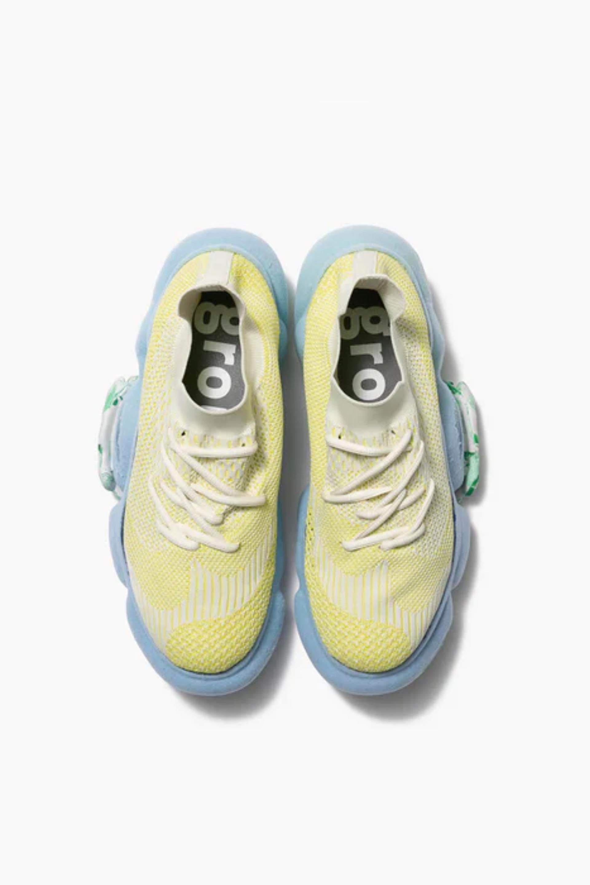Grounds translates the pulse of Japanese youth into bold shoe design as seen with the Moopie Flocky Scratch Cream Lemon / Azure Blue.