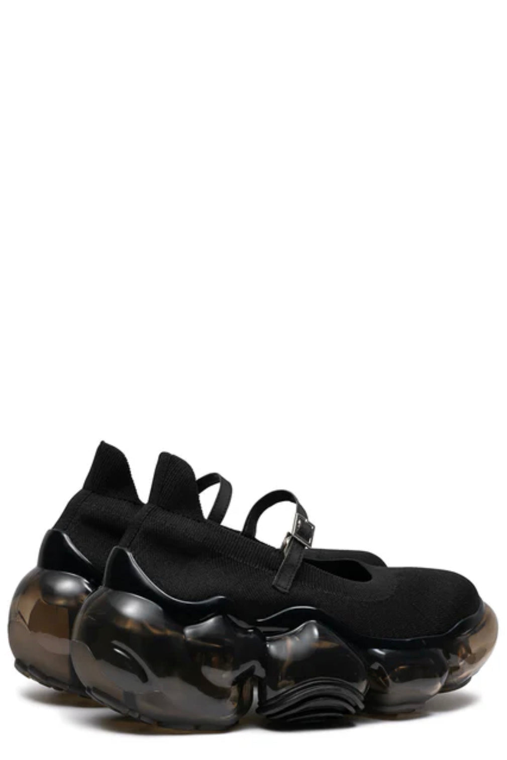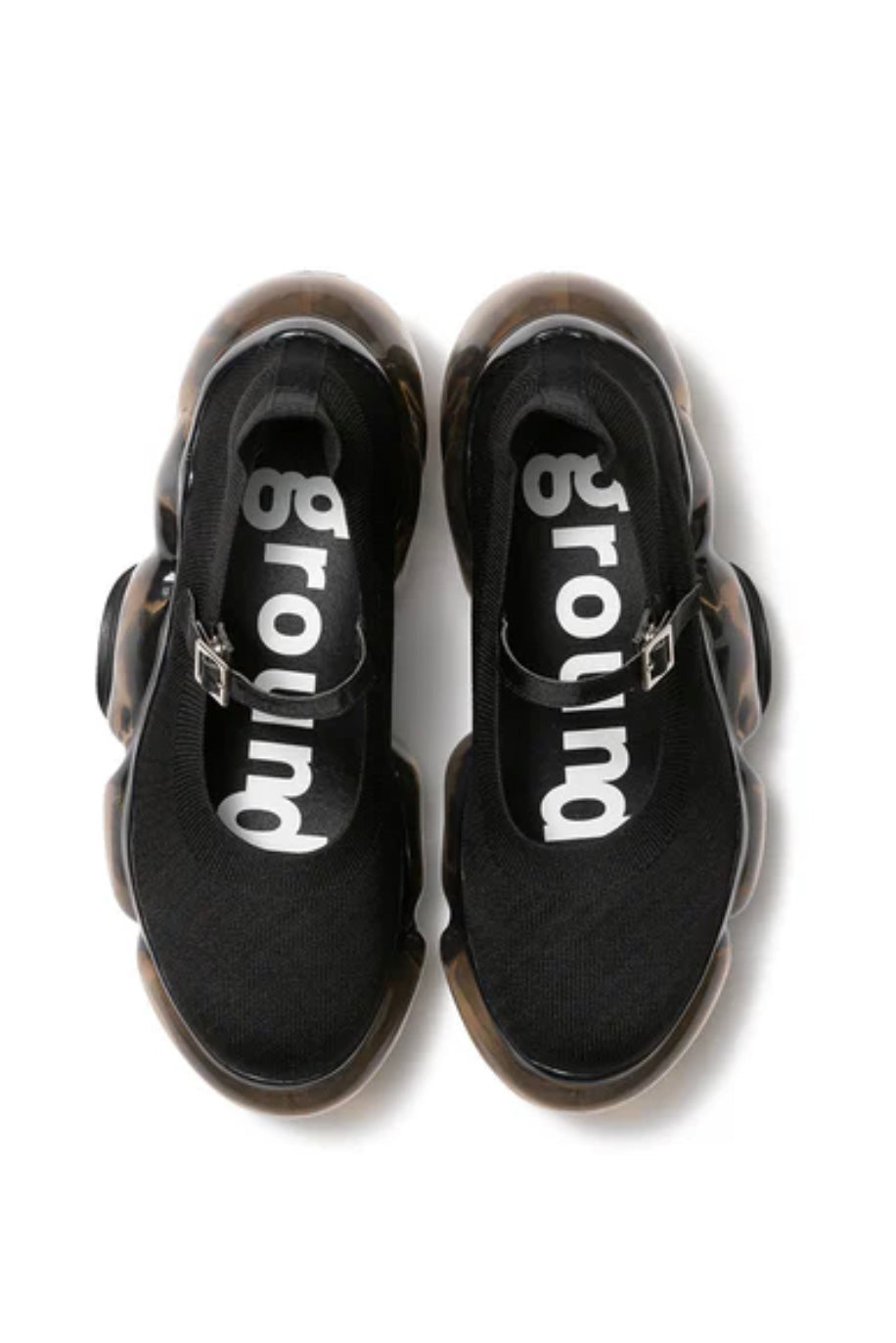 Grounds translates the pulse of Japanese youth into bold shoe design as seen with the Moopie Knit Pump Black / Black. Signature grounds colourway and Mary Jane style. The footwear looks as if you have stepped on something huge and gel-like