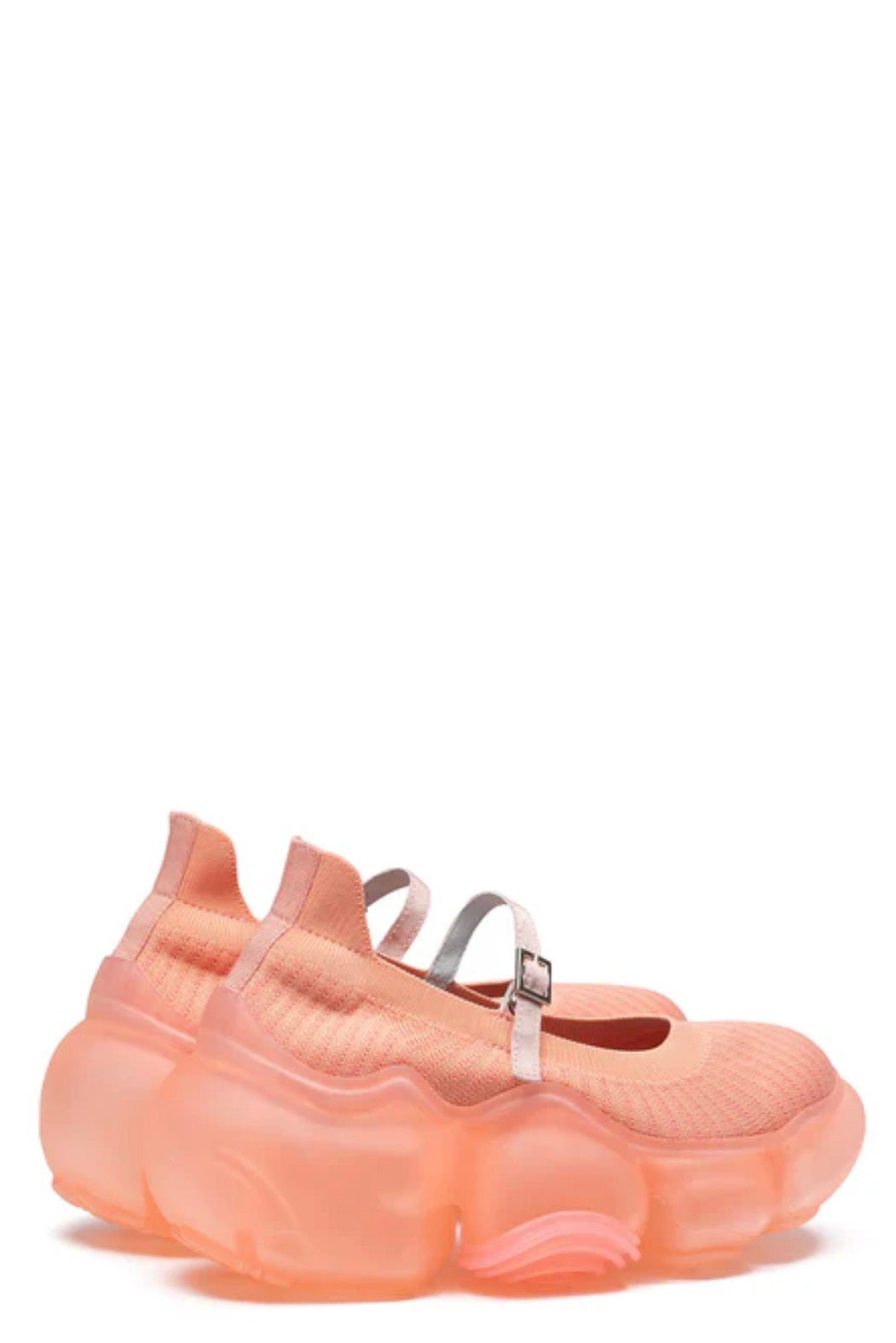 Grounds translates the pulse of Japanese youth into bold shoe design as seen with the Moopie Knit Pump Tropical Peach / Frost Pink. A fresh summer feel with a playful Mary Jane style. The footwear looks as if you have stepped on something huge and gel-like