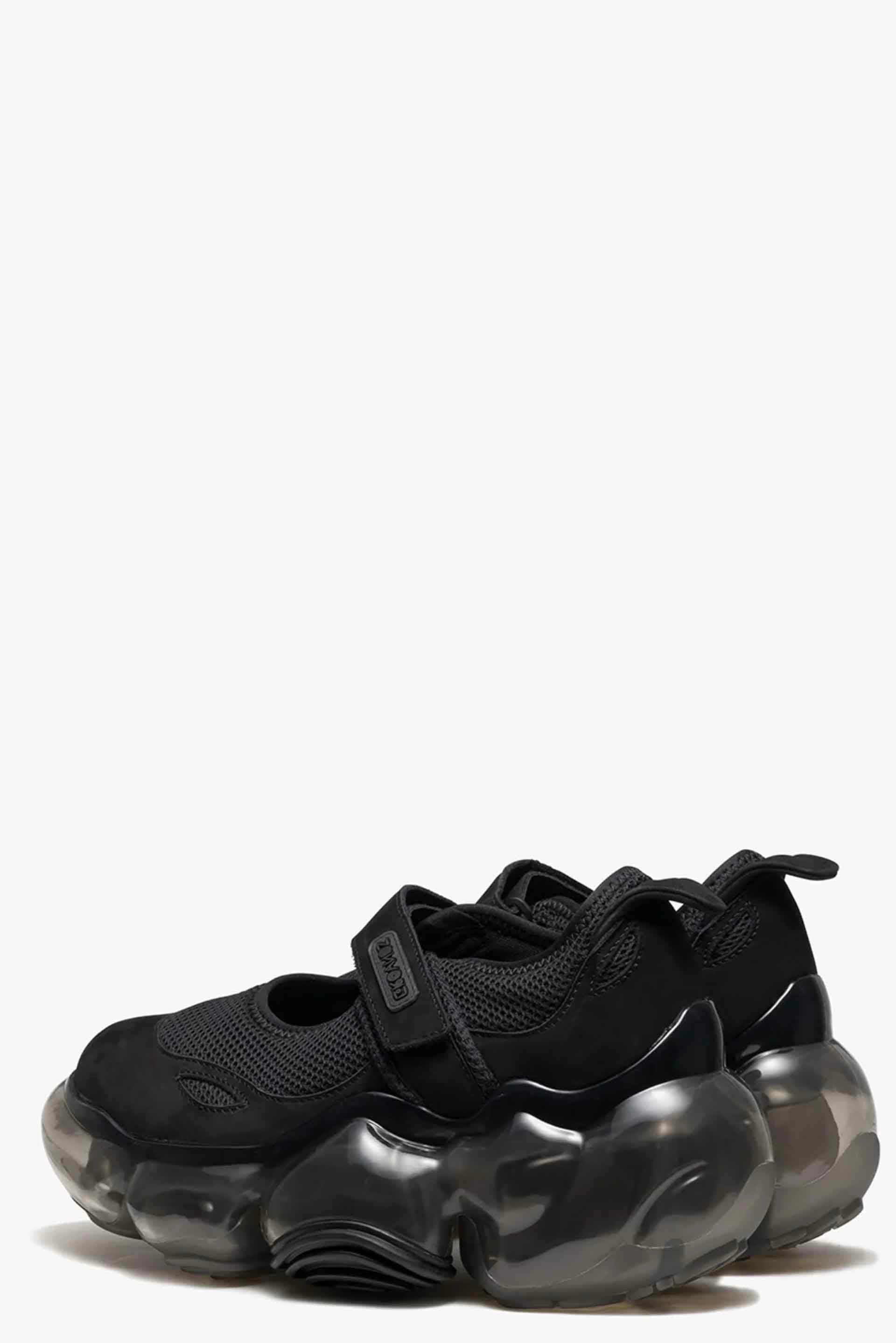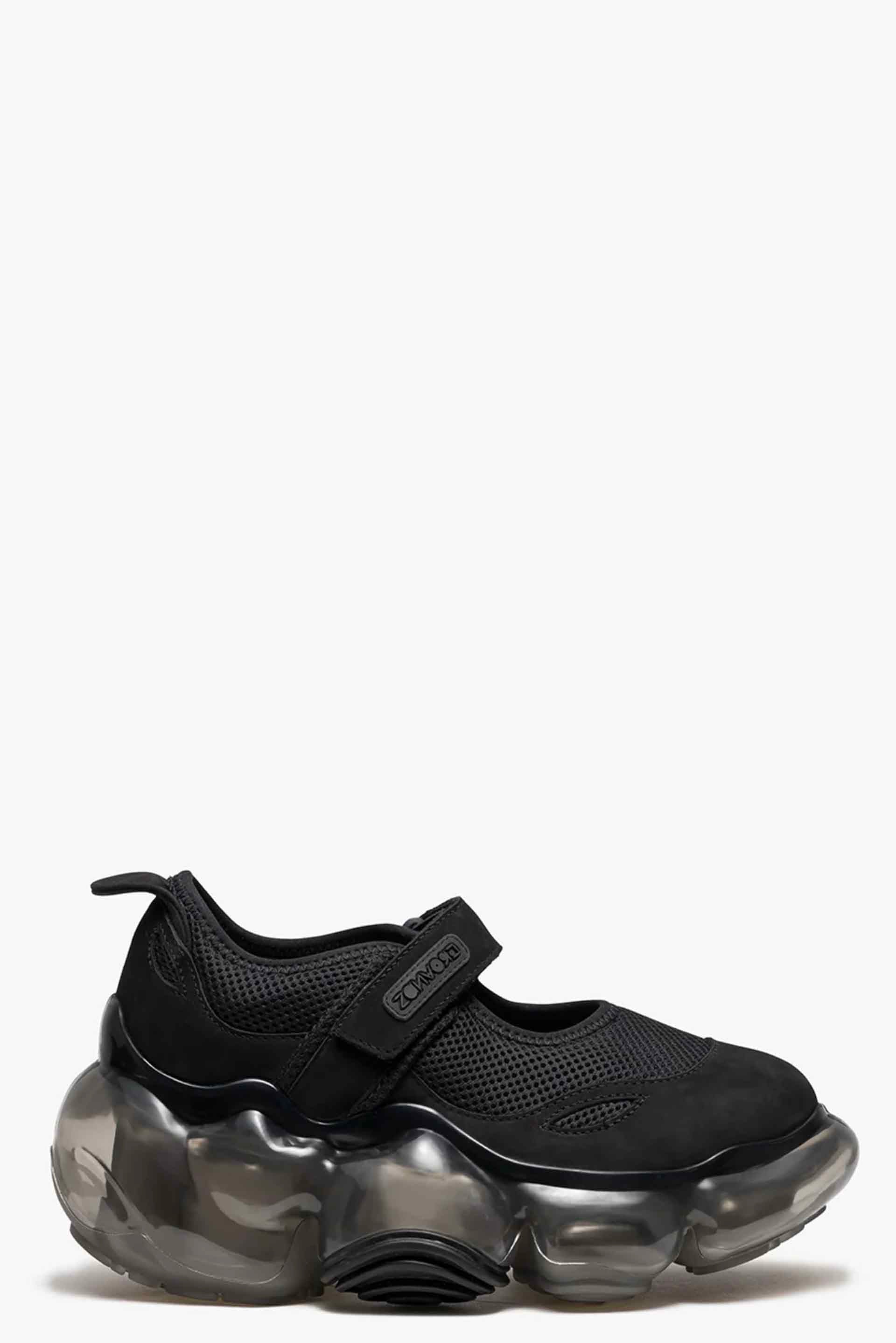 Grounds translates the pulse of Japanese youth into bold shoe design as seen with the Moopie Mary Jane Black Black. Footwear that looks as if you have stepped on something huge and gel-like. The outsole, which is supposed to be sturdy to support the entire body, is deliberately made to look fluid and soft, a design that tickles the playful spirit. The rubber parts on the outside add an accent to the design. The upper has a delicate finish in contrast to the voluminous soles. The sharp shape, the nape of the foot, and the gentle slope from the toe to the heel give the impression of an elegant and slender style that is not found in existing sneakers. The upper is a Mary Jane made of a combination of different materials.
