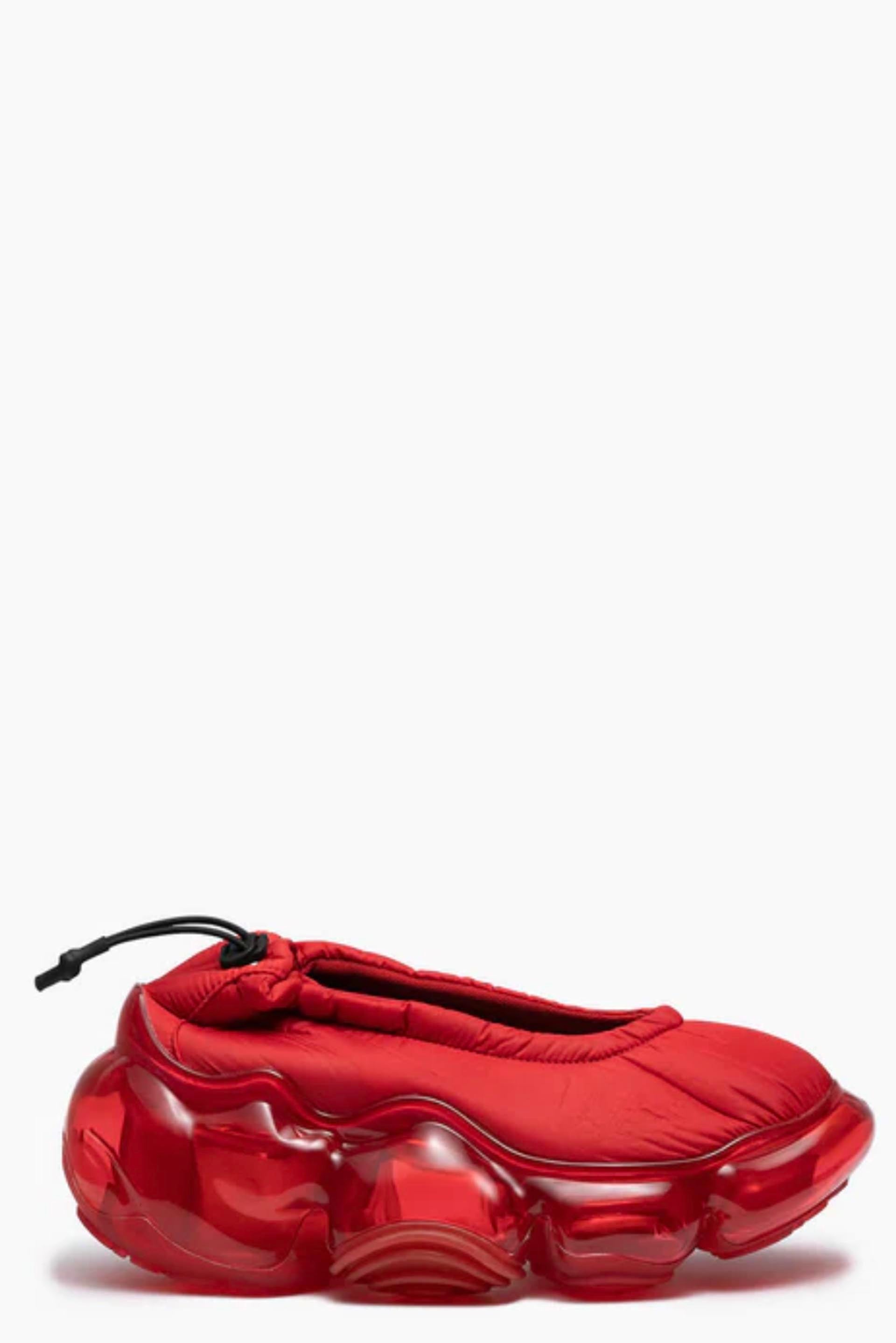 Footwear that looks as if you have stepped on something huge and gel-like. The outsole, which is supposed to be sturdy to support the entire body, is deliberately made to look fluid and soft, a design that tickles the playful spirit. The rubber parts on the outside add an accent to the design. The upper has a delicate finish in contrast to the voluminous soles.