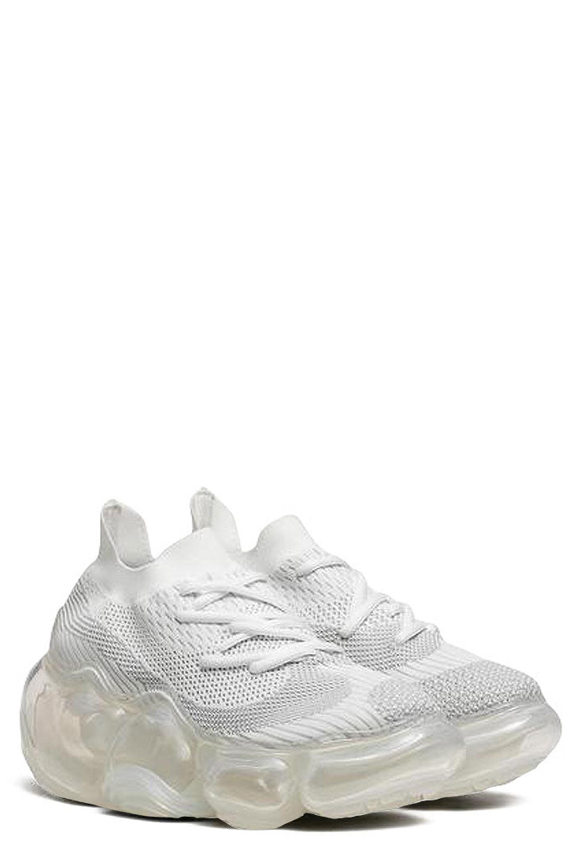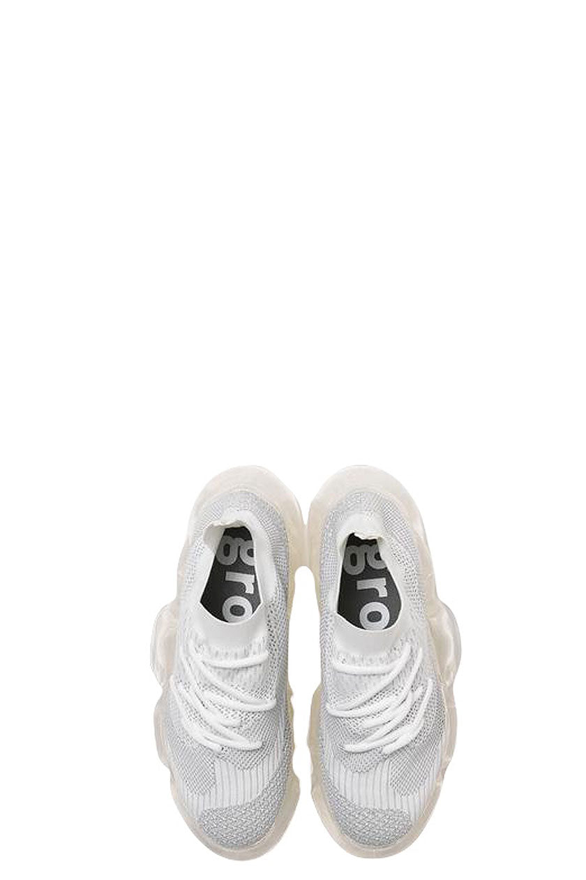 Grounds translates the pulse of Japanese youth into bold shoe design as seen with the Moopie White Gray Clear. Footwear that looks as if you have stepped on something huge and gel-like The outsole, which is supposed to be sturdy to support the entire body, is deliberately made to look fluid and soft, a design that tickles the playful spirit. The rubber parts on the outside add an accent to the design. The upper has a delicate finish in contrast to the voluminous soles. The sharp shape, the nape of the foot, and the gentle slope from the toe to the heel give the impression of an elegant and slender style that is not found in existing sneakers. The asymmetrical layout of the shoe holes and pattern on the knit upper is a continuation of the abstract design of the outsole. Despite the thick soles, the entire sole is designed to support the body and provide adequate cushioning to prevent walking fatigue.